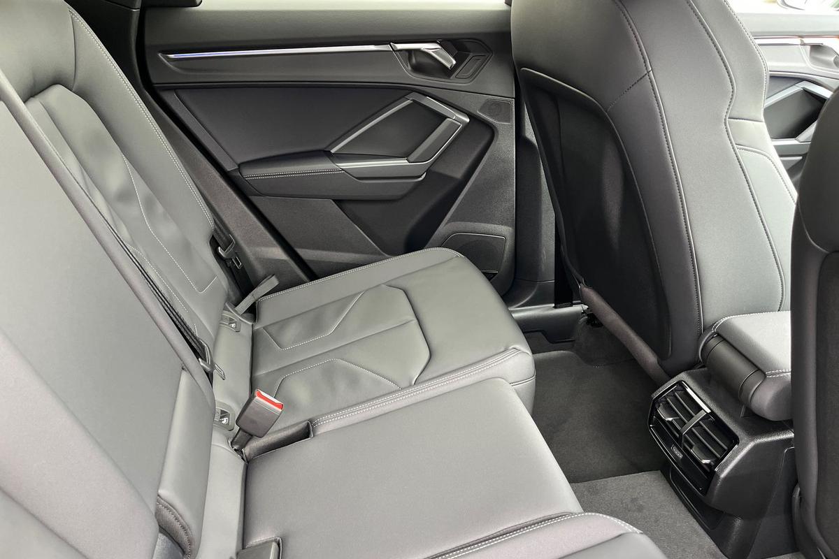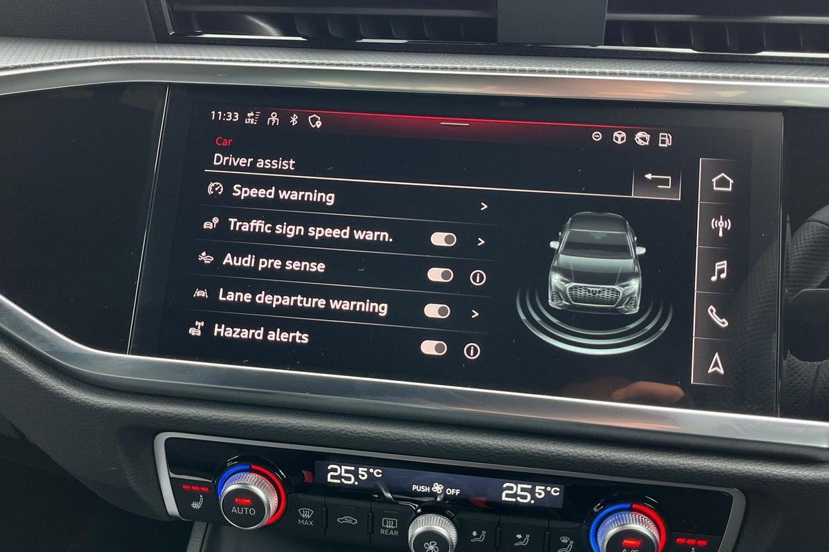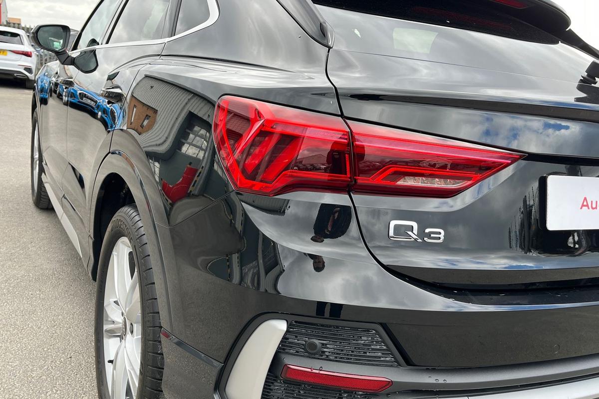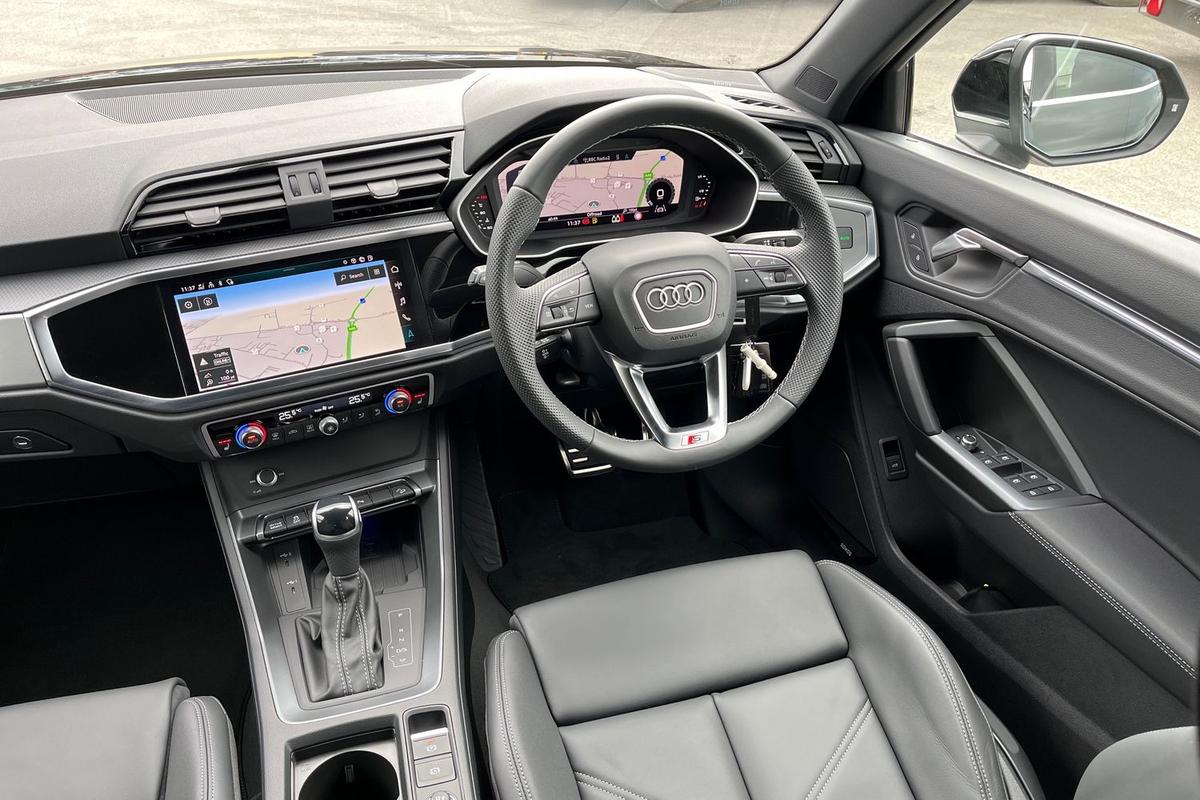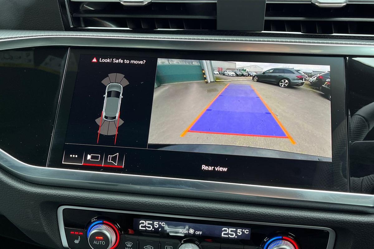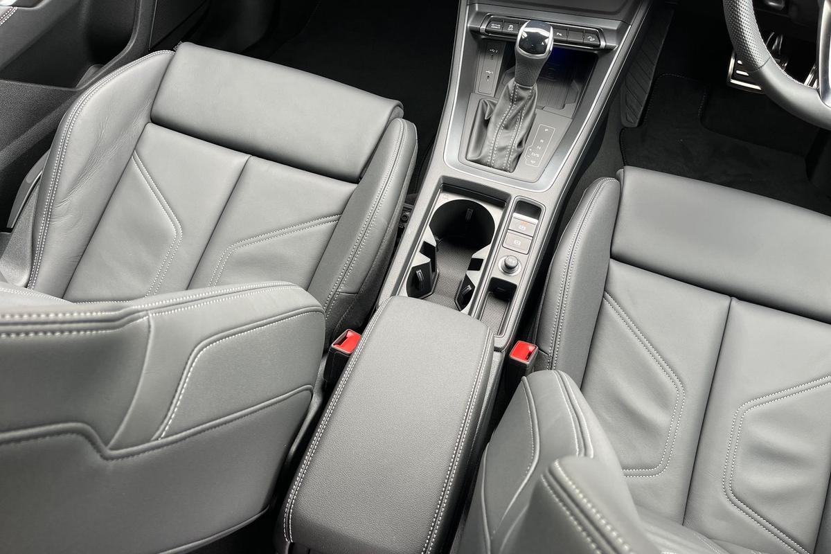"features": "Adaptive cruise control, Audi connect emergency call and service, Audi connect remote and controls, Audi drive select (Balanced/Individual, effeciency, comfort and dynamic), Audi virtual cockpit plus - 11.9\" display, Bluetooth interface, Camera based traffic sign recognition, Driver attention and fatigue monitor with driver monitoring, Front cross traffic assist, Lane departure warning with emergency assist, Panoramic curved display with 12.8\" MMI navigation plus and MMI touch, Park assist plus with parking system and 360 display, Phonebox light with wireless charging, Reversing camera, Smartphone interface includes wireless Apple carplay/Android Auto, Start/stop system, Swerve assist and turn assist, Traffic sign based speed limiter, Voice control system with natural language interaction, Comfort suspension, Petrol Particulate Filter, 2 USB-C ports with charge and data functions, Audi sound system with 10 loudspeakers, subwoofer,8 channel amplifier with 260 watts, DAB digital radio module, Acoustic glass for front door windows, Acoustic windscreen, Aluminium roof rails, Aluminium window trim, Audi Q3 lettering on the B-pillars, Auto dimming door mirrors, Auto dimming rear view mirror, Body colour door mirrors, Contrasting finish in volcano grey, Electrically folding, adjustable and heated door mirrors with integrated LED side indicators and kerb view function for passenger side, Full paint finish, Illuminated door sills with aluminium inserts at the front with S logo, LED daytime running lights, LED headlights plus with LED rear lights pro with continous light strip,illuminated Audi rings, rear, LED third brake light, Loading sill protector in stainless steel, Main beam assist, Privacy glass - dark tinted rear window, rear door and side windows, Projection light in the exterior mirrors - Projects a graphic element onto the ground, Q3 badging on the rear, Rain and light sensors, Rear side wing doors, Rear window, rear door windows and rear side windows in clear glass, Rear wiper, Sports bumpers, 3 seat bench in 2nd row, 3 spoke flat top and bottomed leather multi function sport steering wheel with gear shift paddles and \"S\" badging, 3-zone deluxe automatic air conditioning, 4 way lumbar support for the front seats - electric with horizontal and vertical adjustment in four directions, Black cloth headlining, Front and rear floor mats, Front and rear headrests, Front centre armrest, Heated front seats, Height and reach adjustable steering wheel, Interior storage compartment, Leather/artificial leather upholstery combination with S emblem + front sports seats, Luggage compartment lid, electrically opening and closing, Manual front seats with height adjustment, Rear seat bench plus with split folded 40:20:40, Single front passenger seat, Stainless steel pedals, Steering wheel operating unit, gloss black, Storage compartment in front centre console, Ambient lighting package pro - Q3, S line exterior styling pack - Q3, 3x3 point rear seatbelts, Convenience key with safelock, Driver and front passenger airbag with passenger airbag deactivation, Electromechanical parking brake, Electronic stabilisation control including ABS, ASR and EDL, First aid kit with warning triangle and high visibility vests, Front emergency brake assist, Hill hold assist, i - Size child seat mounting on the front passenger side and i - Size and top tether on the outer rear seats, Power operated child locks, Seatbelt monitoring, Three point automatic belts with belt tensioner and height adjustment, Tyre pressure loss indicator, Anti theft wheel bolts, Remote central locking, Thatcham approved category 1 anti theft alarm, Dark aluminium divergence inlay, Interior elements in dinamica microfibre, Interior trims in aluminium look, Tool kit and Jack, ",