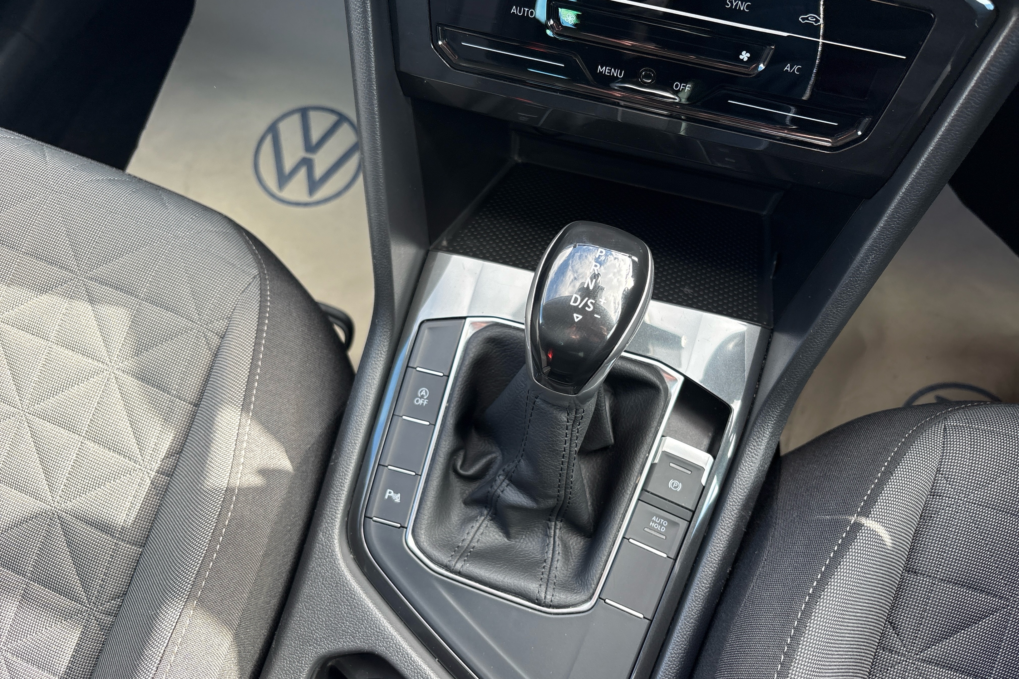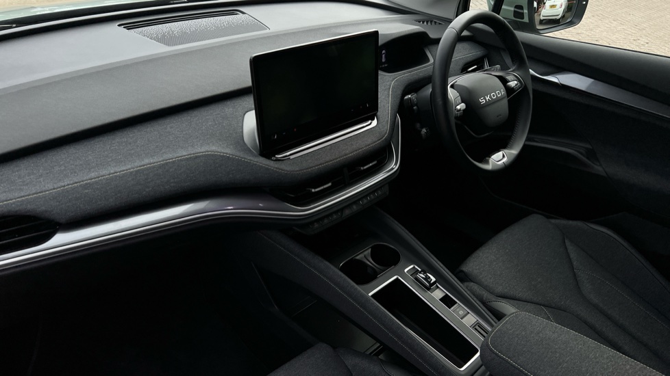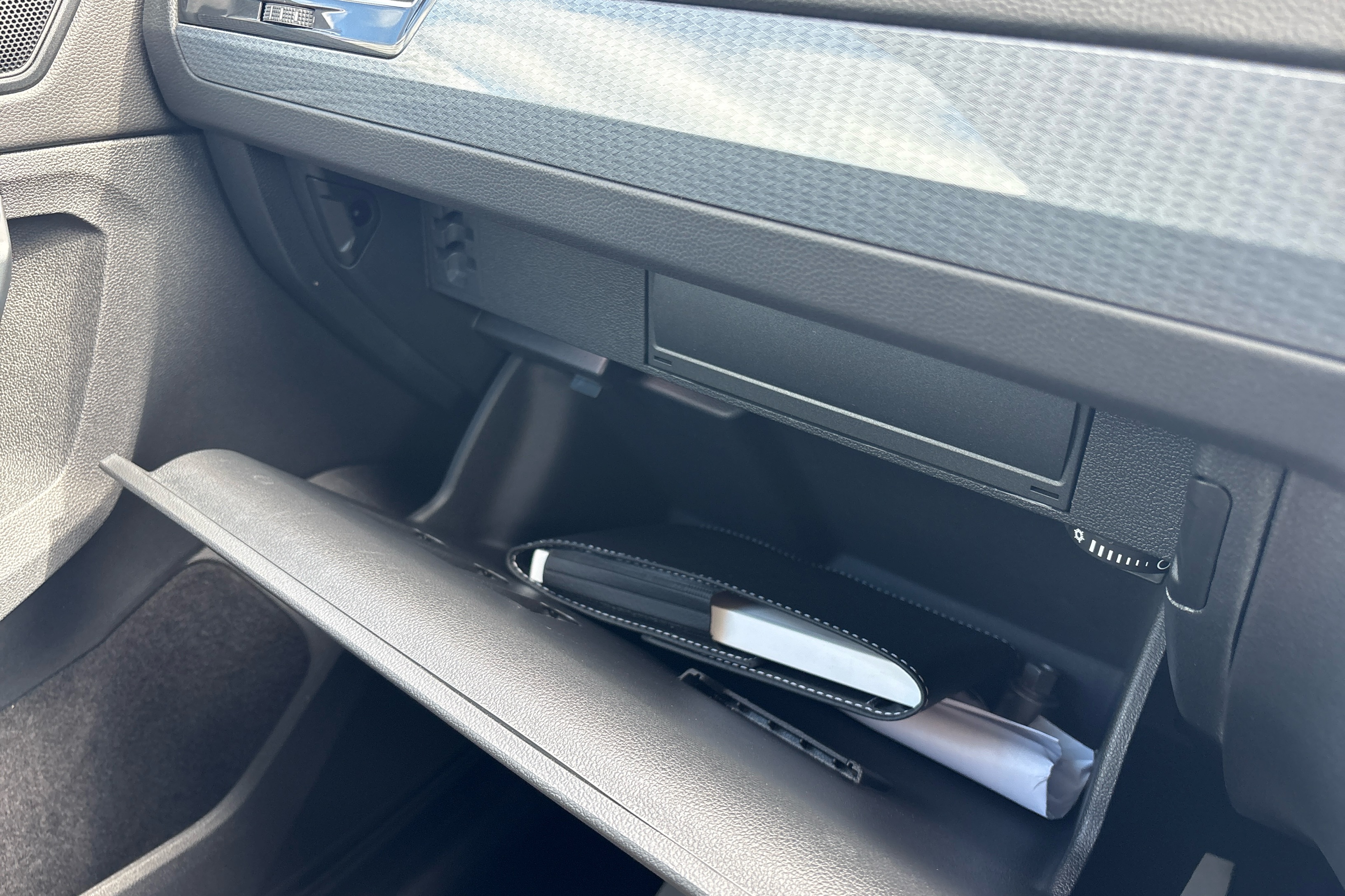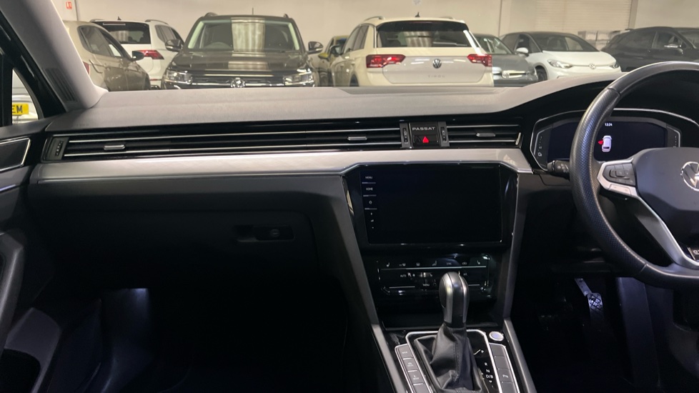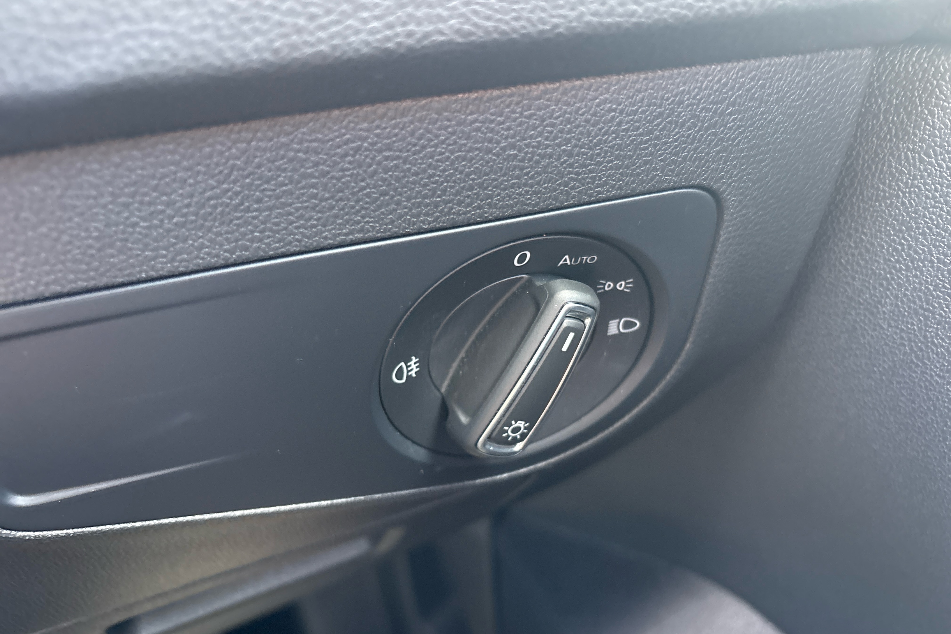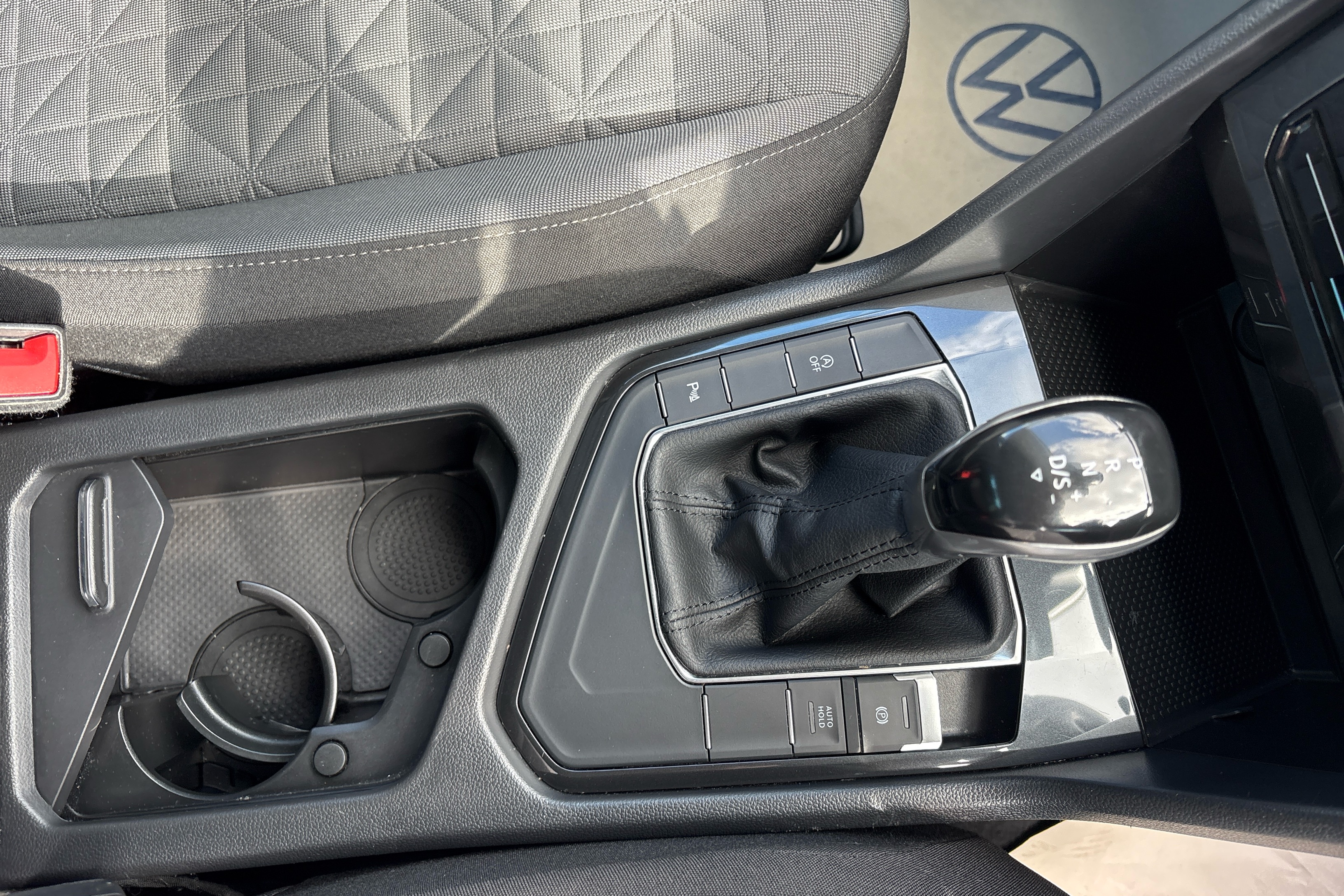 "Black dashboard with contrast stitching",