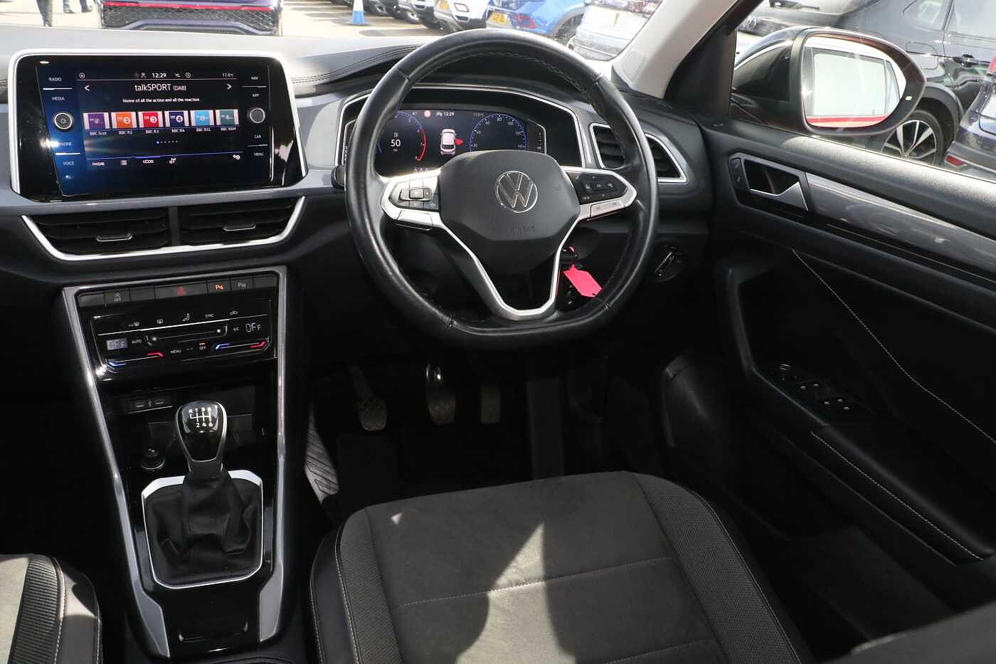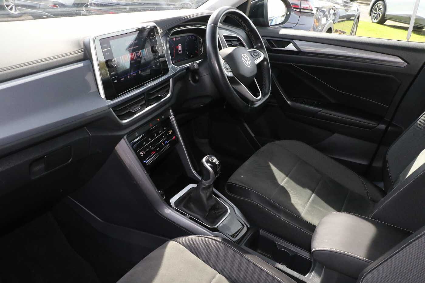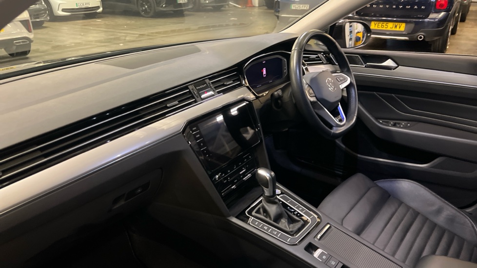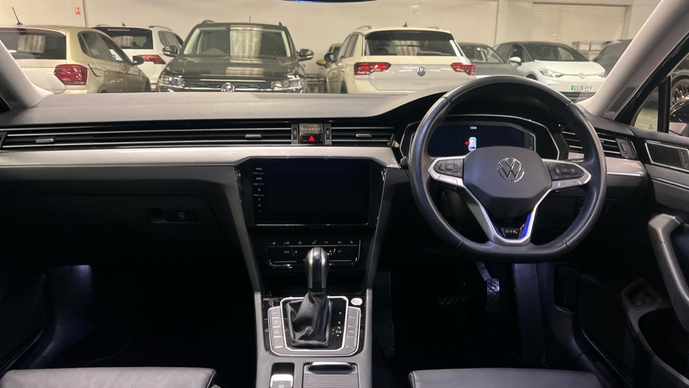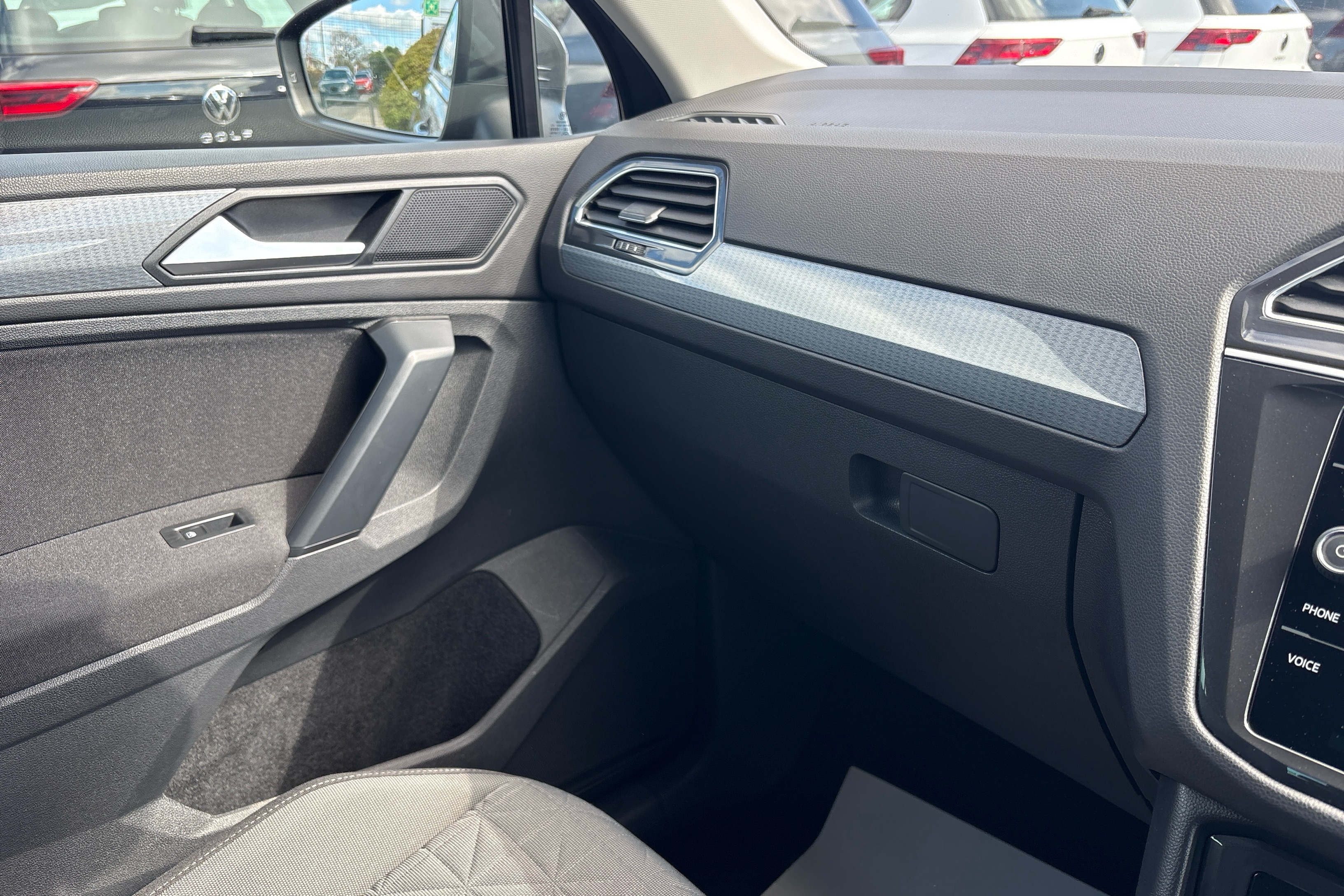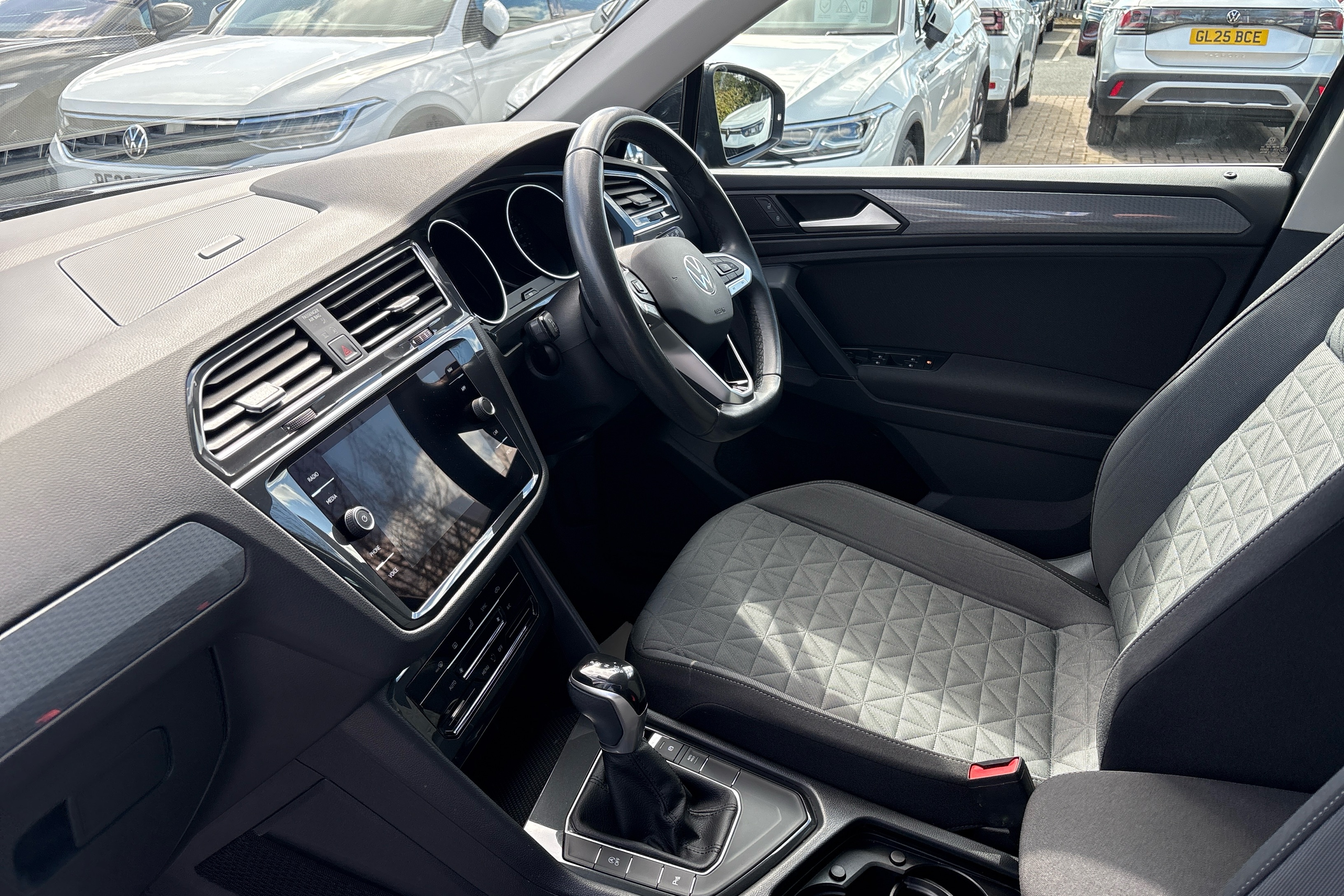 "Black dashboard with contrast stitching",