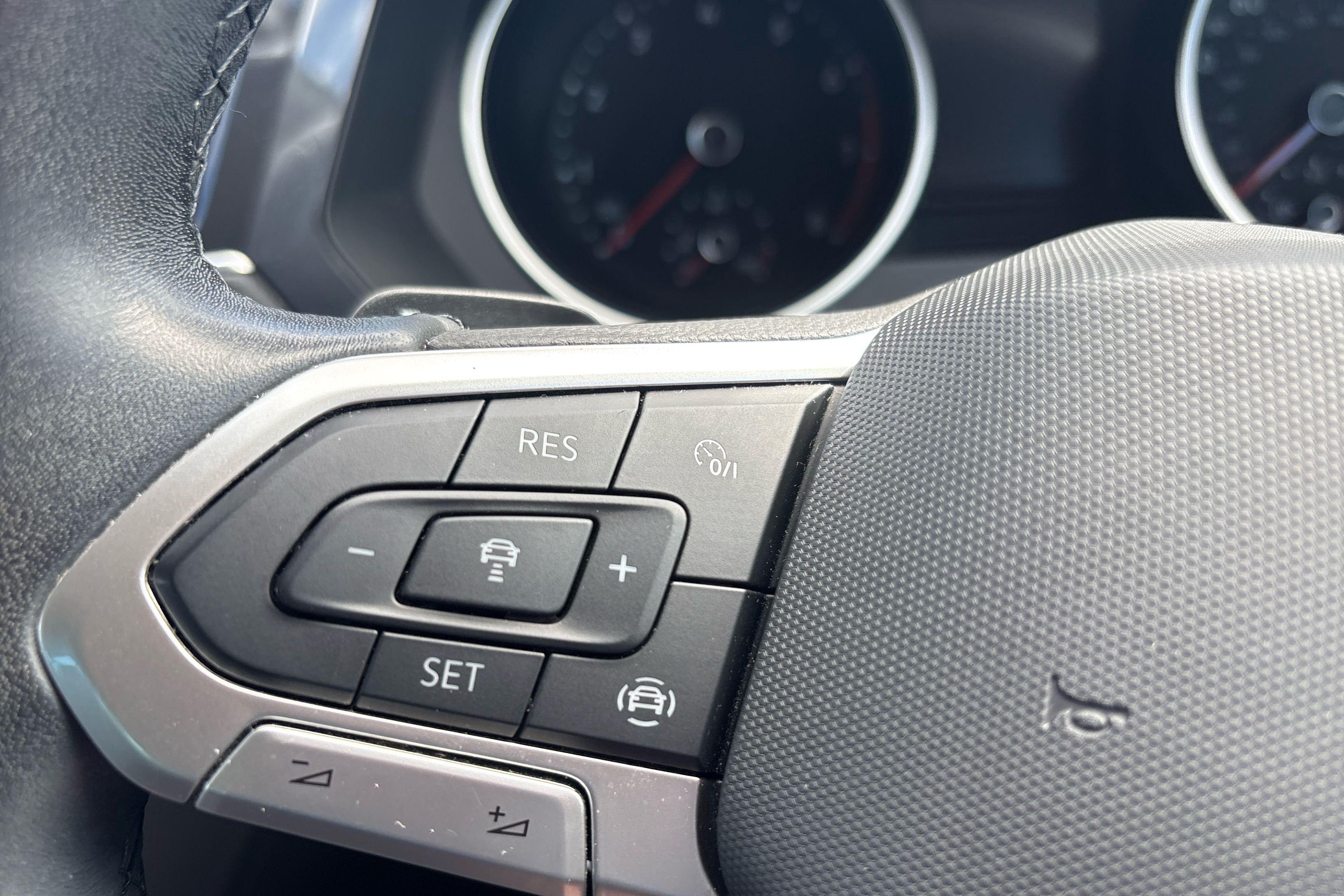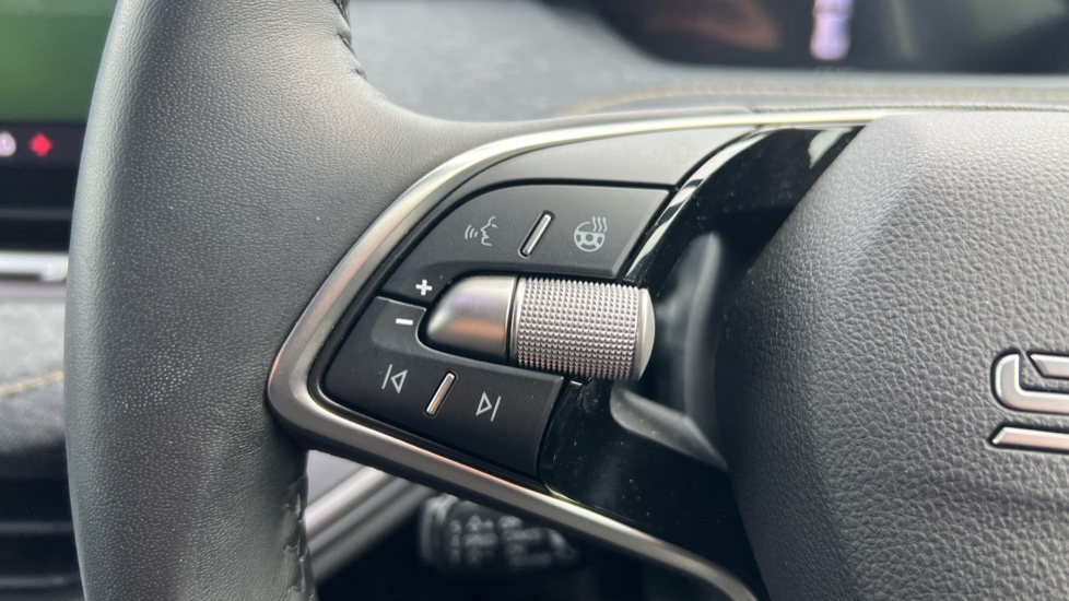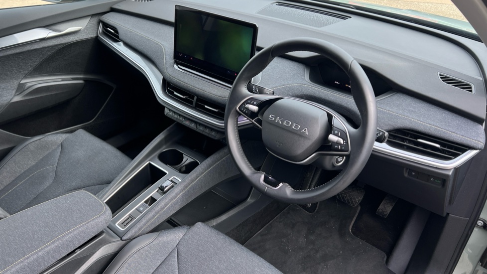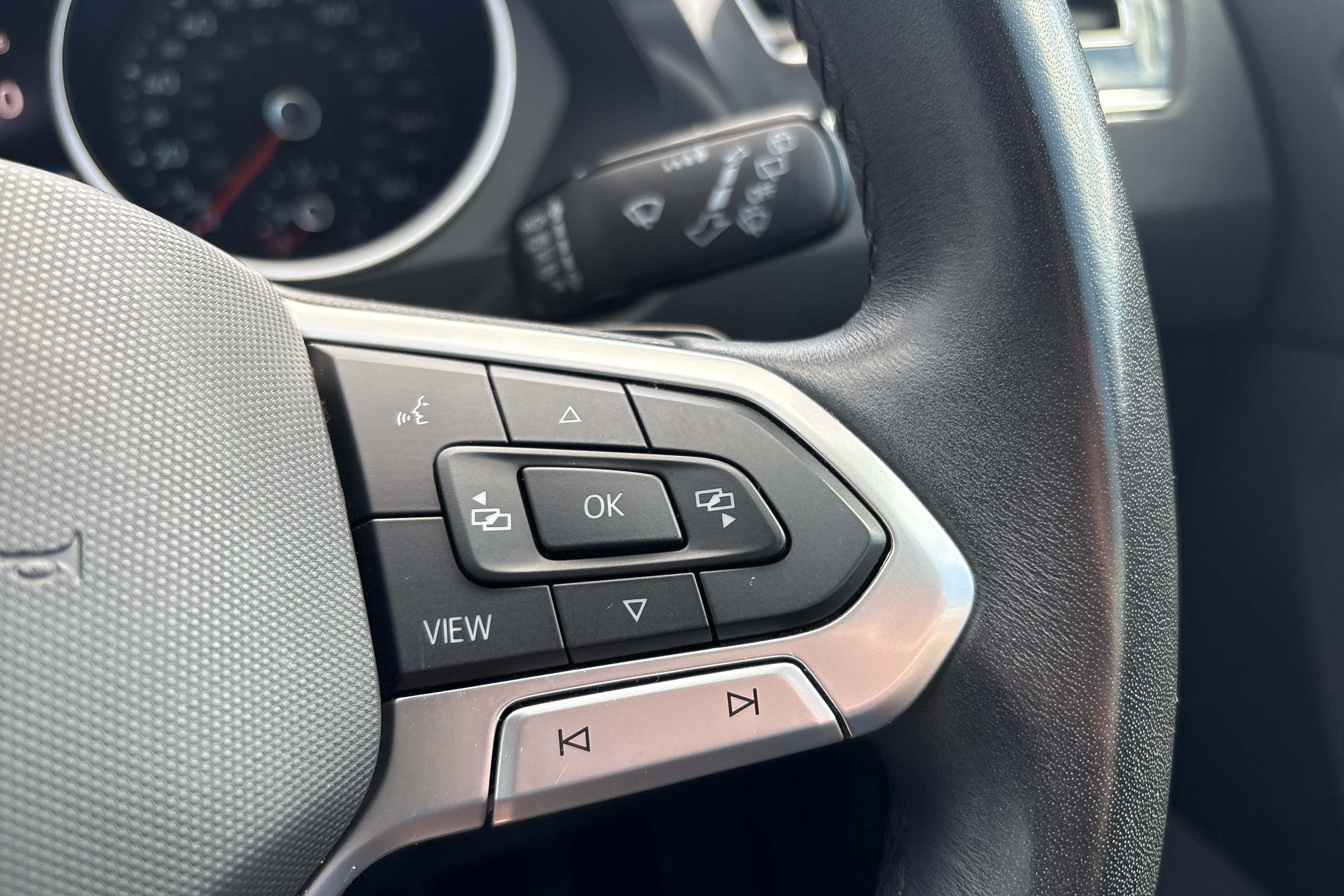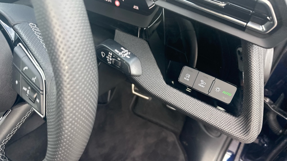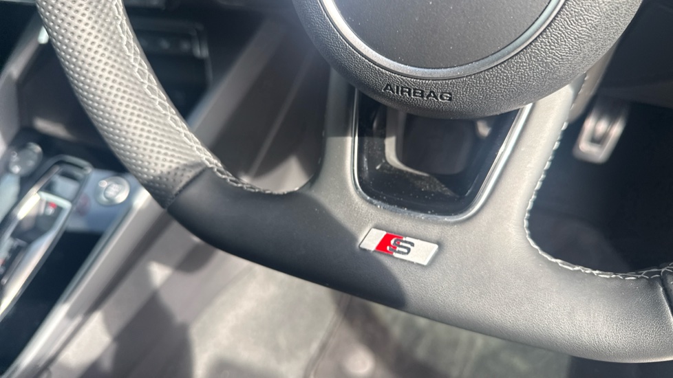 "3 spoke leather steering wheel with multi-function buttons with touch control, flattened on top and bottom, with S badging and contrast stitching",