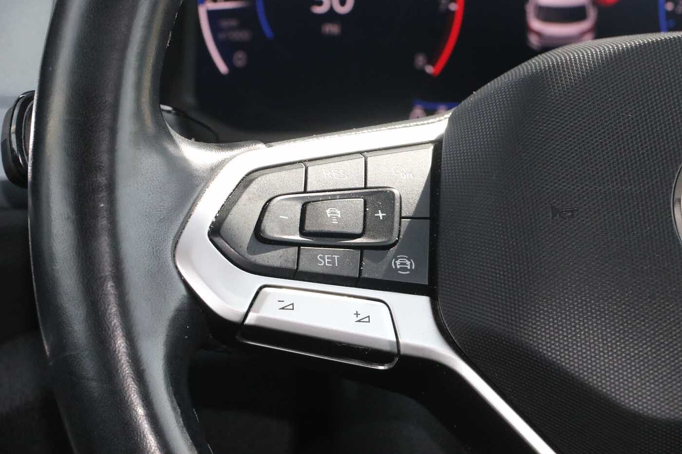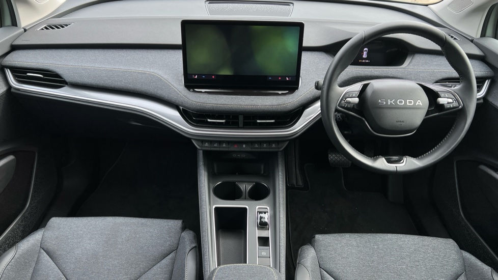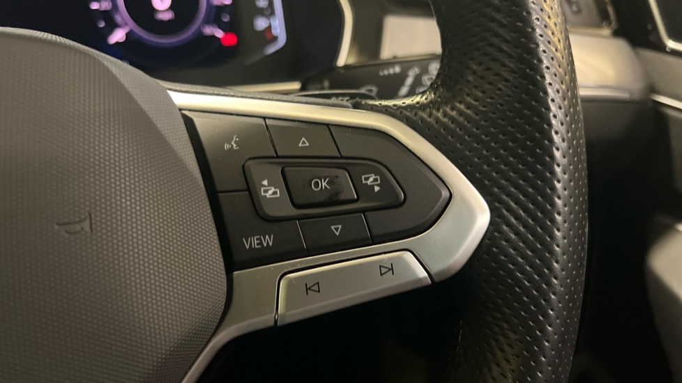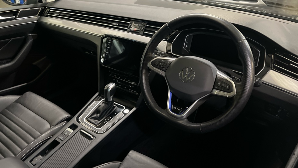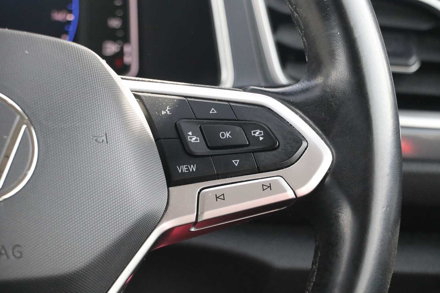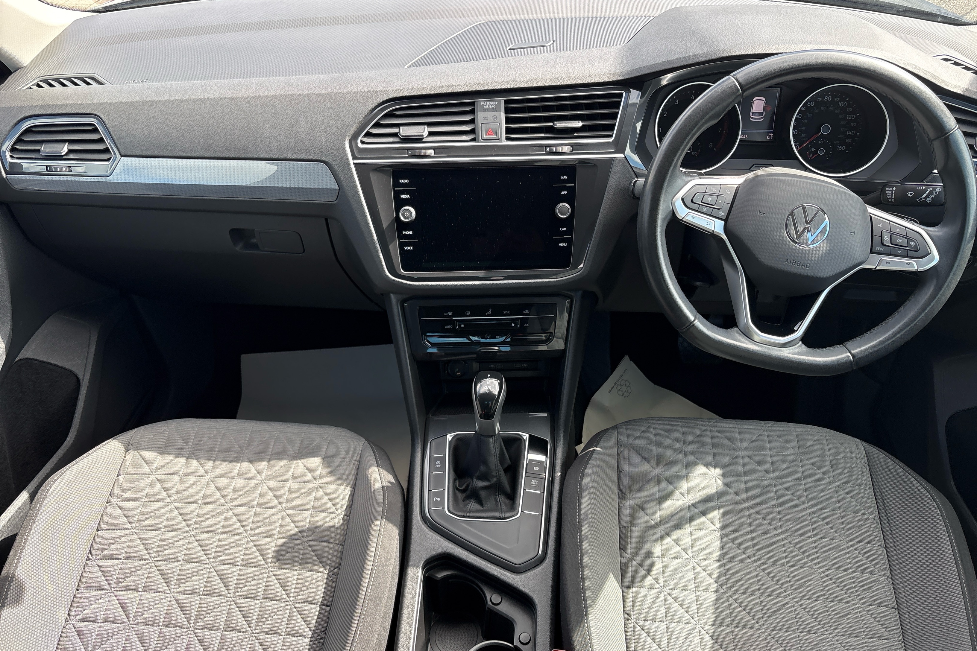 "3 spoke leather steering wheel with multi-function buttons with touch control, flattened on top and bottom, with S badging and contrast stitching",