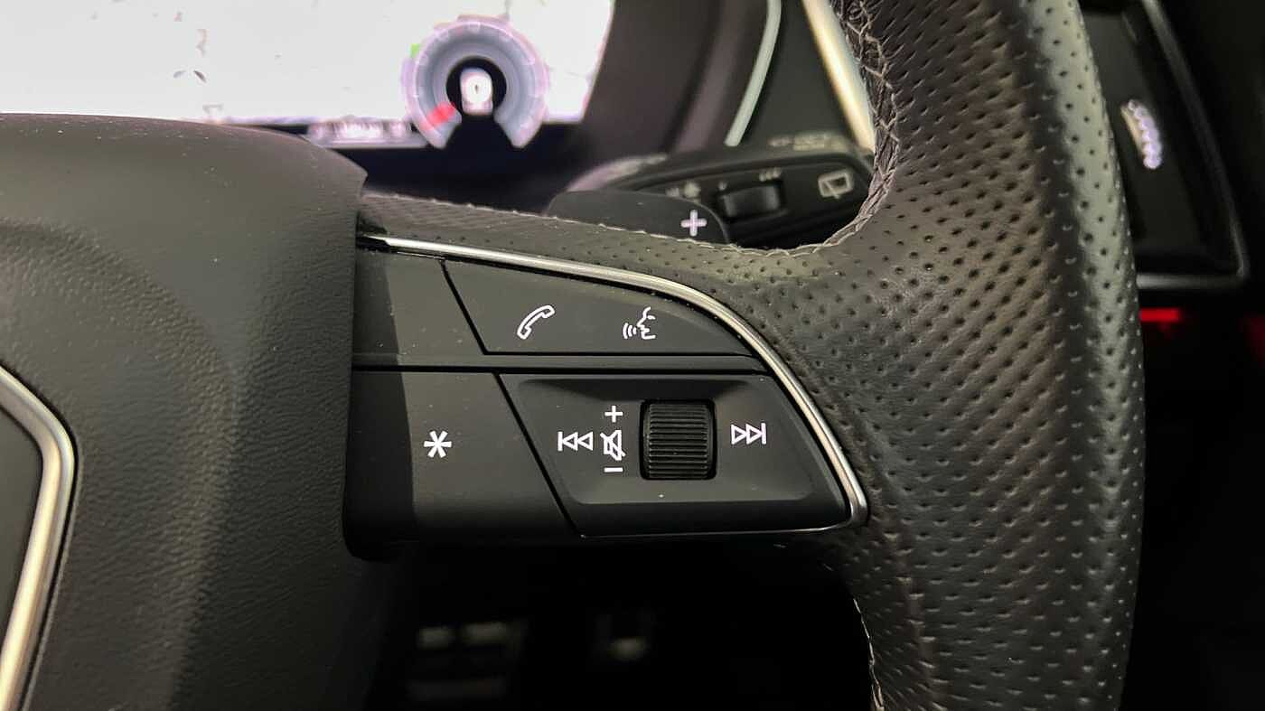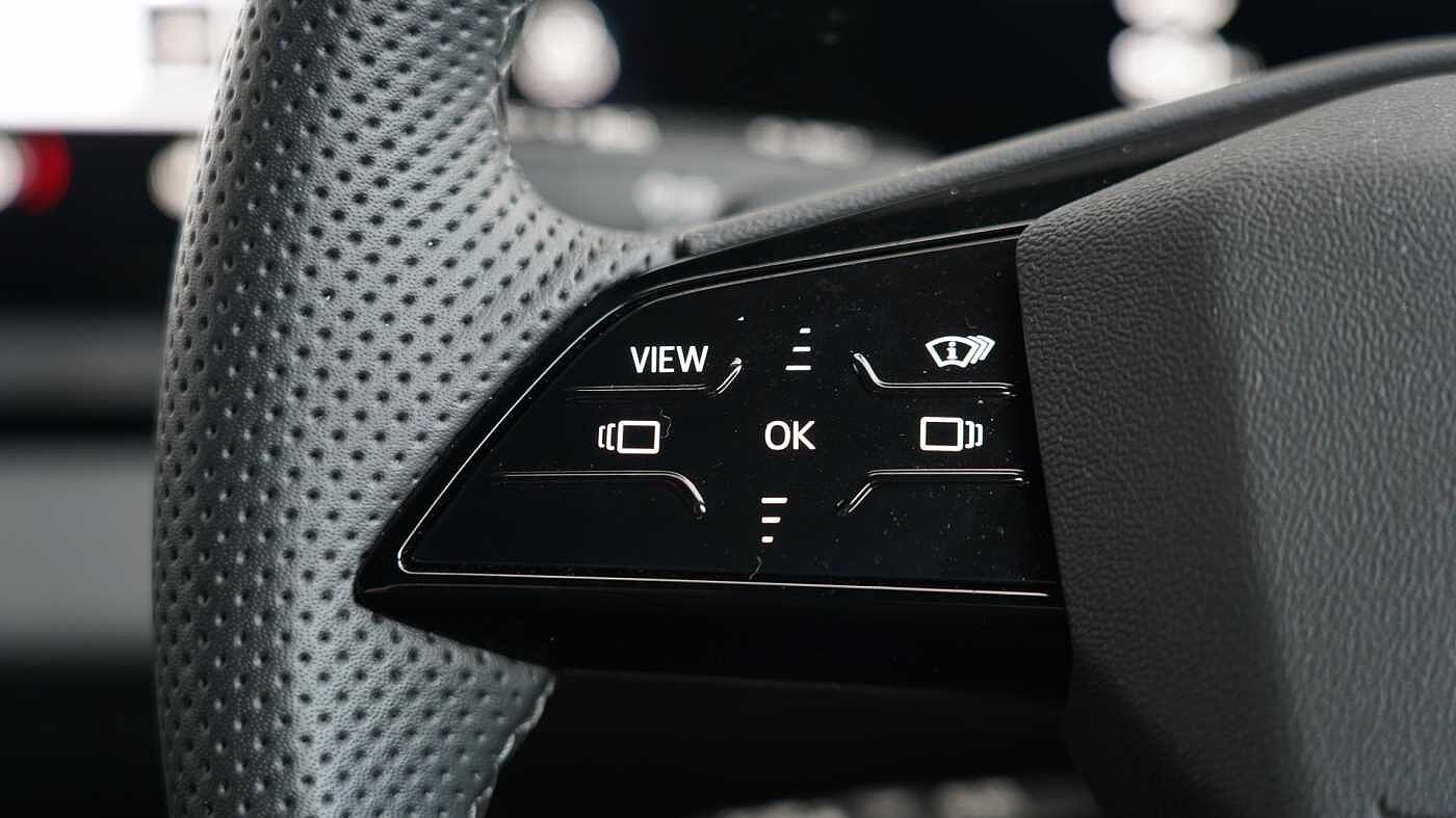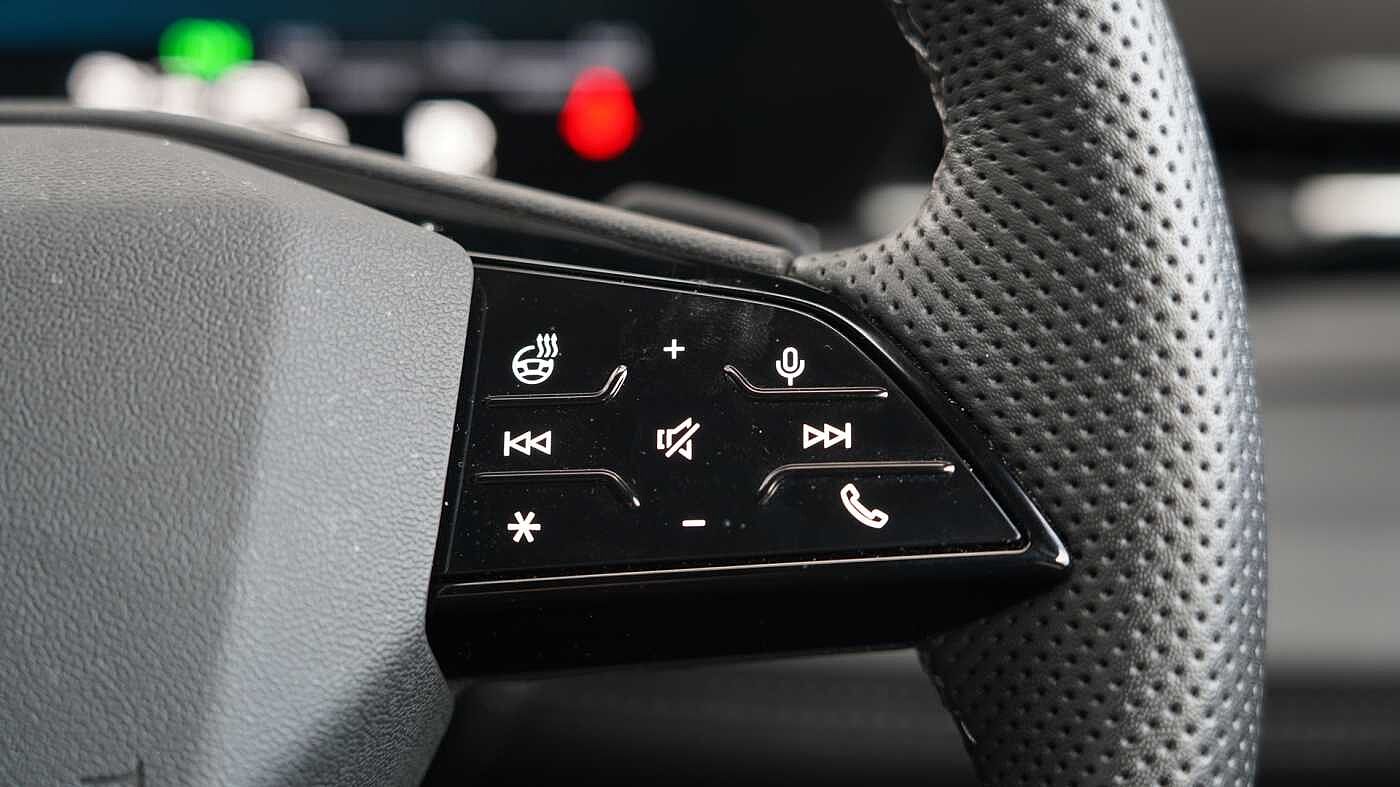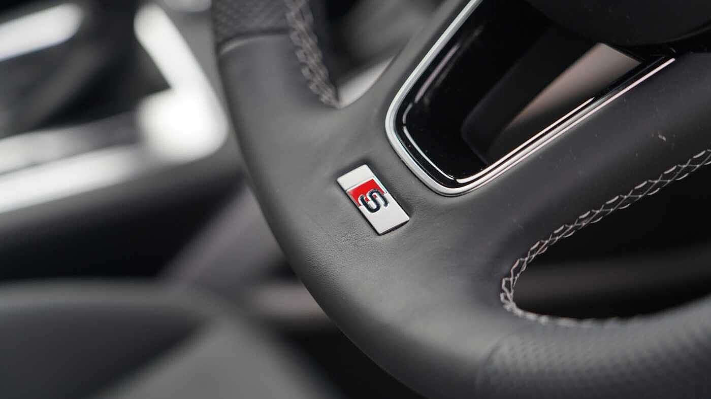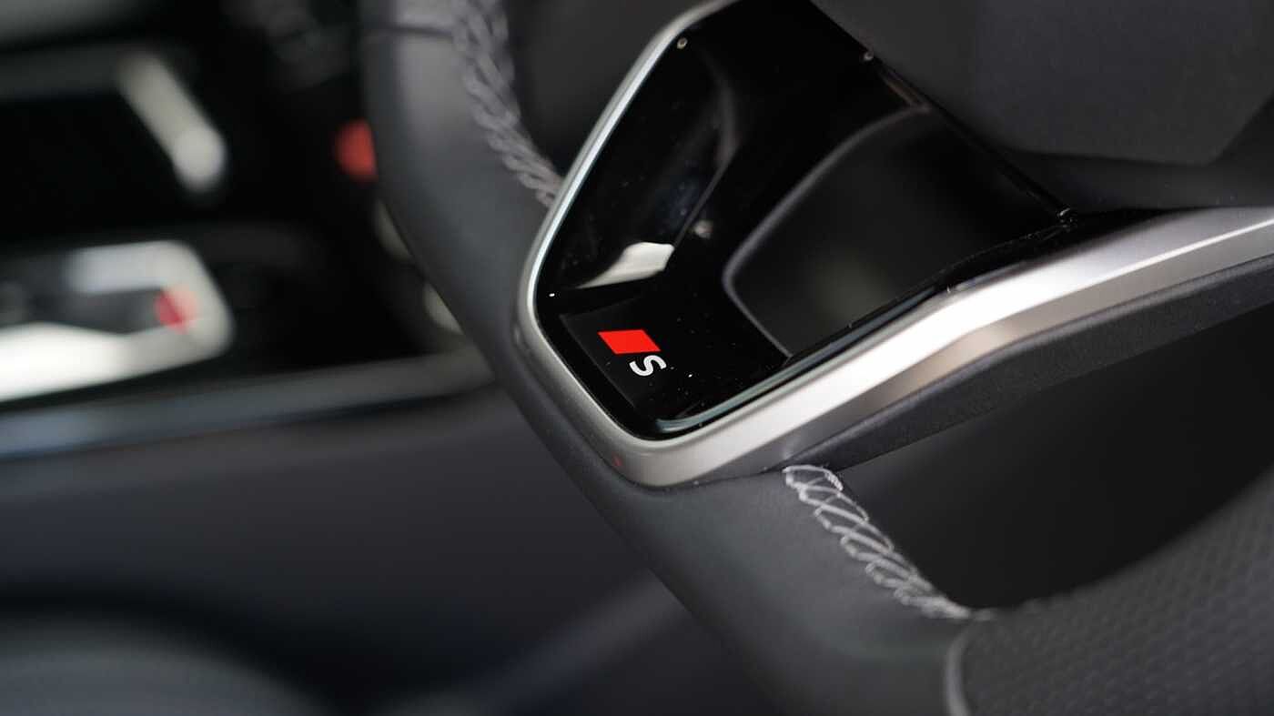 "3 spoke flat bottomed multi-function plus leather steering wheel with S badging, grips in preforated leather, contrast stitching and paddle shift",