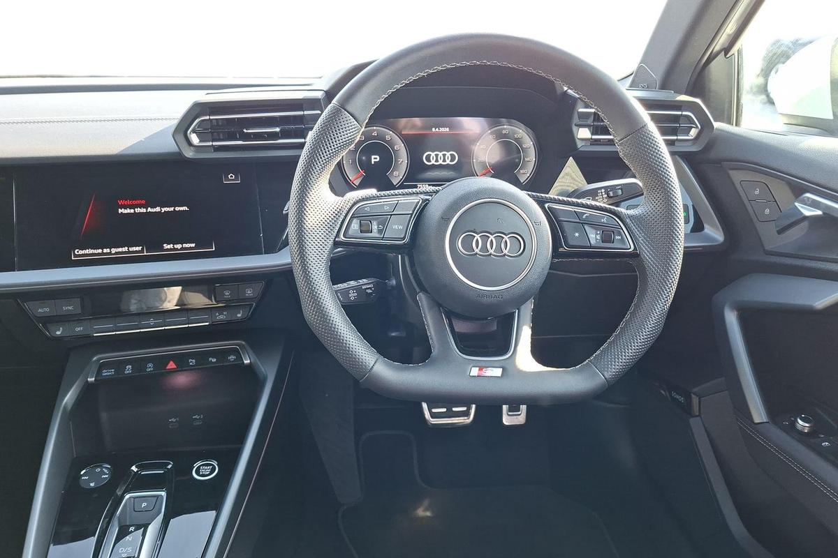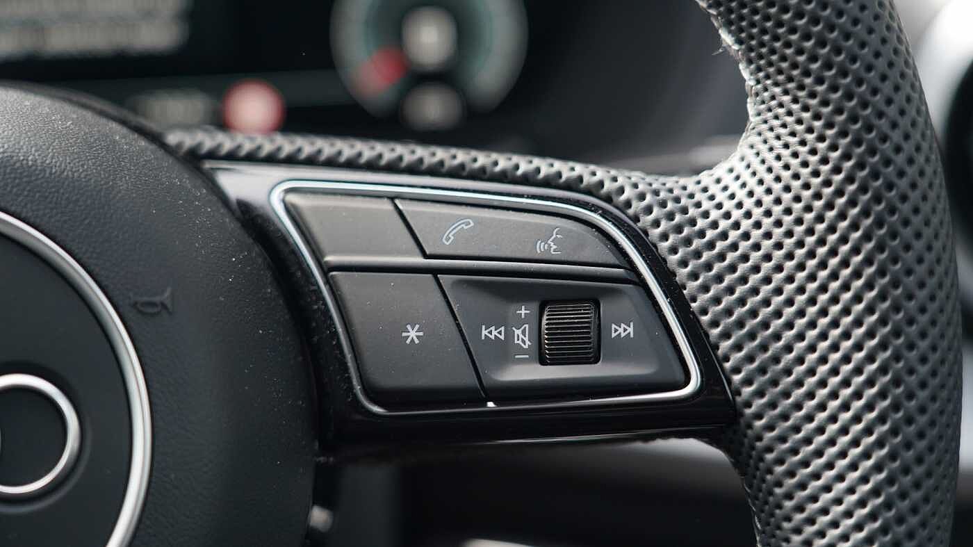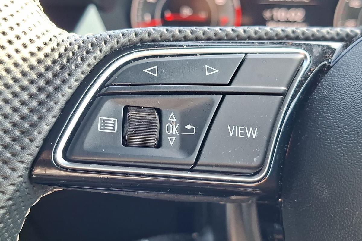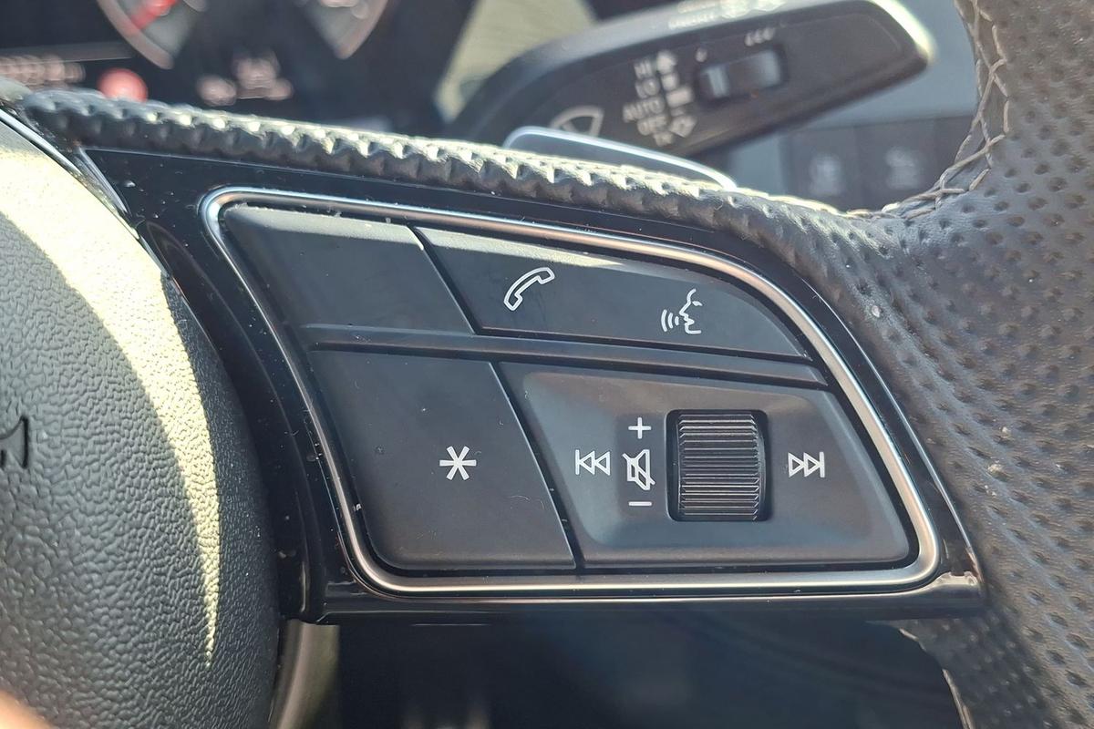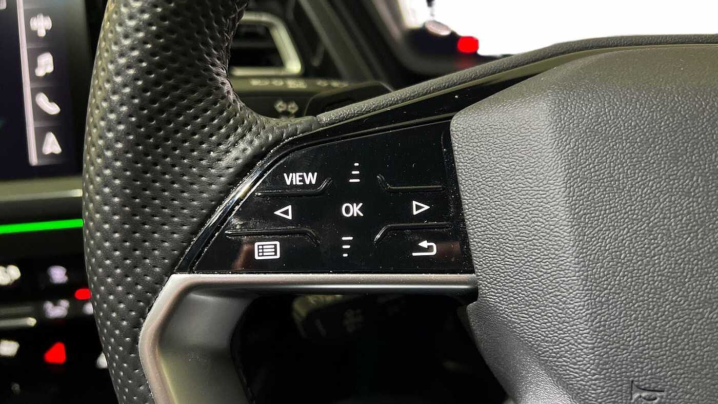 "3 spoke flat bottomed multi-function plus leather steering wheel with S badging, grips in preforated leather, contrast stitching and paddle shift",
