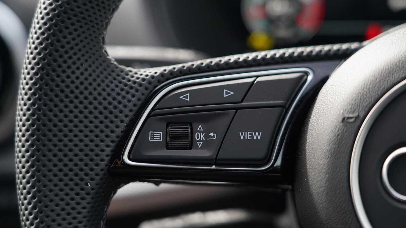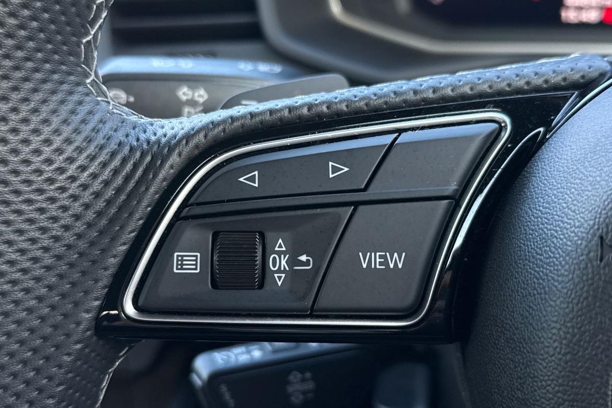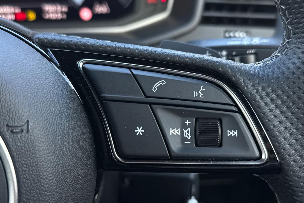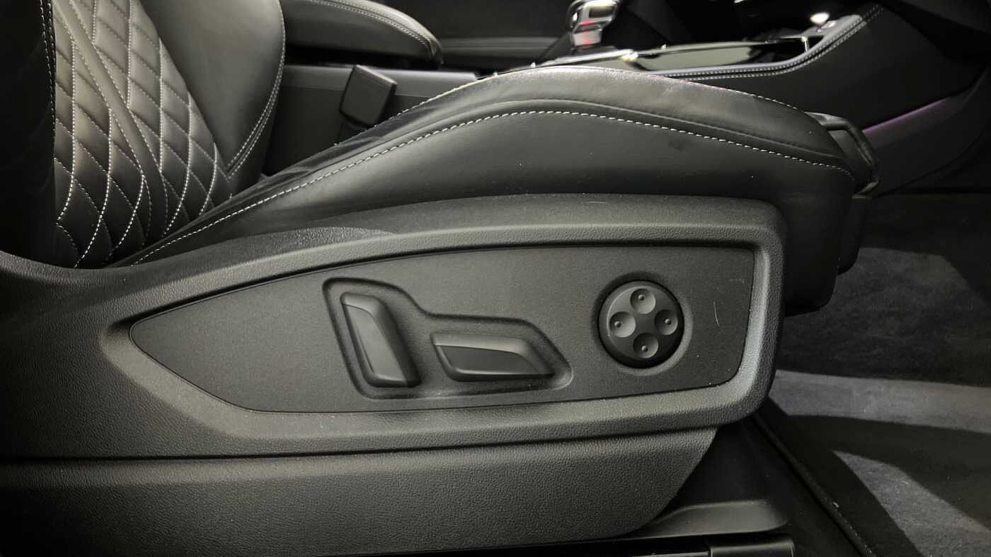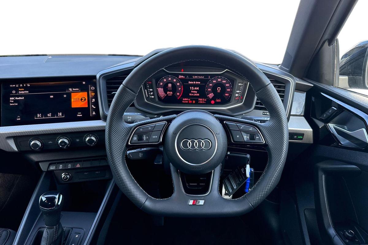 "3 spoke flat bottomed multi-function plus leather steering wheel with S badging, grips in preforated leather, contrast stitching and paddle shift",
