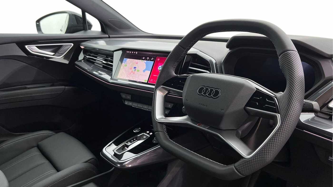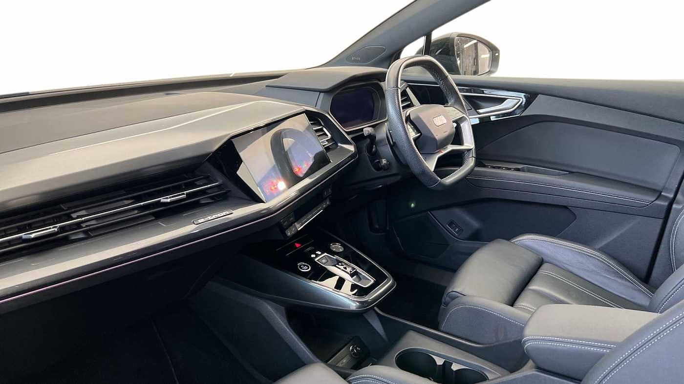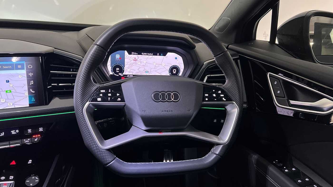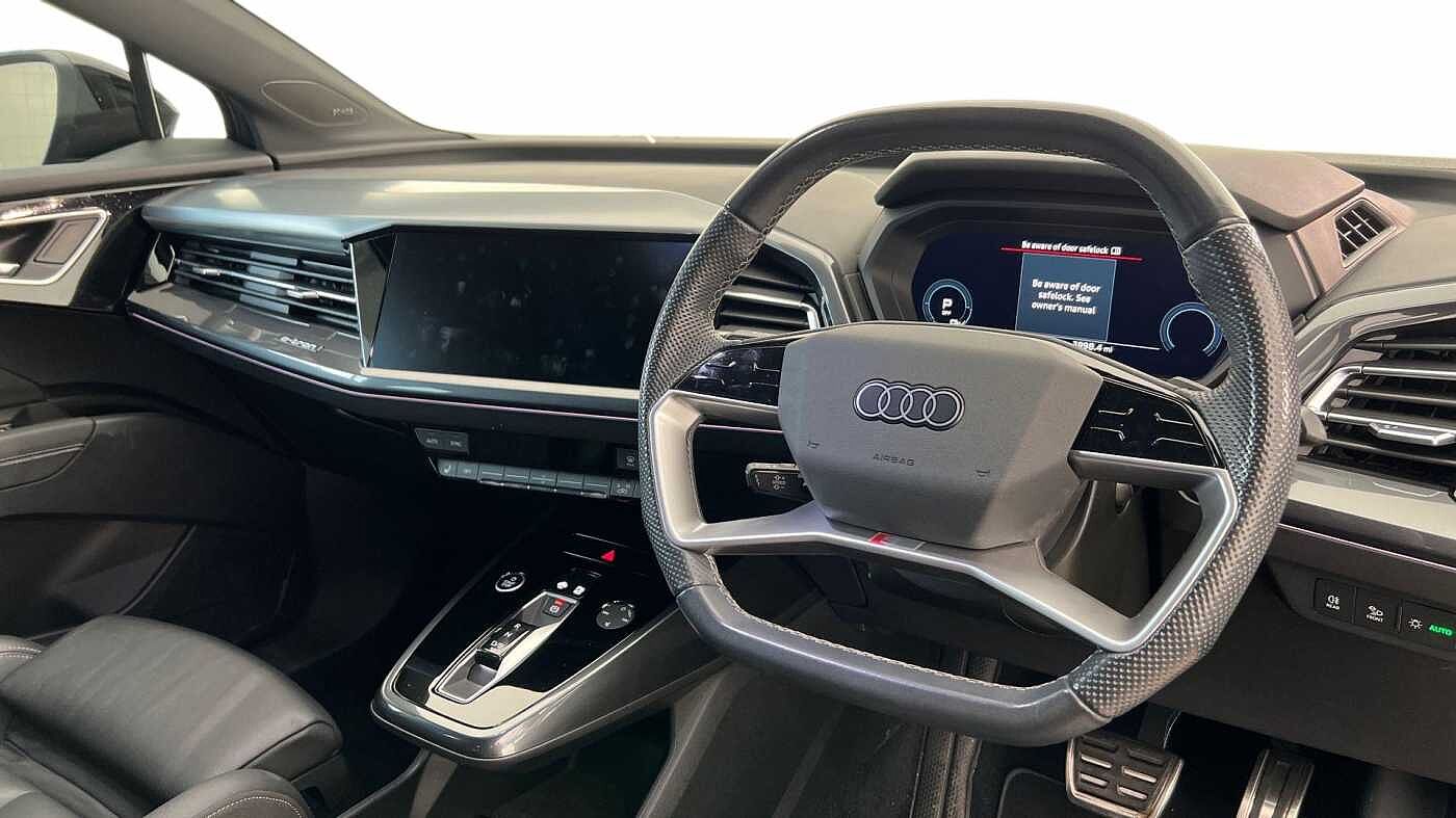 "features": "Adaptive cruise control with speed limiter, Advanced driver attention and drowsiness monitor, Audi application store, Audi connect safety and service (e-call), Audi drive select, Audi smartphone interface, Audi Virtual Cockpit - 10.25\" display, Bluetooth interface, Camera based traffic sign recognition, Lane departure warning including emergency assist, MMI Navigation Plus with high resolution 11.6 inch touchscreen colour display, Power operated tailgate with sensor controlled release, Progressive steering, Rear view camera, Swerve assist and turn assist, 11KW onboard charger, 175kW DC charging capability, AC and DC charging access point positioned on driver's side rear, Control unit with household plug and charging cable, Mode 2, Type 2 / G (10A), Mode 3 type 2 AC charging cable 22kW, Sport suspension, 2 USB-C ports with charge and data functions, Audi sound system with 8 loudspeakers incl. centre speaker, subwoofer and 6-channel amplifier with total output of 180 watts, DAB Digital radio, Audi rings and model badging in black (with powertrain designation removed), Contrast bumpers in Manhattan grey, Door mirror housings in black, Electrically adjustable/heated/folding/auto dimming door mirrors with integrated LED indications + kerb view function for passenger side, Frameless auto dimming interior rear view mirror, Heat insulating glass windscreen, Heated rear window, LED 3rd brake light, LED daytime running lights, LED Headlights, LED rear lights, Privacy glass - dark-tinted rear window, rear door windows and rear side windows, Projection light in the exterior mirrors, e-tron logo projected from the underside of the exterior mirror onto the ground, Rear side wing doors, Rear wiper, S Line badges on the front wings, S line exterior styling, Single frame grille with a structured, closed surface within an octagonal shape, 3 seat bench in 2nd row, 3 zone automatic air conditioning, 4 way electric lumbar support for driver and front passenger, 40/20/40 split folding rear seat bench, Accent surfaces in gloss black - centre console control panel, switch panel and trim on front doors in gloss black, Black cloth headlining, Comfort auxiliary air conditioning, Door armrests in leatherette, Flat top and bottomed twin-spoke leather multifunction sport steering wheel with shift paddles for recuperation, Front centre armrest, Front door sill trims with aluminium inlay, illuminated with S logo, Front sport seats with integrated head restraints, Front/rear floor mats, Heated front seats, Manual seat adjustment for driver and front passenger seats, Pedals in stainless steel, Rear centre armrest with cupholders, Rear head restraints, Single front passenger seat, Ambient lighting plus pack - Q4 E-tron, Black styling pack plus - Q4 E-tron, Non smoking pack - Q4 E-tron, 3x3 point rear seatbelts, Acoustic vehicle alerting system, Convenience key with safelock, Driver and front passenger airbag with passenger airbag deactivation, Electric child locks, First aid kit with warning triangle and vests, Front side airbags with head airbag system and front interaction airbag, i - Size child seat mounting on the front passenger side and i - Size and top tether on the outer rear seats, Pre-sense front with pedestrian and cyclist detection, Rear seat occupant reminder for child presence detection, Seat belt monitoring, Tyre pressure loss indicator, Anti theft alarm, Anti-theft wheel bolts, Keyless Go, Aluminium look interior elements, 21\" 5 arm rotor evo Audi Sport alloy wheels in matt grey, gloss turned finish and tyre seal technology, Vehicle tool kit, ",
