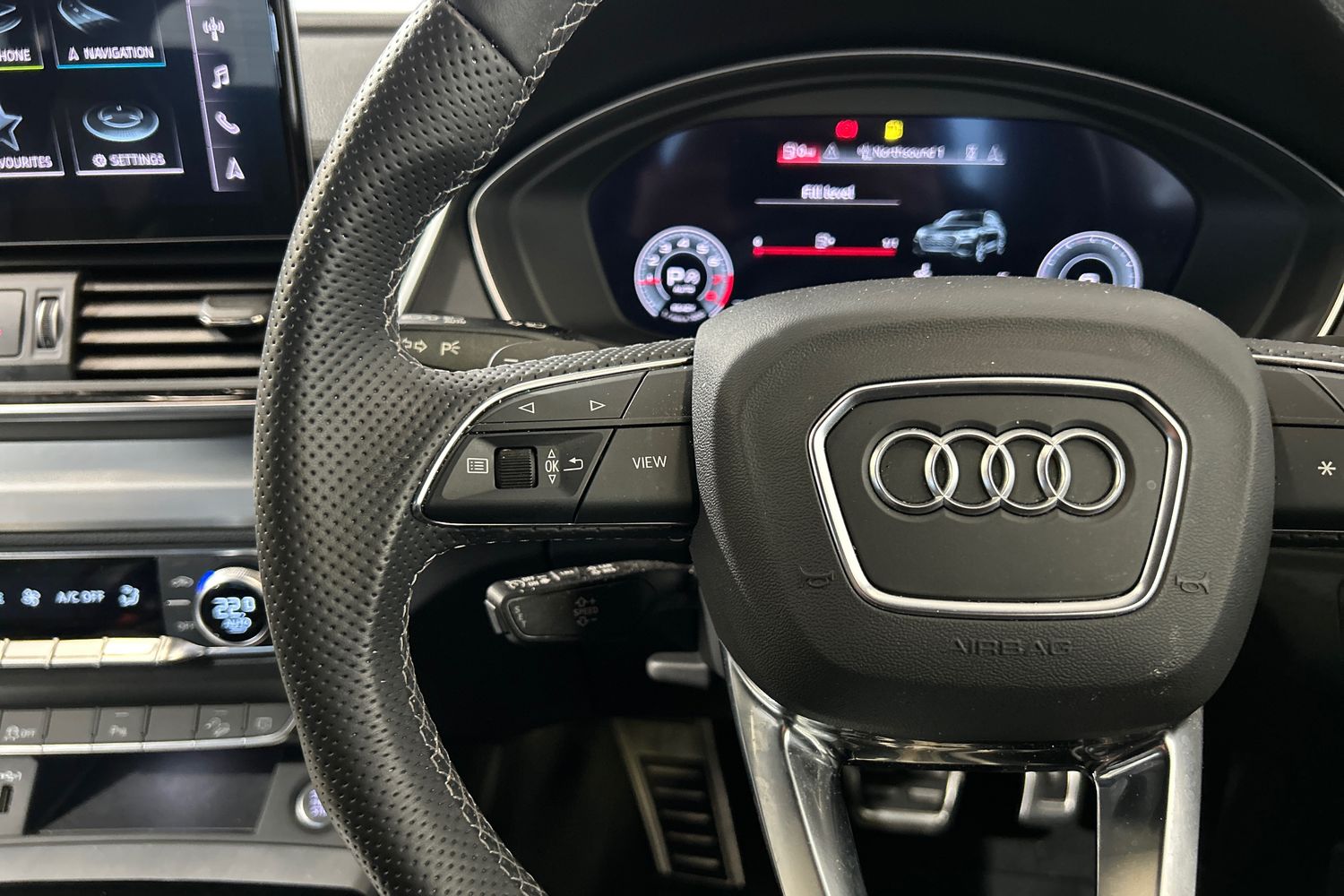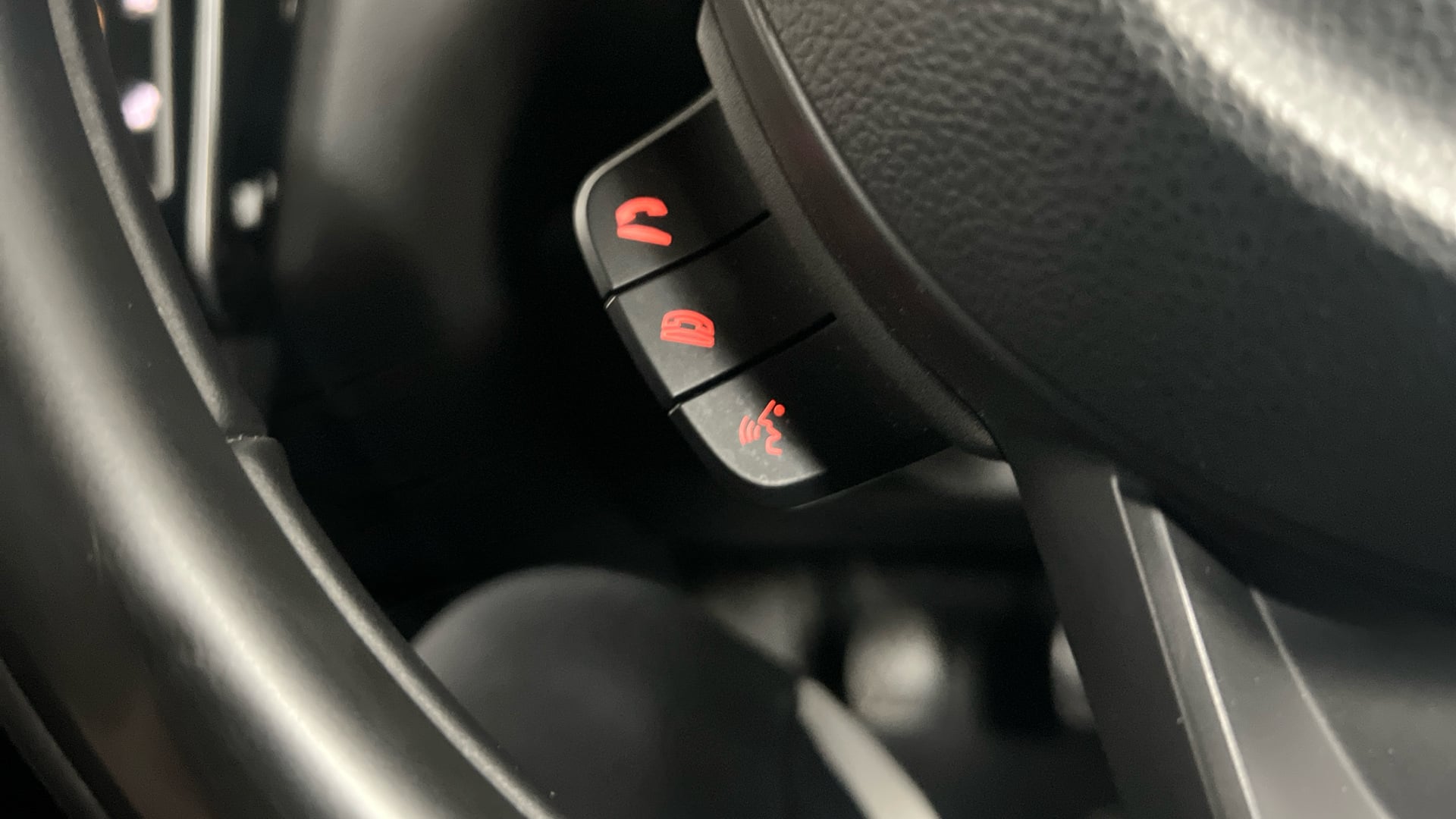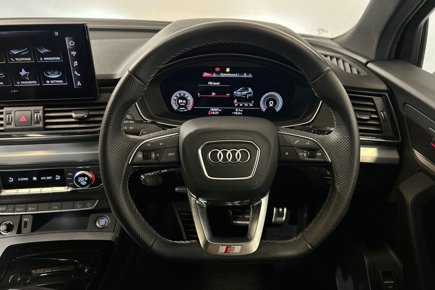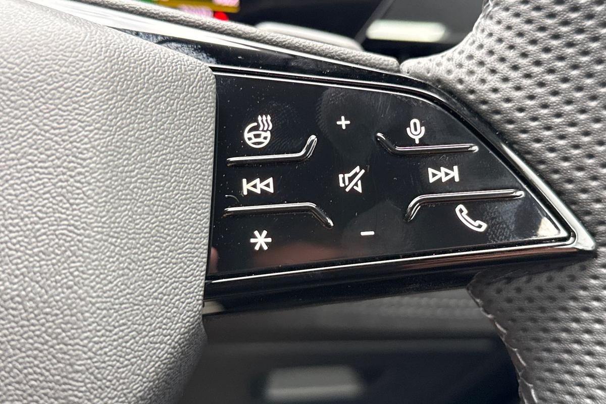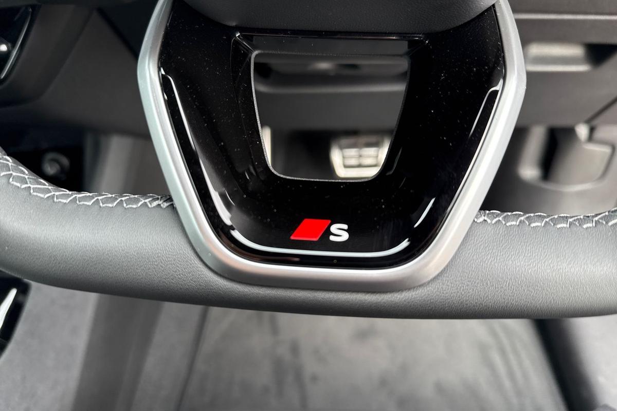 "3 spoke leather multifunction steering wheel with S badging perforated leather grips",