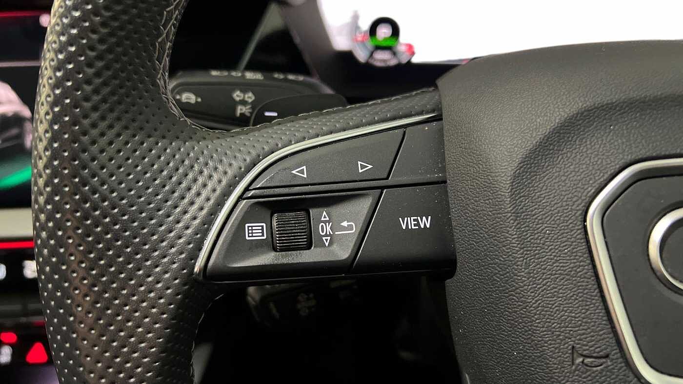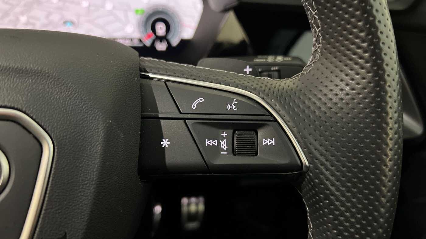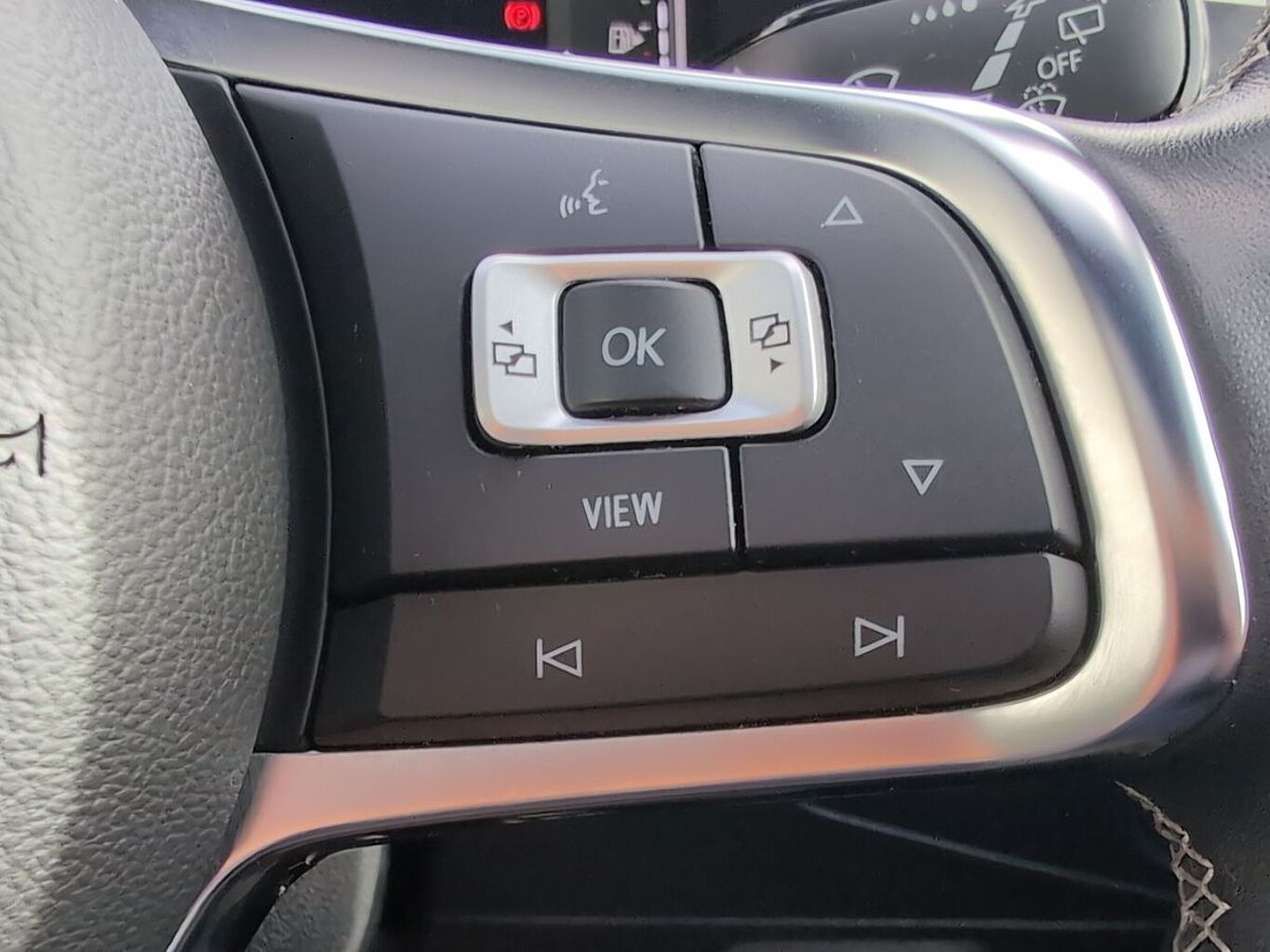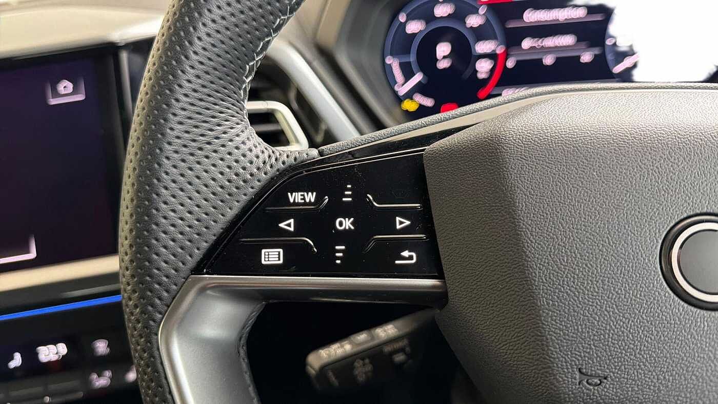 "Three spoke leather trimmed multifunction steering wheel with aluminium inserts and R Line Logo including paddle shift",