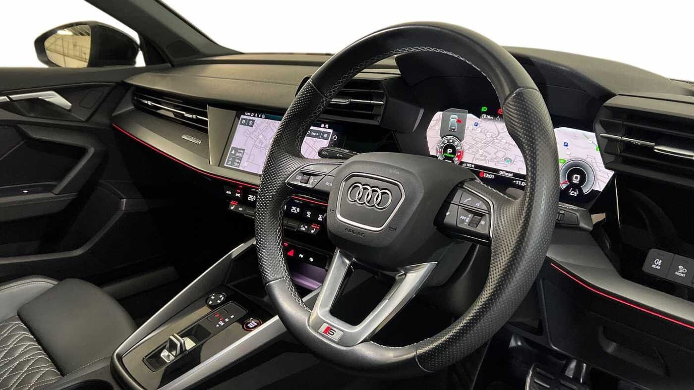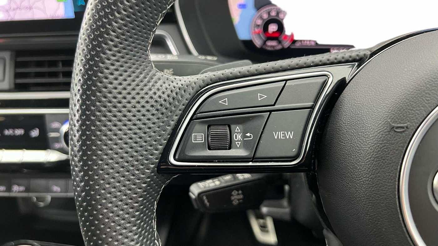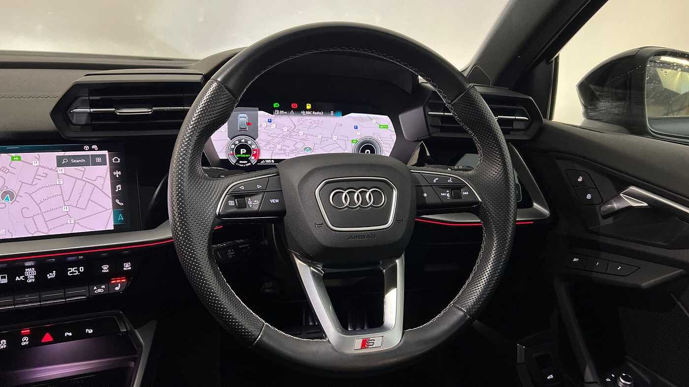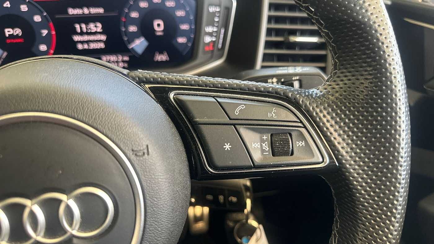 "Three spoke leather trimmed multifunction steering wheel with aluminium inserts and R Line Logo including paddle shift",