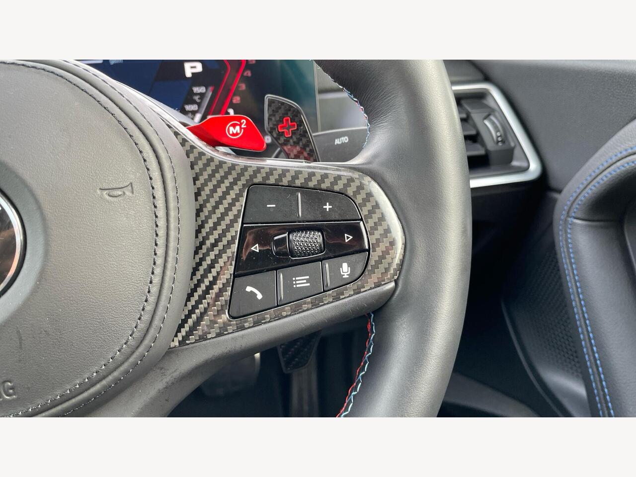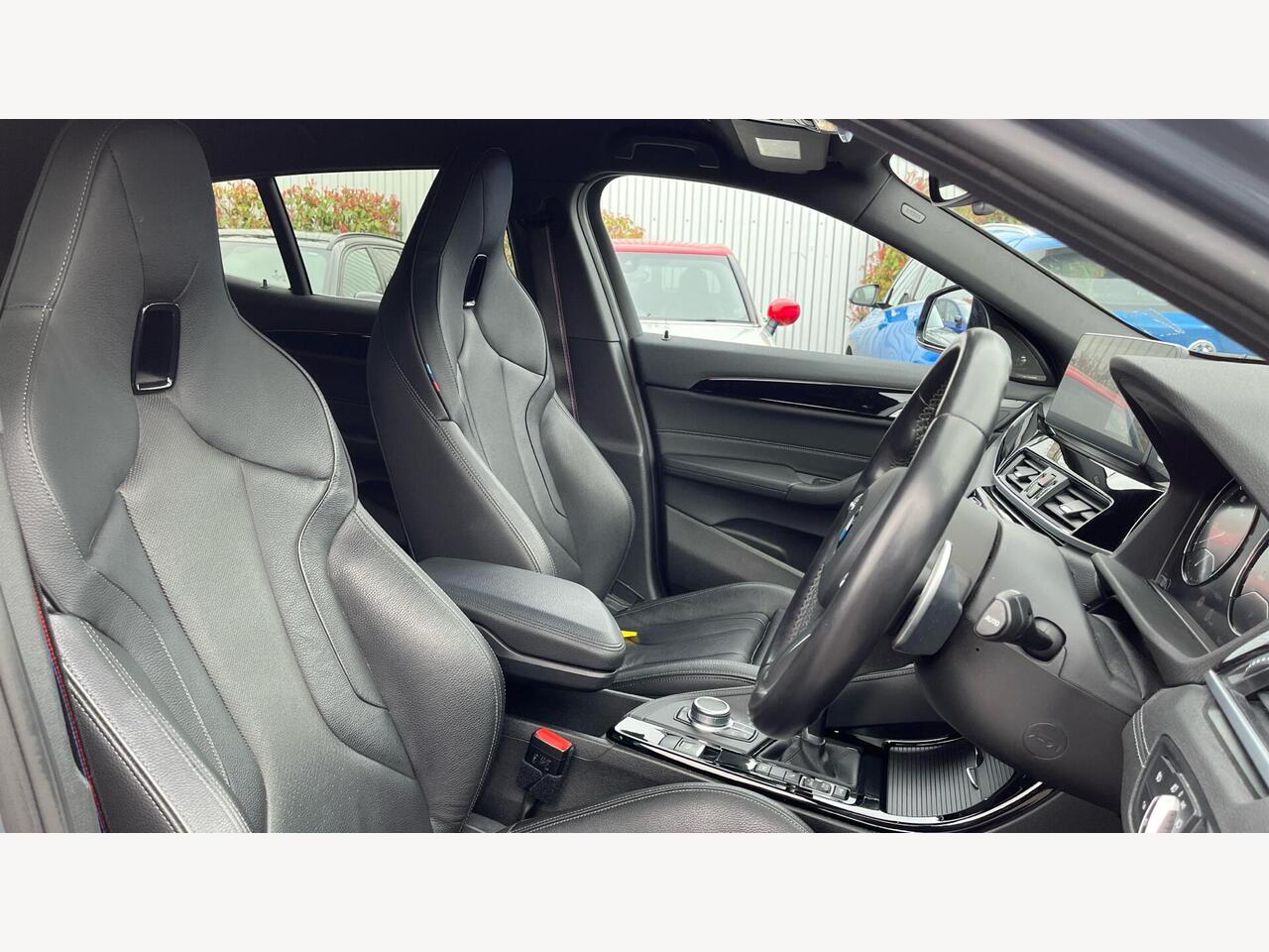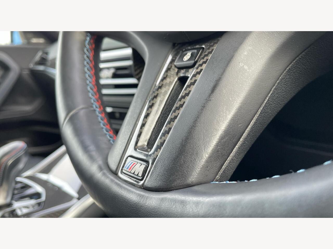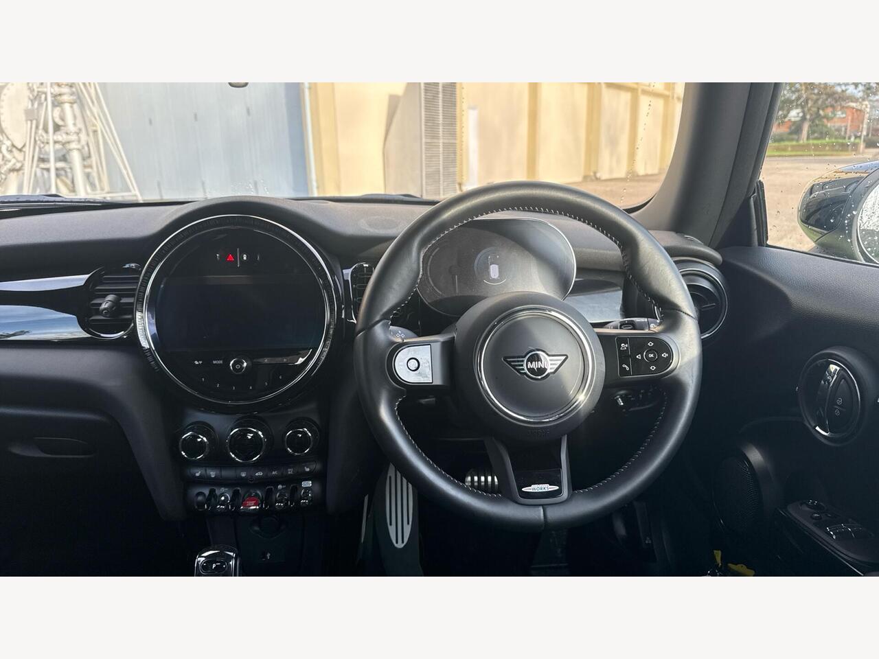 "Walknappa leather steering wheel with grey seam and John Cooper Works badge on Piano Black lower steering wheel spoke"