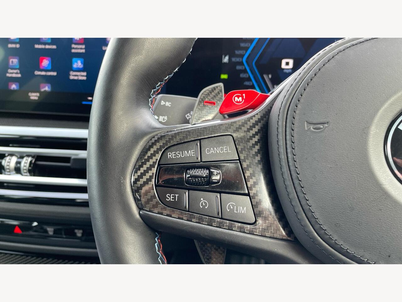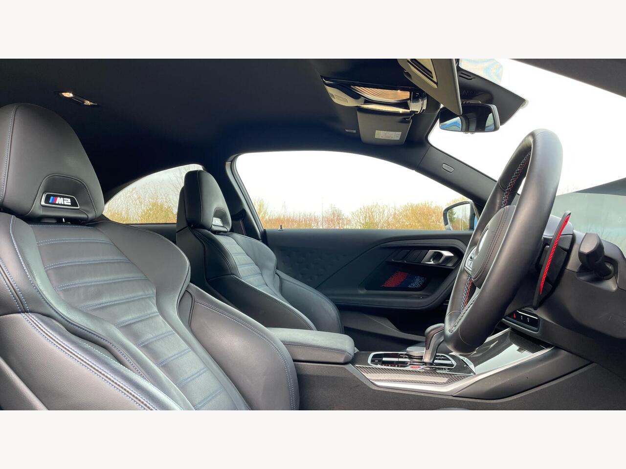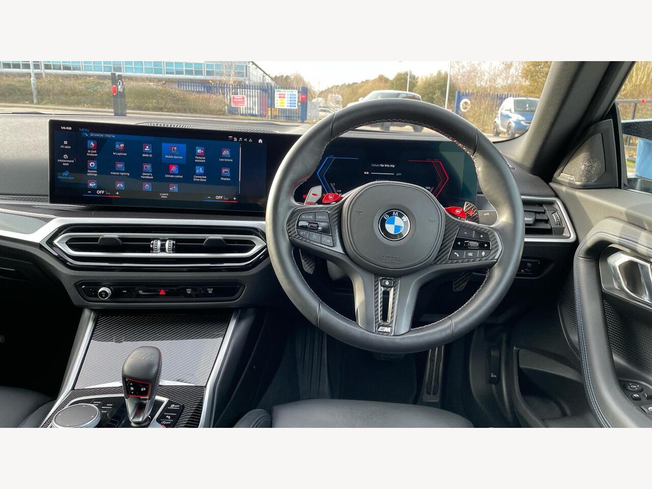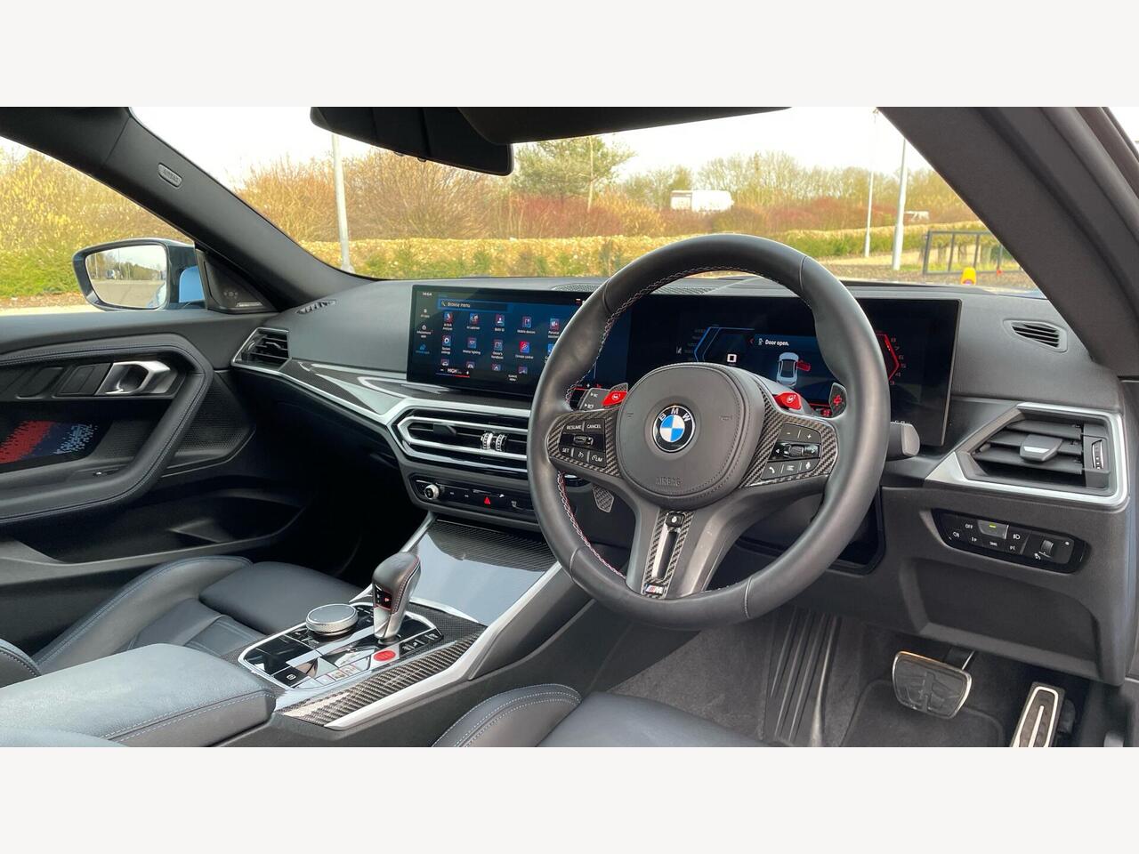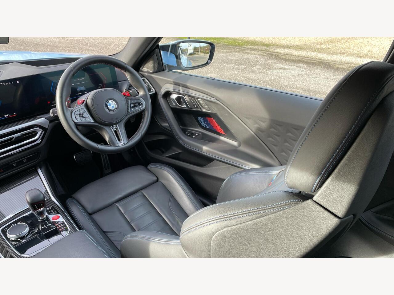 "Walknappa leather steering wheel with grey seam and John Cooper Works badge on Piano Black lower steering wheel spoke"