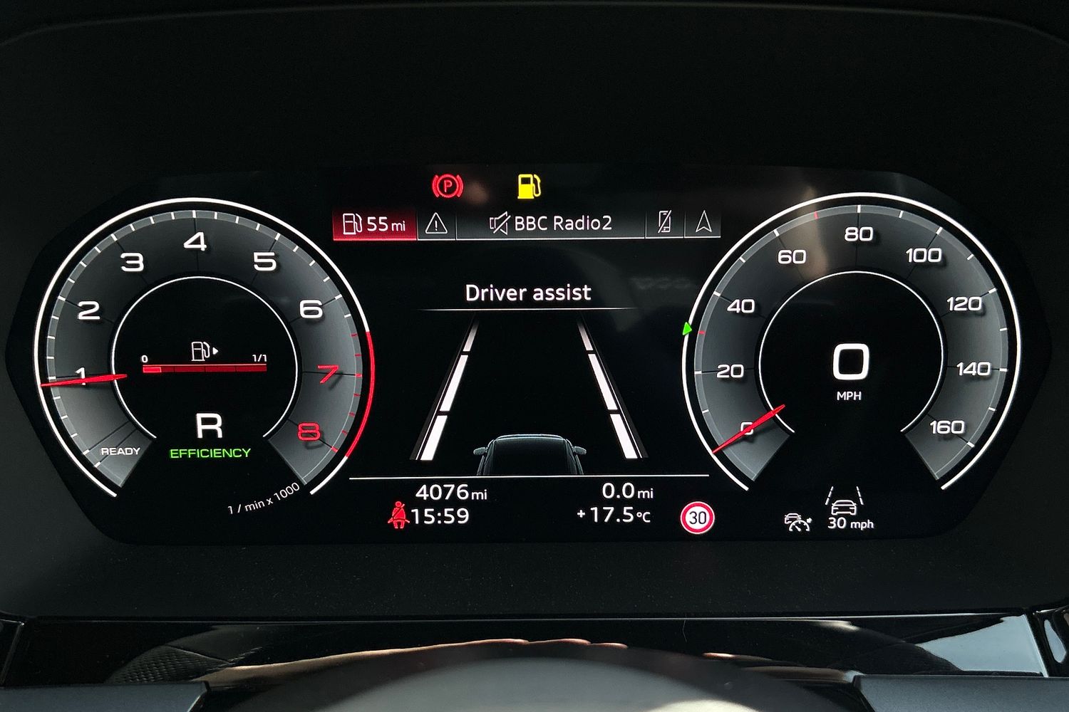 "Speedo, rev counter, electronic odometer, trip, service interval display, exterior temperature and fuel gauge",