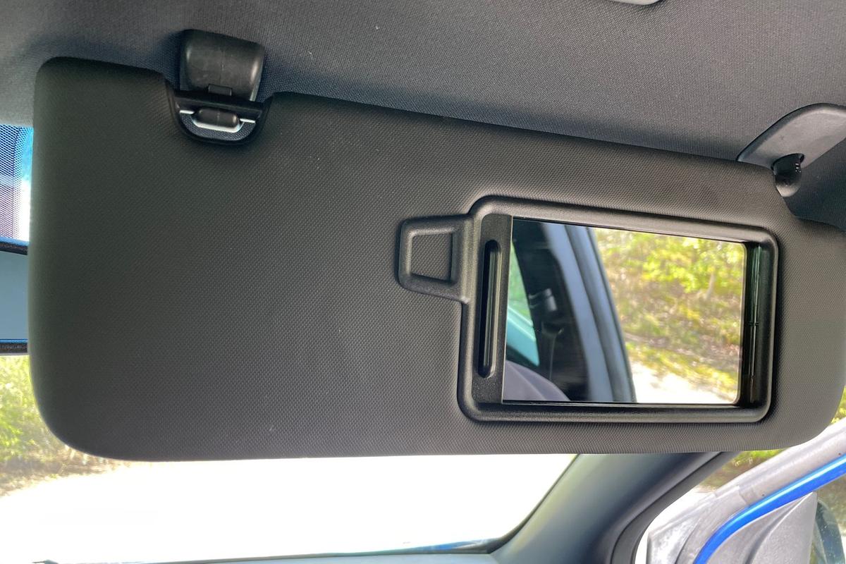 "Sun visors with mirror and airbag label on passenger side",