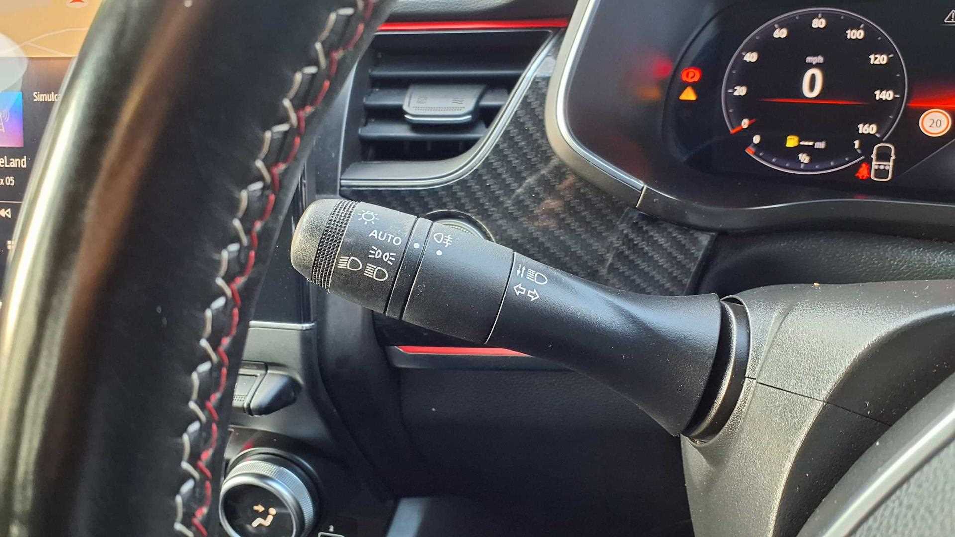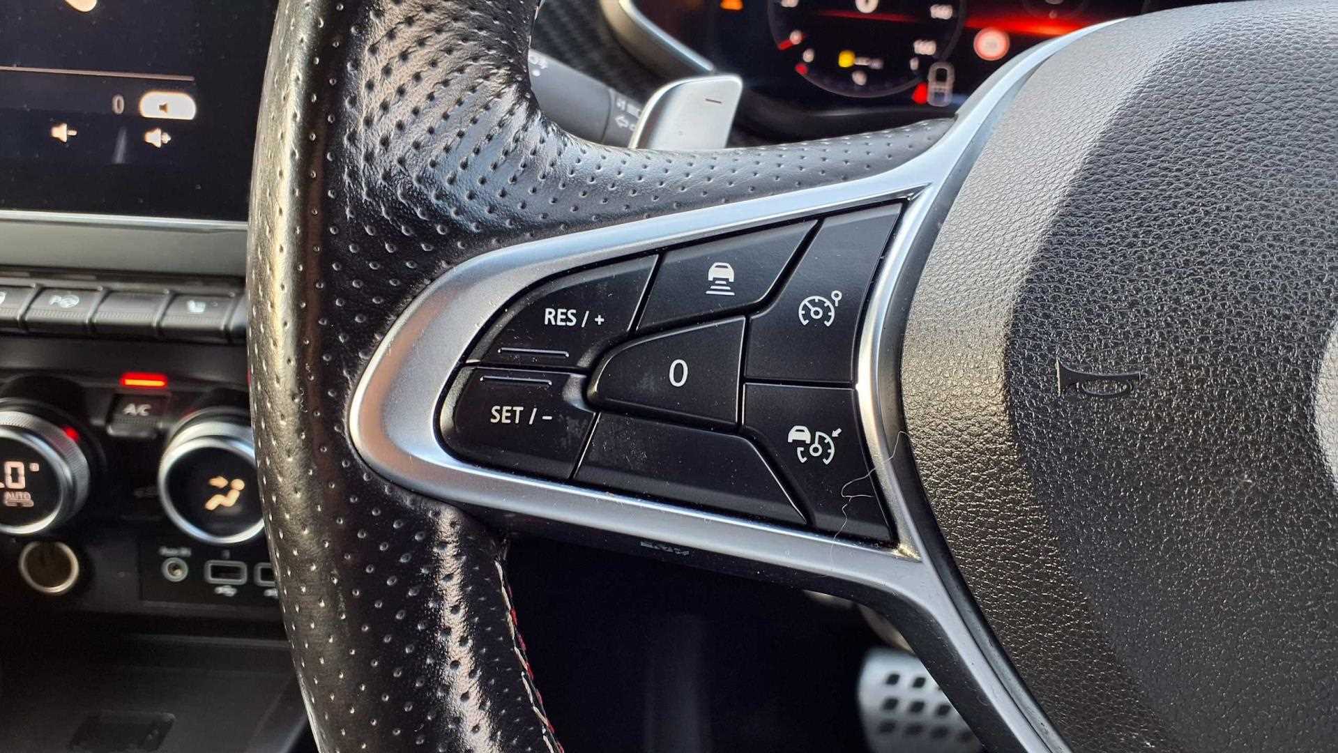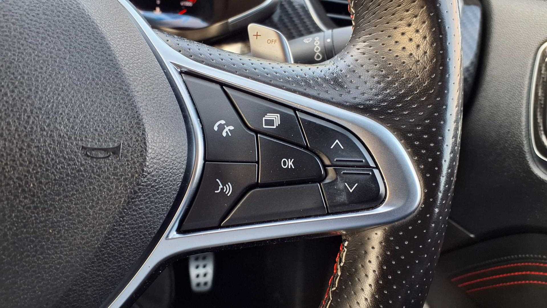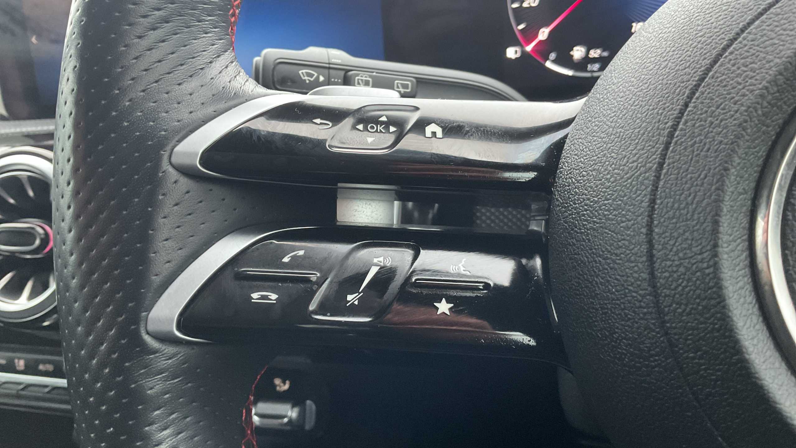 "Flat bottomed leather steering wheel in sensico with red stitching",