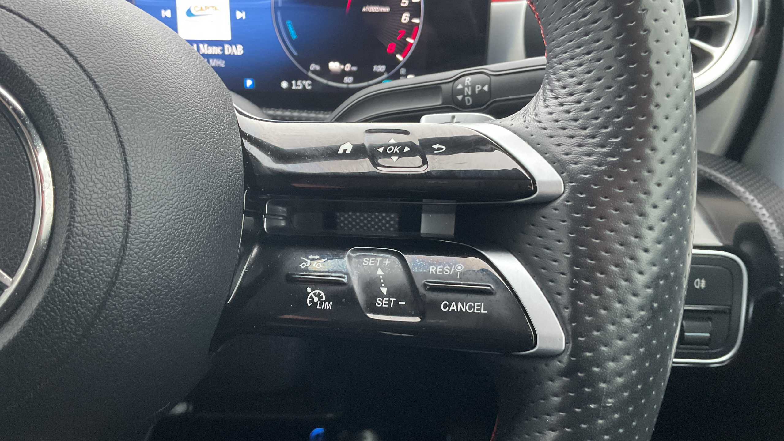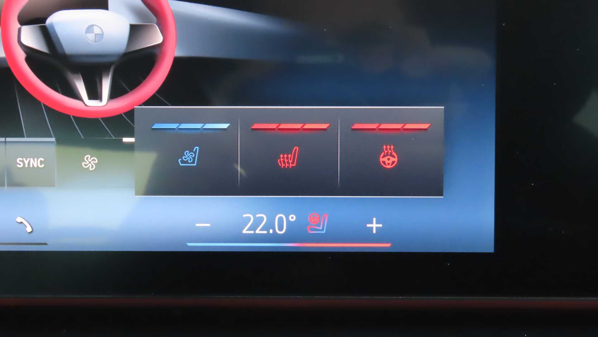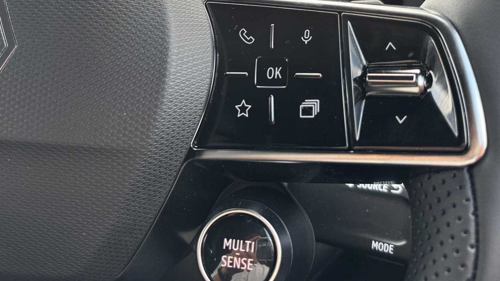 "Flat bottomed leather steering wheel in sensico with red stitching",