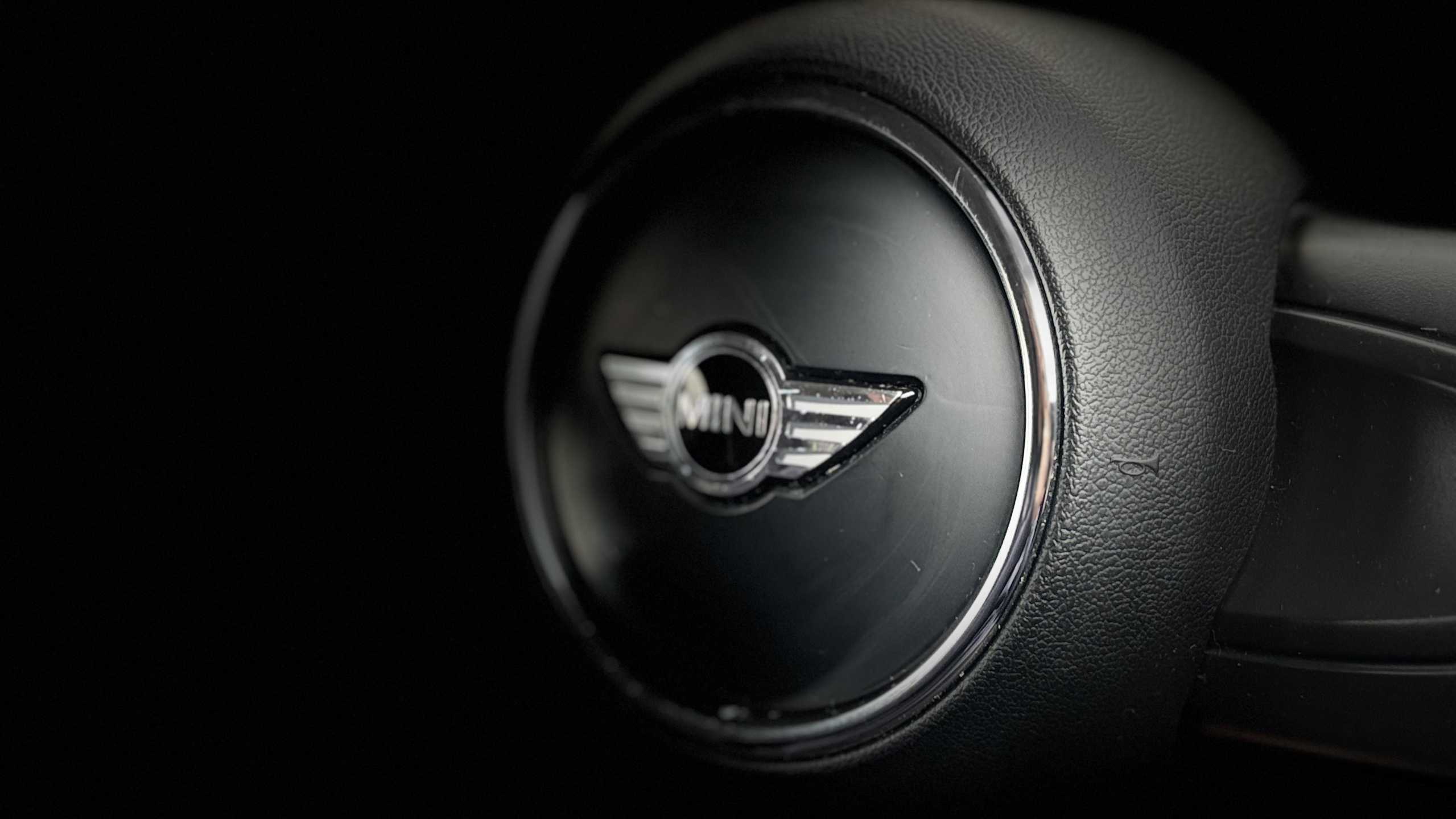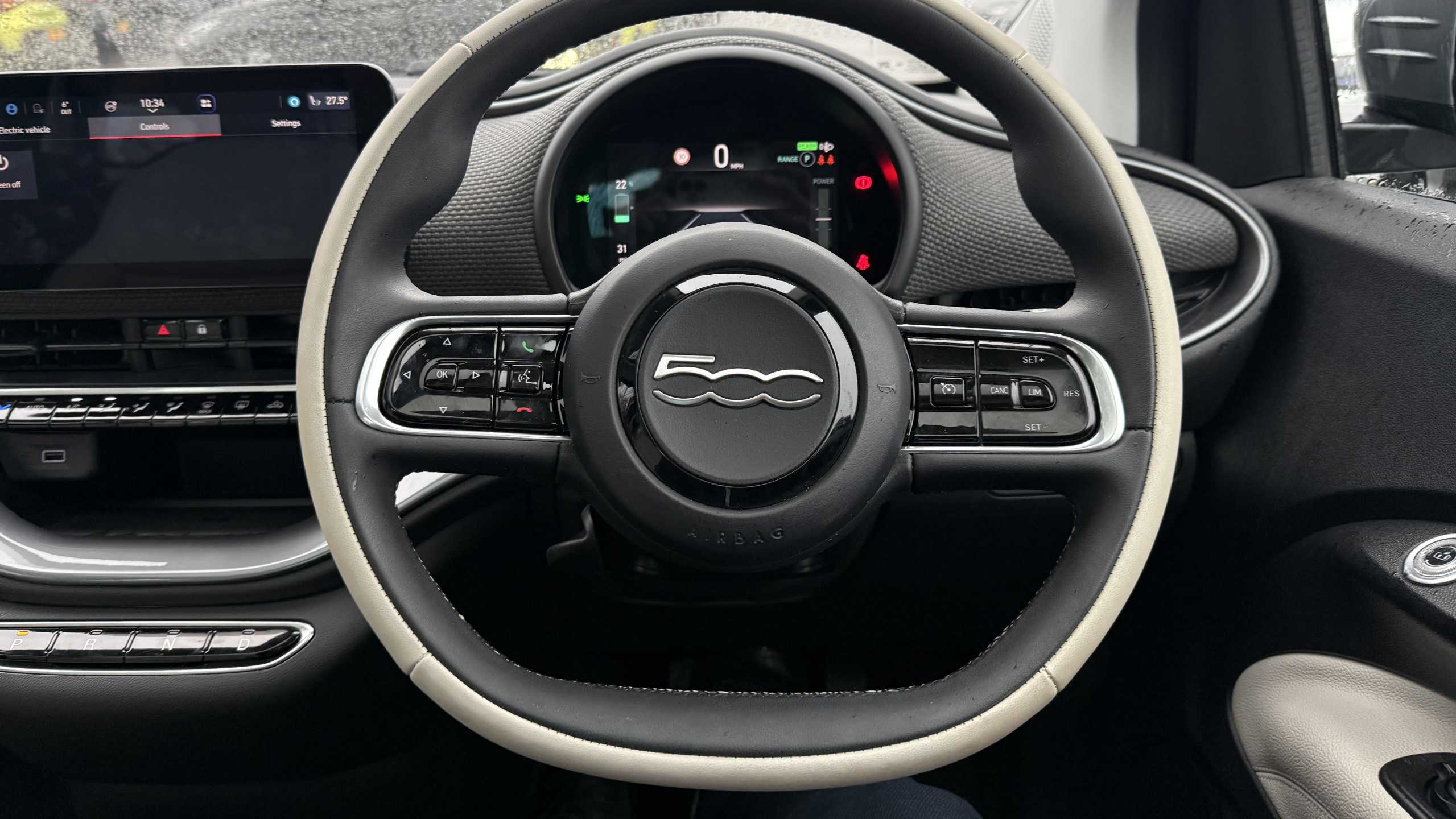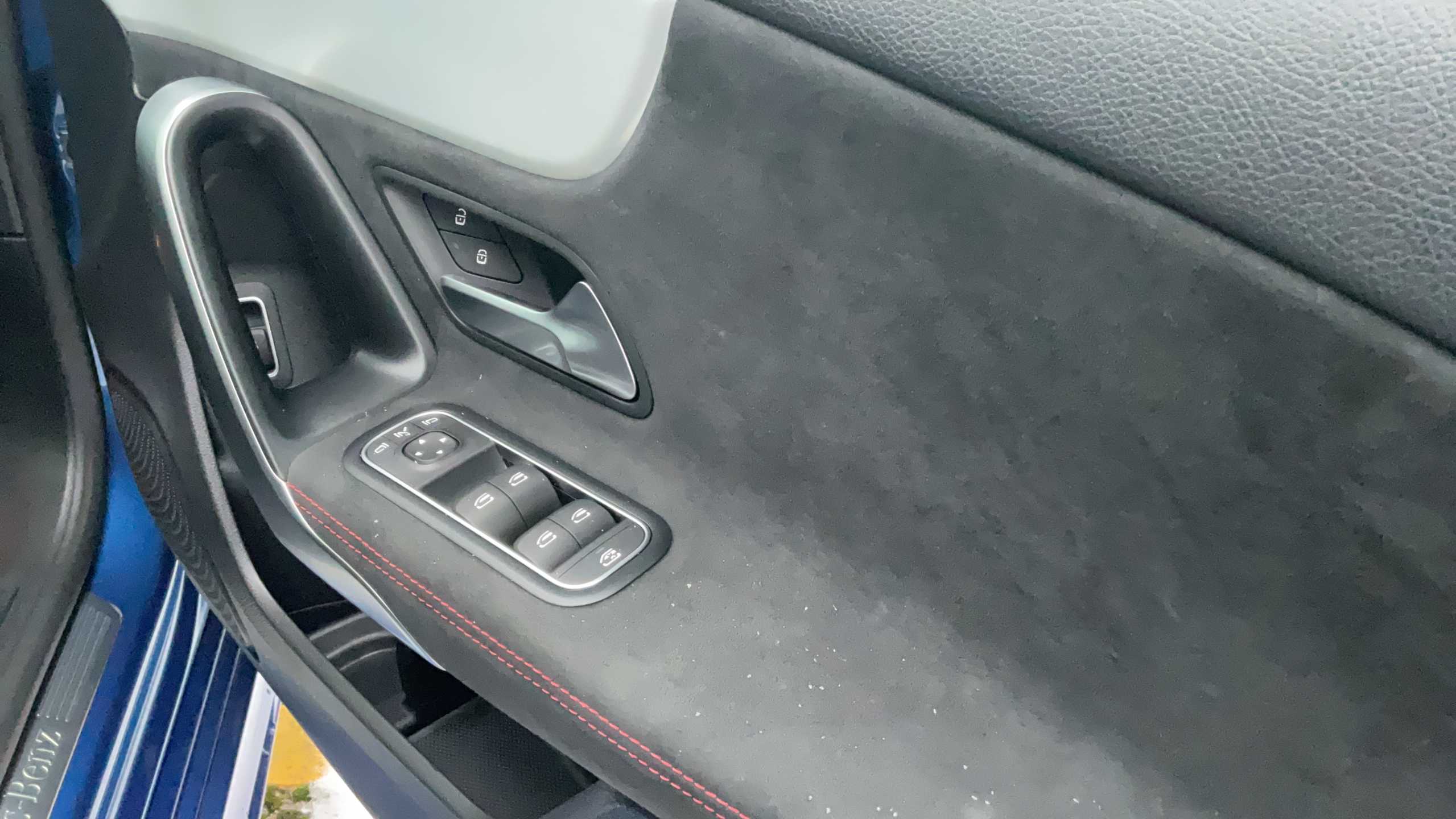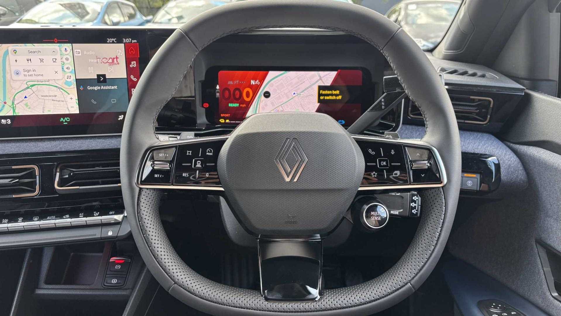 "Flat bottomed leather steering wheel in sensico with red stitching",