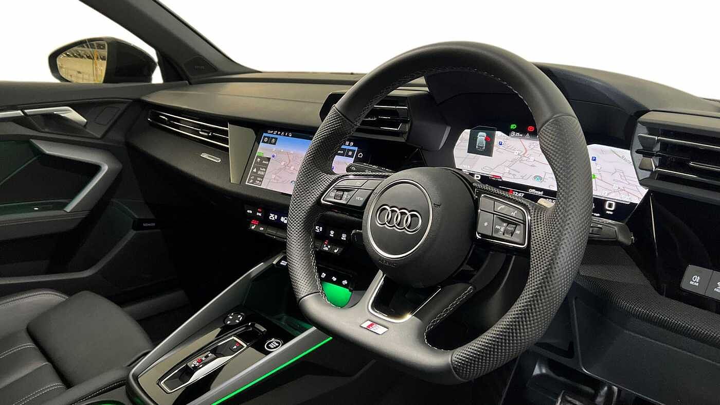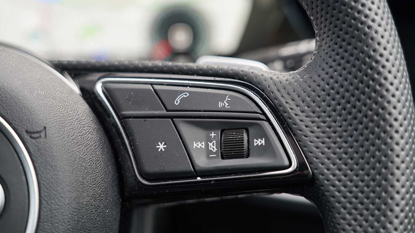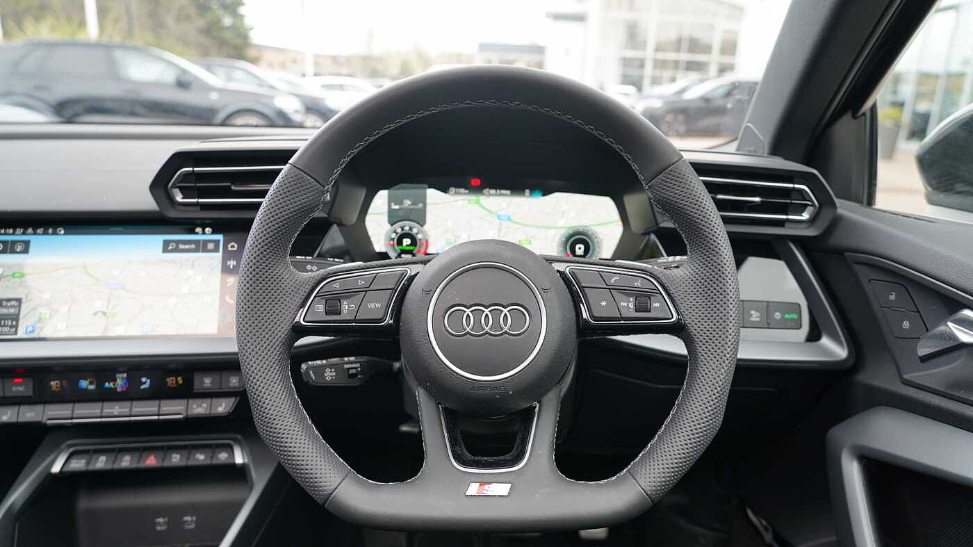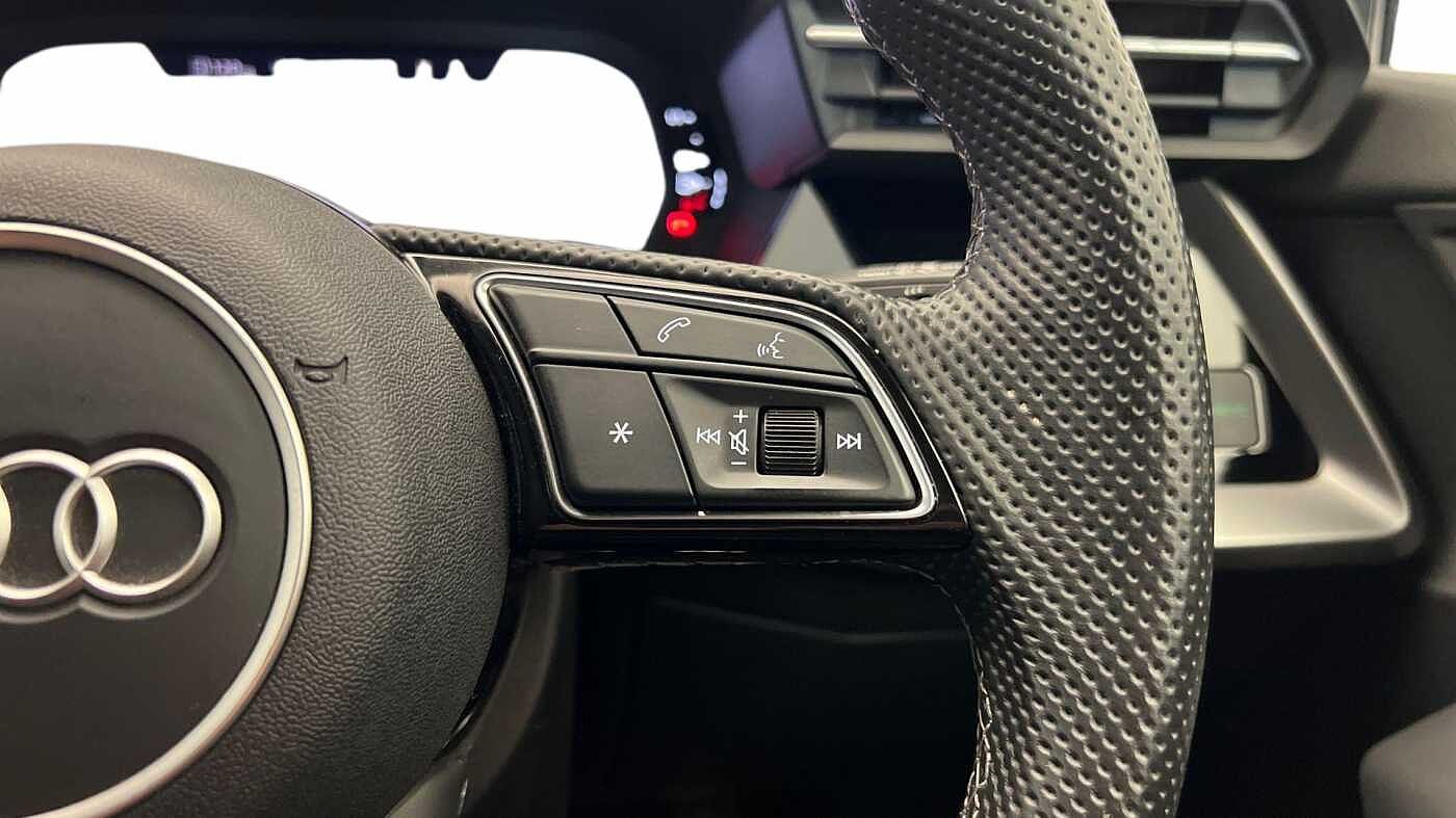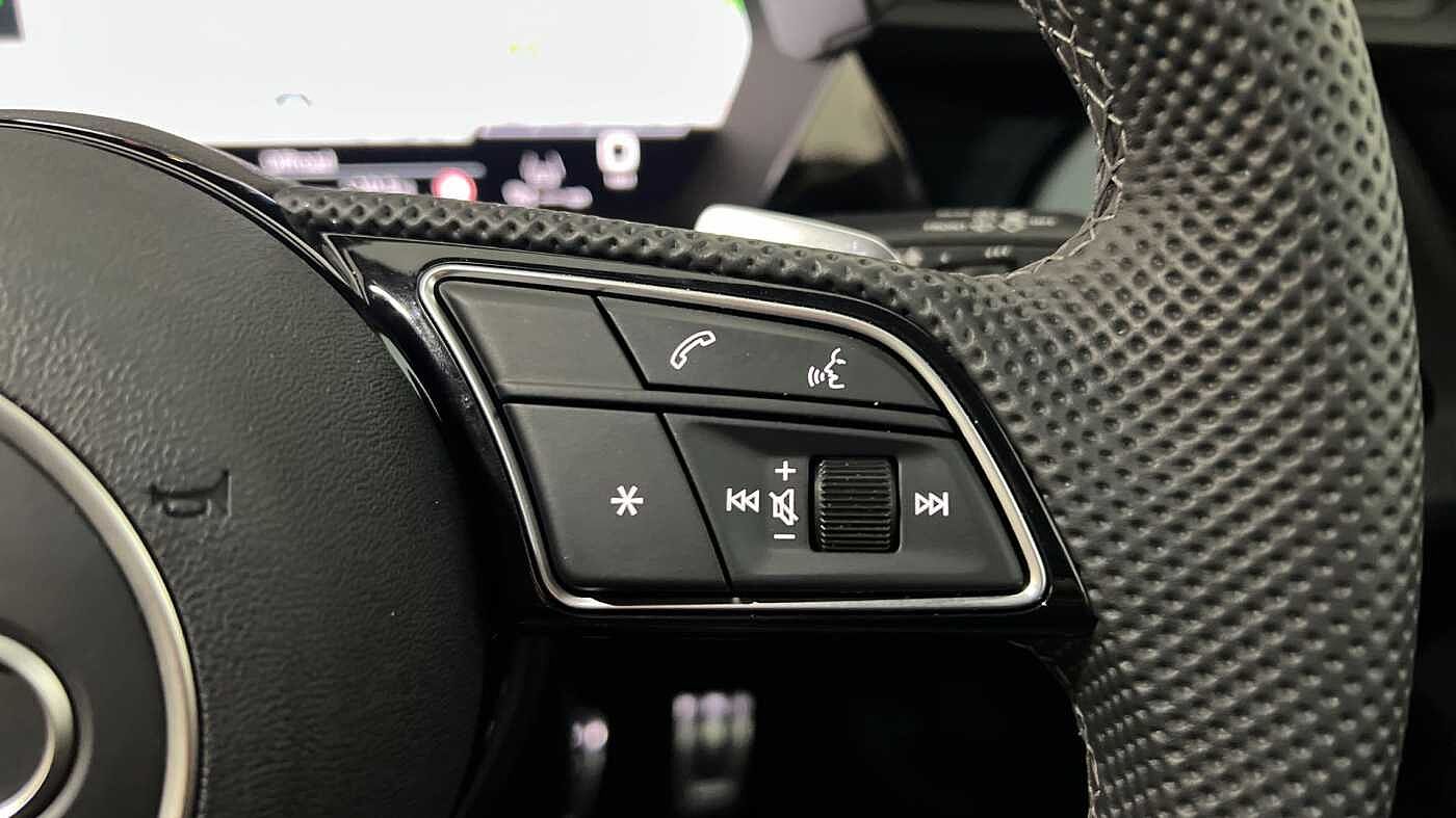 "Three spoke leather trimmed multifunction steering wheel with R logo and gear knob gaiter",
