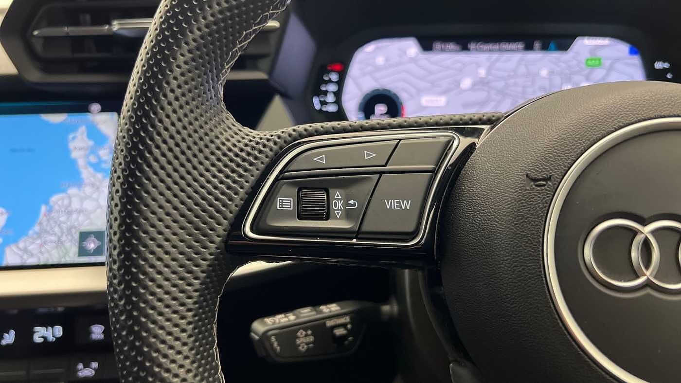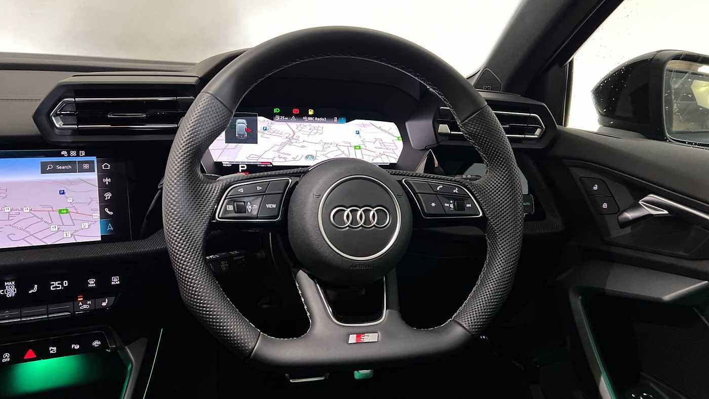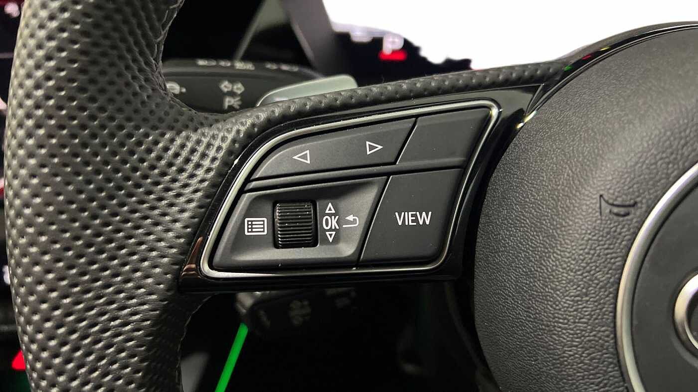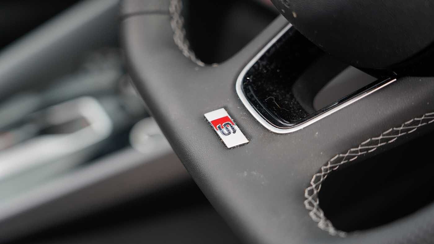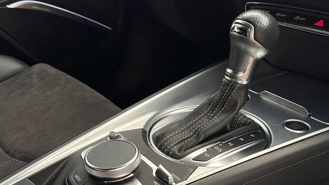 "Three spoke leather trimmed multifunction steering wheel with R logo and gear knob gaiter",