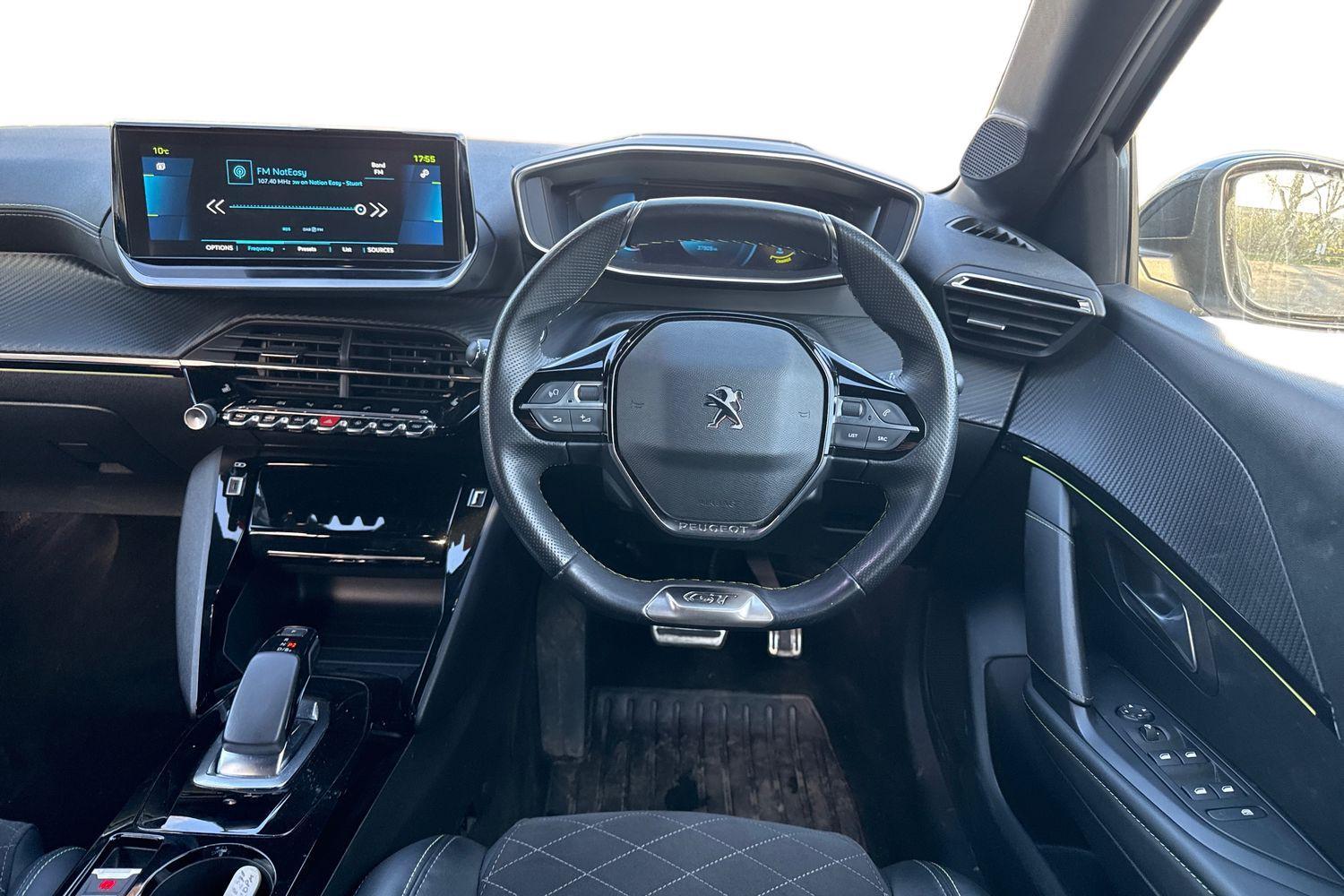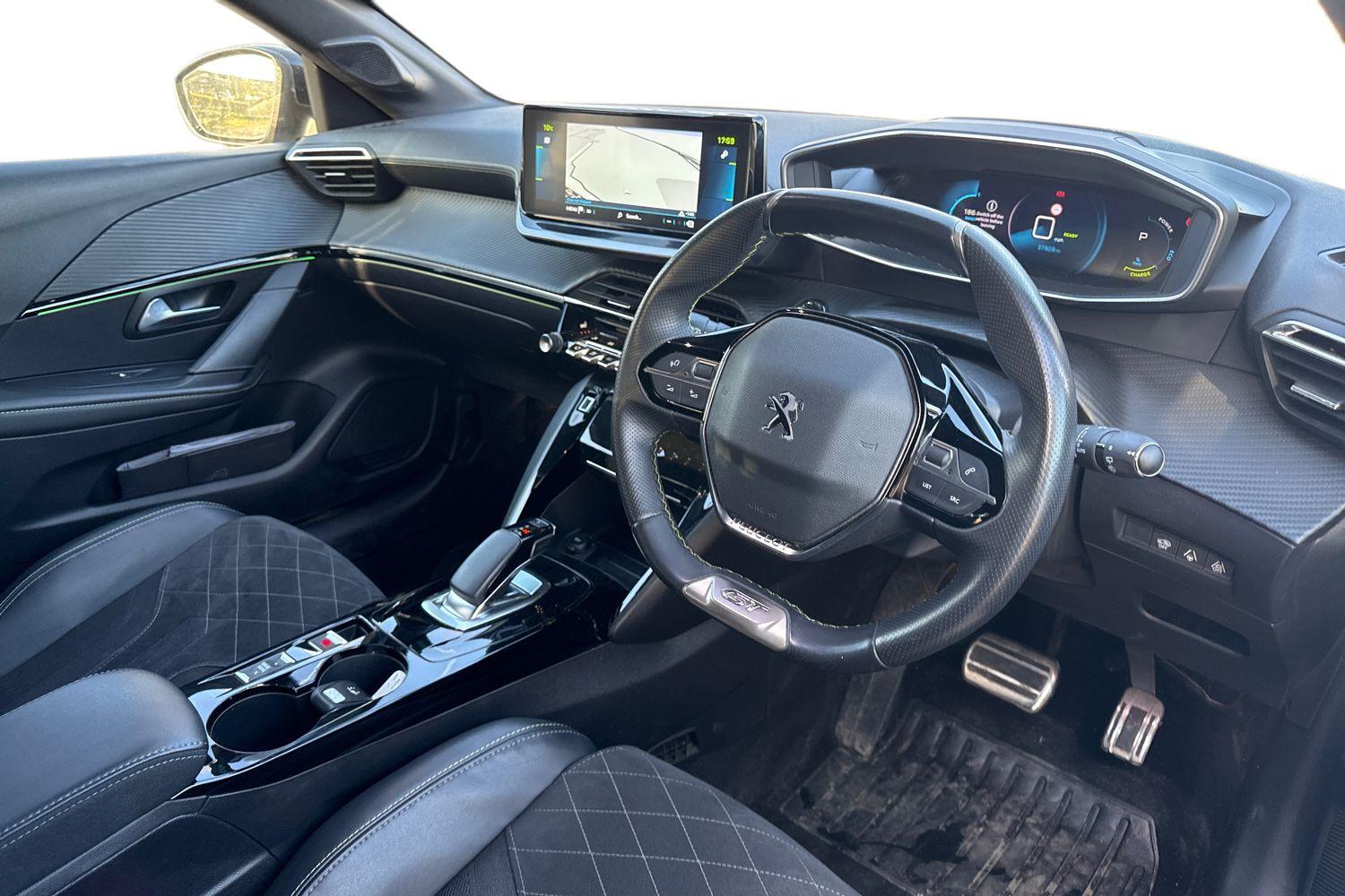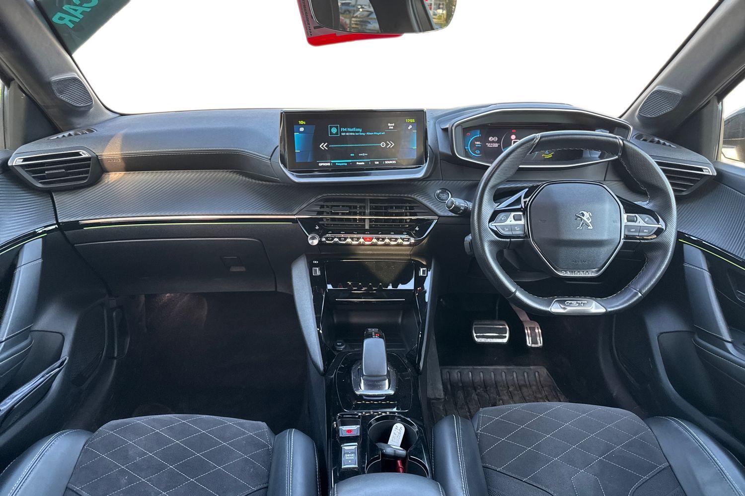 "features": "10\" Capacitive colour touchscreen with connected 3D navigation, Blind spot monitoring, Bluetooth telephone facility, Driver attention warning, e-Toggle driving selector, Exterior temperature indicator with ice warning, Mirror screen with mirror link, apple carplay and android auto, Multi function trip computer, PEUGEOT i-Cockpit with compact steering wheel, PEUGEOT i-Cockpit with configurable 3D headup instrument panel, PEUGEOT SOS and assistance, Push button start, Smart phone docking station, Speed limit recognition and recommendation, Visio park assist 180 with colour reversing camera + front and rear parking sensor, 7 kW monophase on board charger, Mode 3 type 2 cable for wallbox charging, 2 front USB socket with USB-C, 2x USB sockets in rear, 6 speakers radio with mp3 compatible, DAB Digital radio, Voice recognition for radio, navigation and telephony features, 2 X Rear number plate lights, Automatic hazard light activation upon heavy brake application, Automatic lights, Automatic windscreen wipers, Body coloured exterior door handles, Dark tinted rear side and tailgate windows, Diamond black rear spoiler (roof), Diamond Black roof, Electric front windows + one touch + anti-pinch, Electric rear windows with one touch/anti-pinch, Electrically adjustable, heated and power folding door mirrors, Follow me home headlights, Frameless electrochrome interior rear view mirror, Full LED headlights with smartbeam assist, Gloss black finish on B pillar, Gloss black rear cluster connecting strip, Gloss black wheel arch extensions, Gloss black window surround, GT model designation badging on tailgate, Headlights left on audible warning, LED daytime running lights with 3 claw headlight with distinctive tooth design, LED side indicator lights integrated into door mirrors, LED third brake light, Model designation badges front and rear, Nera black door mirror shells, Peugeot scuff plates, Radiator grille - body colour chequered and gloss black edge trim, Rear bumper with gloss black finish, Rear full LED 3D peugeot signature claw effect lights with daylight function, Rear lower bumper diffuser effect trim in gloss black, Rear reversing lights, Rear side wing doors, Rear windscreen wiper triggered automatically in reverse gear, Roof mounted aerial with fin design, Roof spoiler, Tailgate with heated rear windscreen and wiper blade, Variable front intermittent wipers, 1/3 to 2/3 split folding rear seats, 12V socket, 3 seat bench in 2nd row, 8 Colour personalisable ambient lighting, Aluminium pedals and foot rest, Automatic air conditioning, Automatic gear lever in full grain leather and satin chrome, Driver and front passenger seat manual adjustment in longitudinal and back rest angle, Driver and front passenger seat mechanical height adjustment, Driver and front passenger sport seats, Electric power steering with reach and rake adjustable steering column, Front and rear carpet mats in black with specific detailing, Front centre armrest with storage compartment, Front LED interior light with 2 reading spotlights and rear interior light with timer, High centre console with 2 cup holders, ISOFIX child seat mounting points on passenger seat, Lime green contrast stitching to armrest, front centre console, door panels and dashboard facia, Map pockets on the backs of the front seats, Mistral full grain perforated leather steering wheel with aikinite stitch detail and satin chrome 'GT' emblem, Piano keys gloss black plated toggle switches to access main functions of the vehicle, Piano keys gloss black plated toggle switches to access touchscreen functions, Pre heating function, Rear centre headrest, Roof lining - Mistral black, Seatbelt unfastened on the move audible and visual alert for front and rear seats, Single front passenger seat, Tri material alcantara/cloth upholstery, Drive assist pack plus - 208, 3 rear 3 point seatbelts, ABS (Anti-lock Braking System) with EBD (Electronic Brakeforce Distribution) and EBA (Emergency Braking Assistance), Active safety brake with night function/cyclists/pedestrians, Adaptive driver and front passenger airbags with passenger airbag deactivation function, Child locking functionality on rear doors, Driver/front passenger side airbags, Electric parking brake, ESP with Hill Assist, Front and rear curtain airbags, Front and rear disc brakes, Front optimised safety headrests and 3 x rear retractable headrests with height adjustable, Front three point retractable seatbelts with force limiters, Tyre pressure sensor, Acoustic vehicle alert system (AVAS), Automatic door locking when moving off, Deadlock, Electronic code immobiliser, Peugeot Open and Go System, Remote central locking, Thatcham cat. 1 alarm with anti lift sensor, Carbon effect Dashboard, front and rear door panel finish, 17\" Shaw diamond cut two tone alloy wheels, Tyre puncture repair kit, ",
