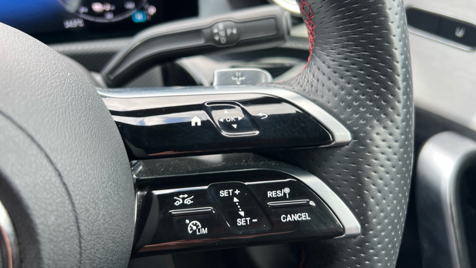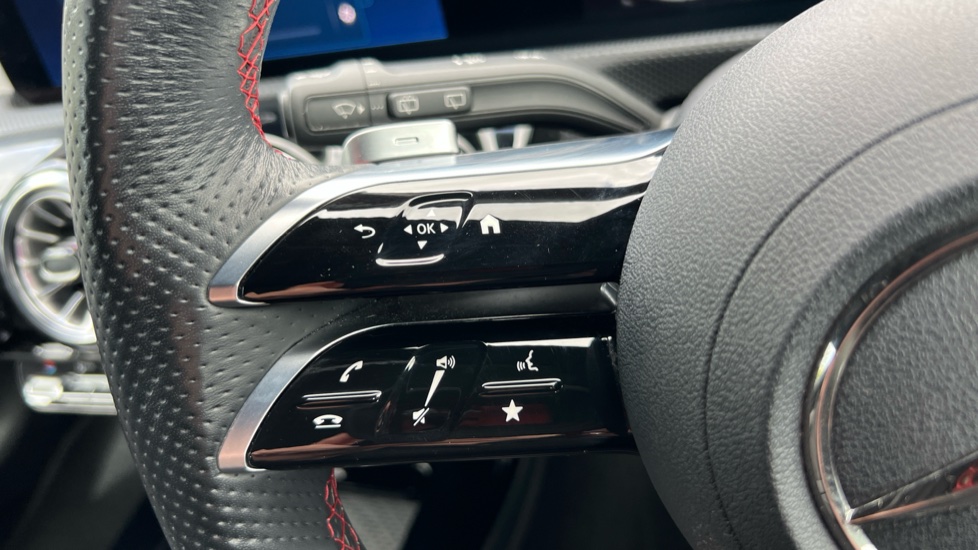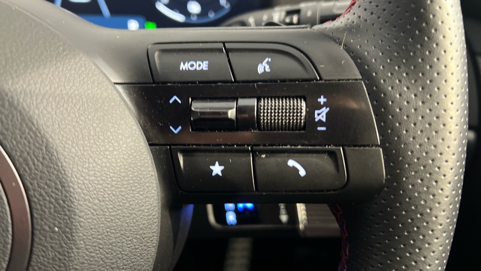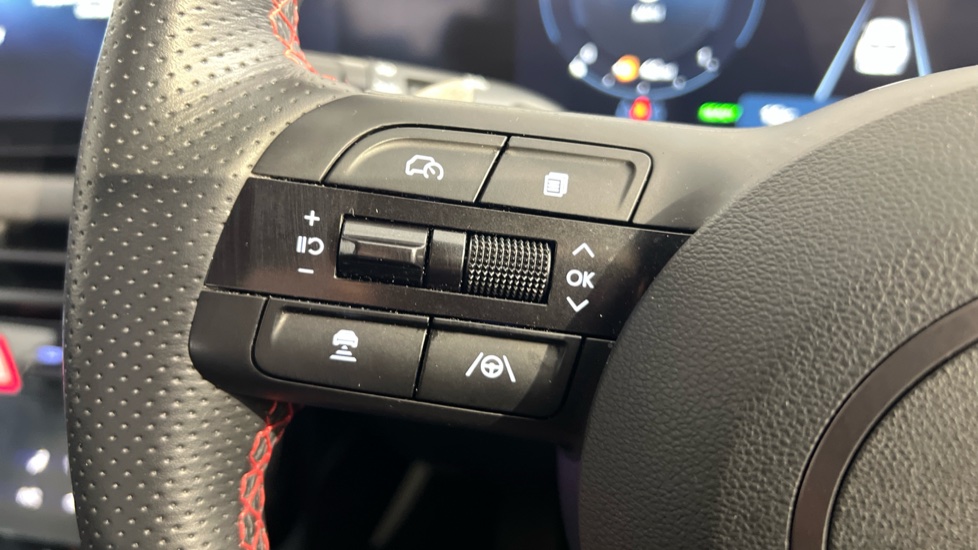 "Leather steering wheel with audio controls",
