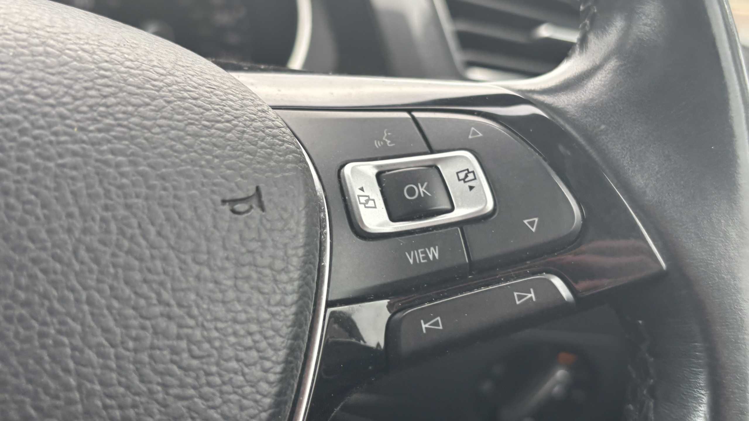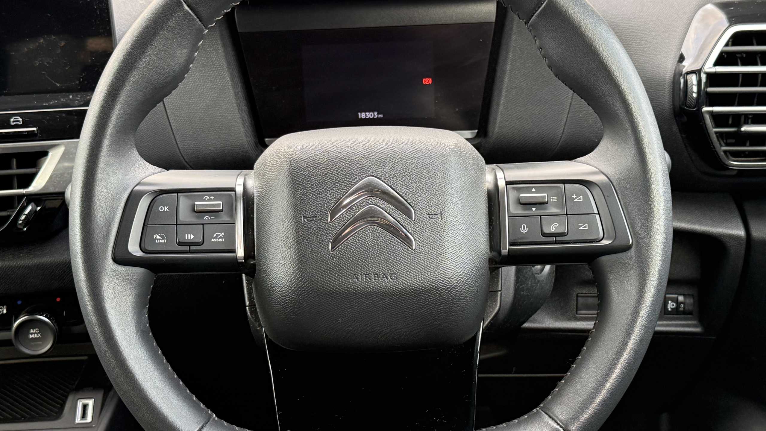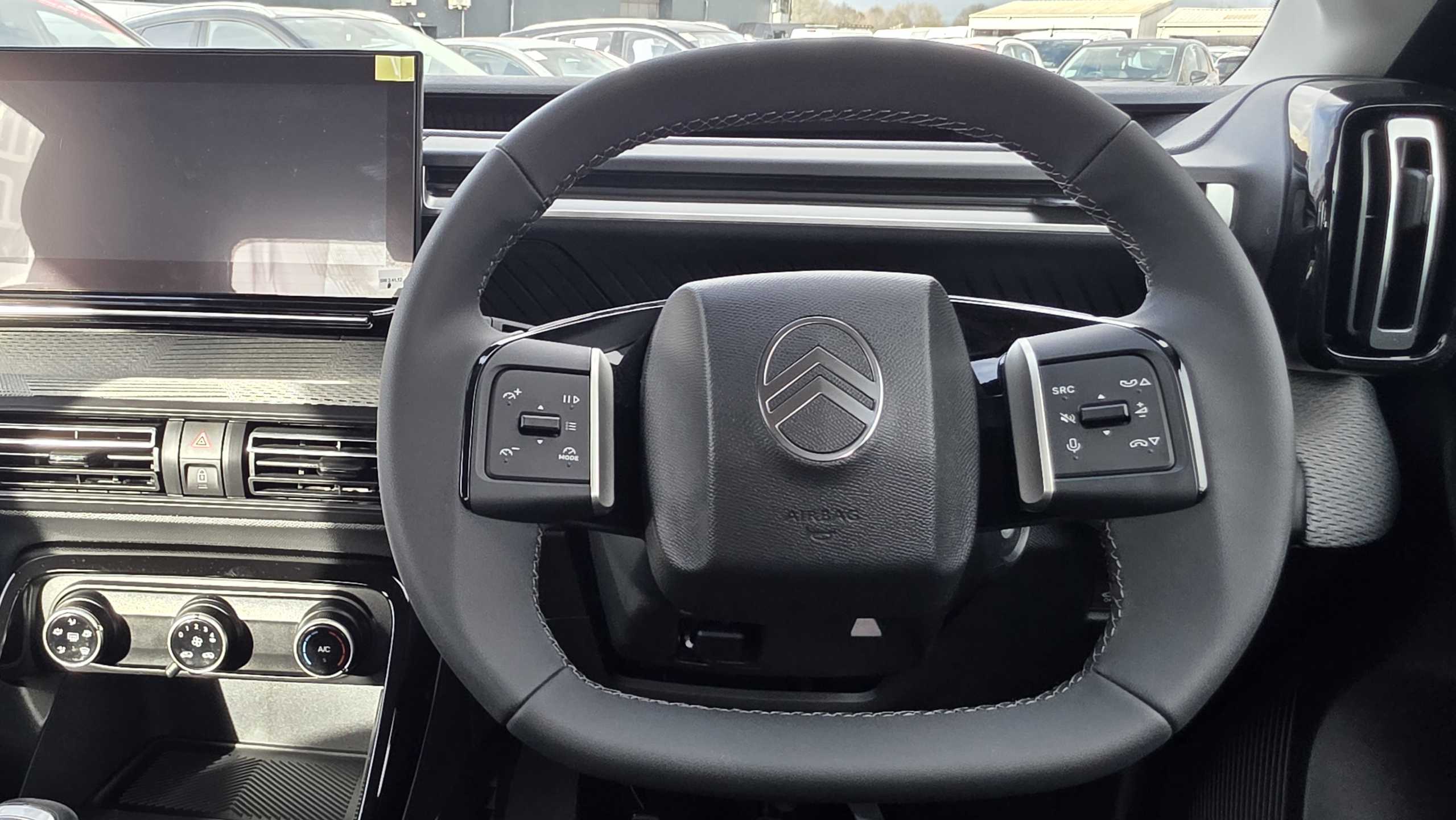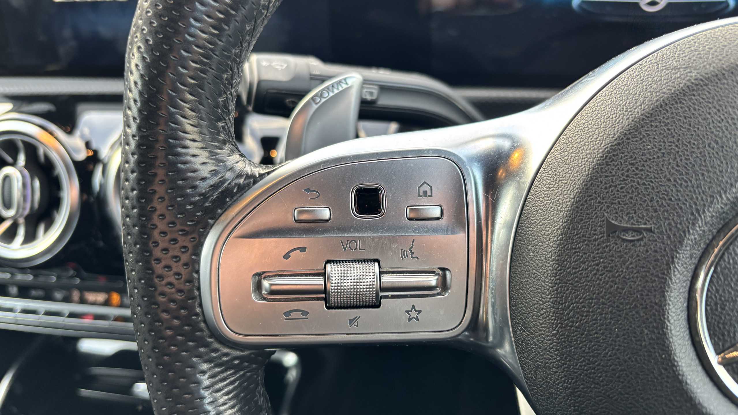 "Grained leather steering wheel with two command blocks",