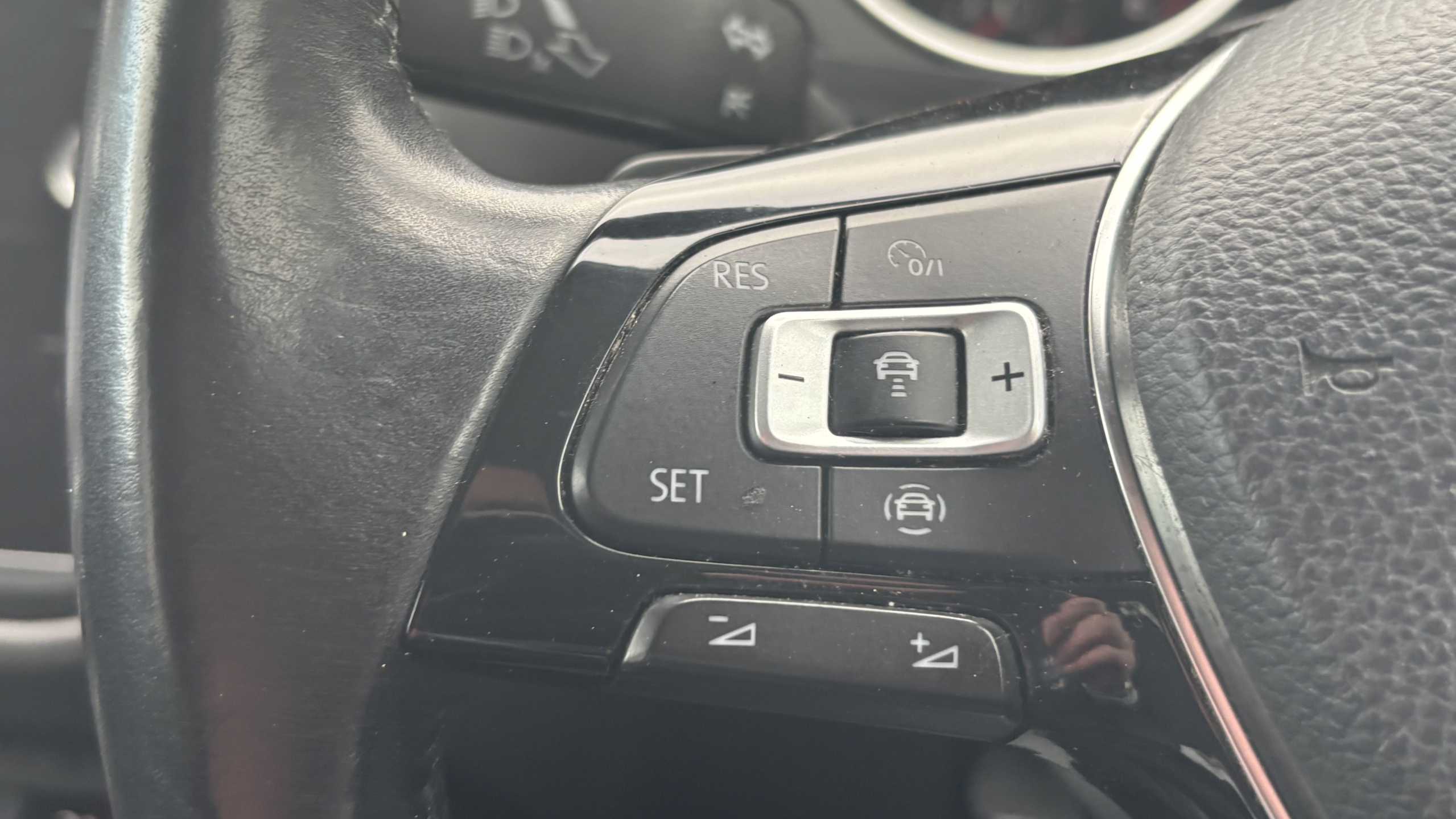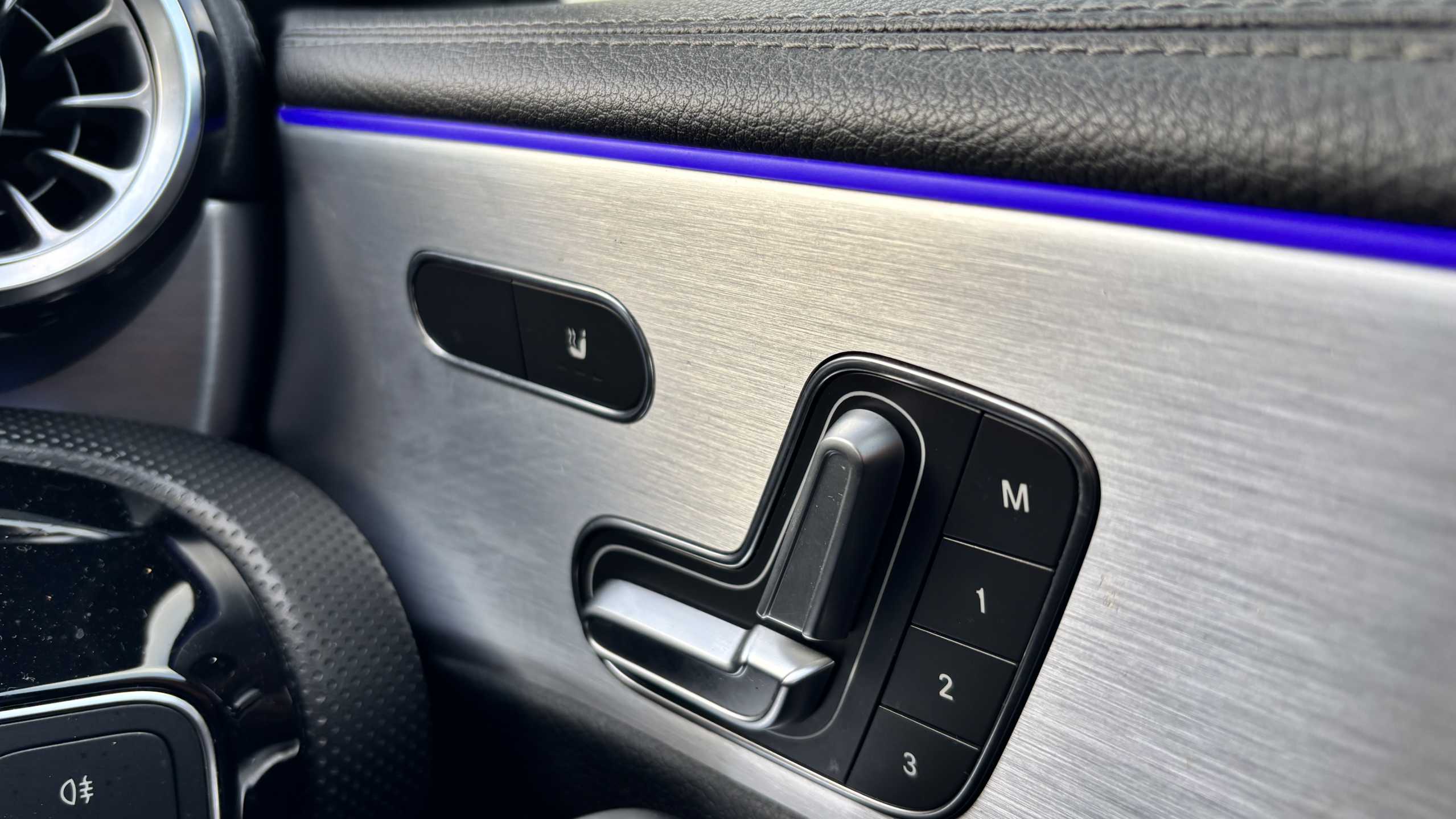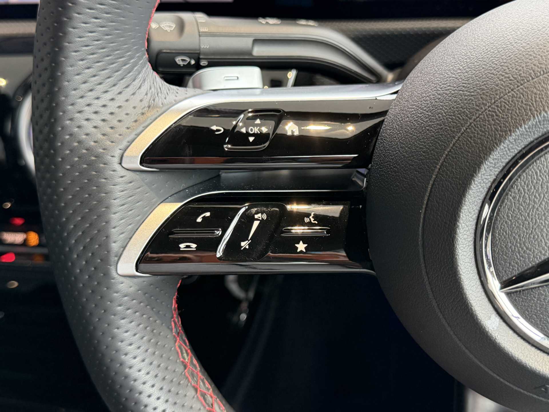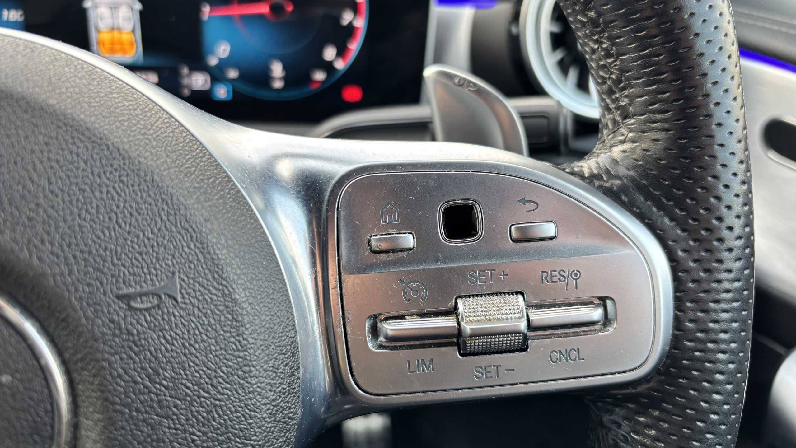 "Grained leather steering wheel with two command blocks",