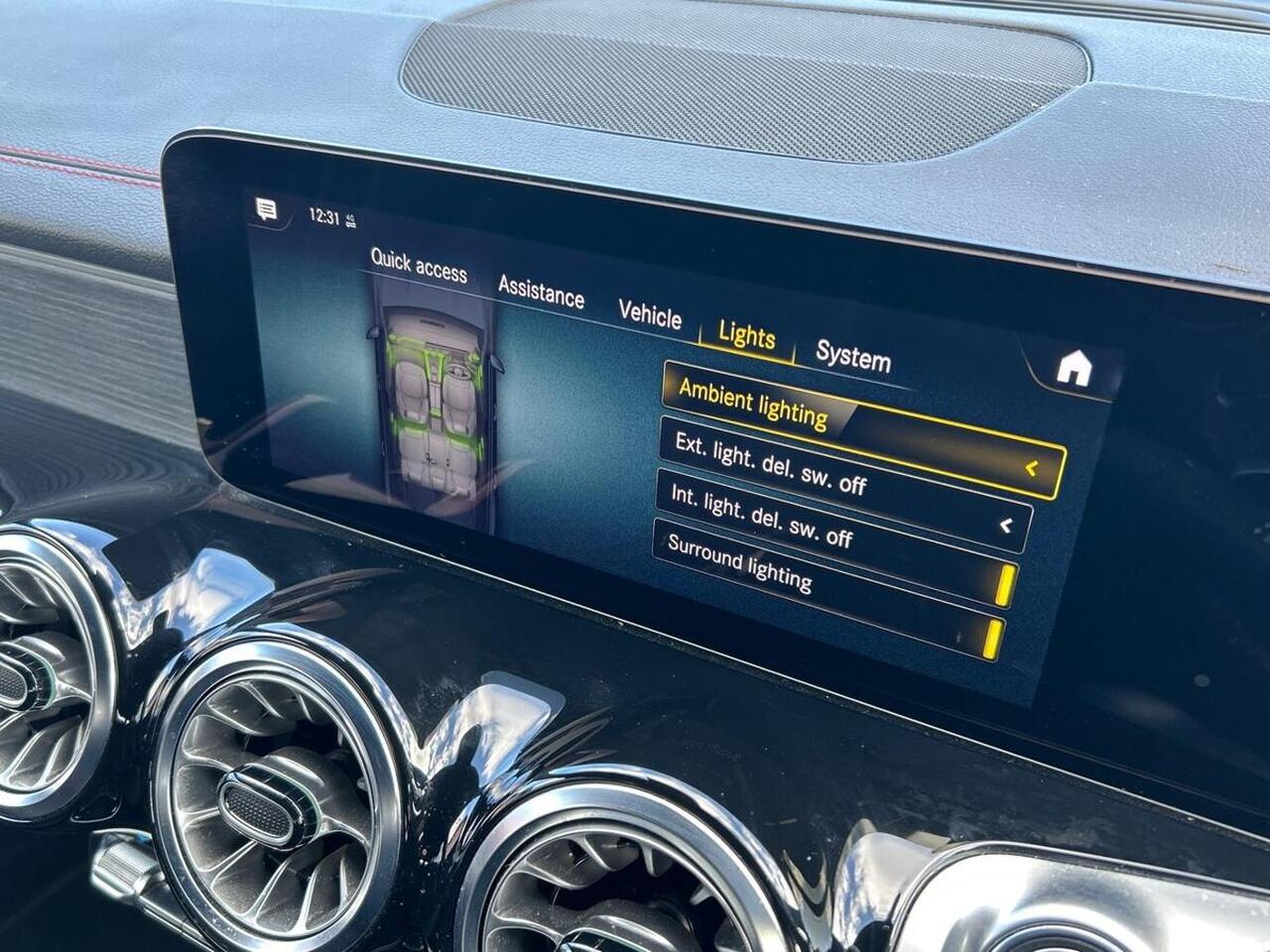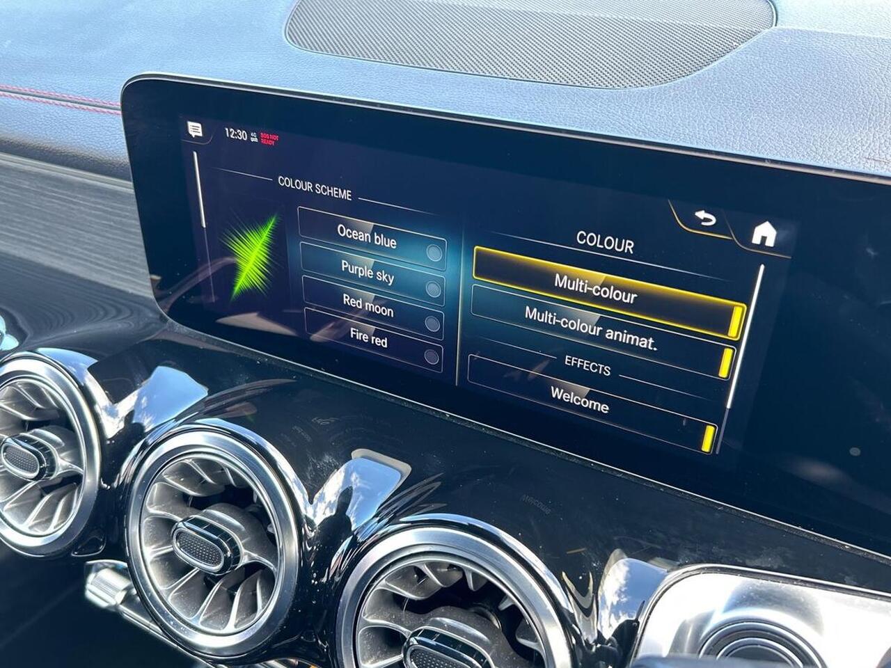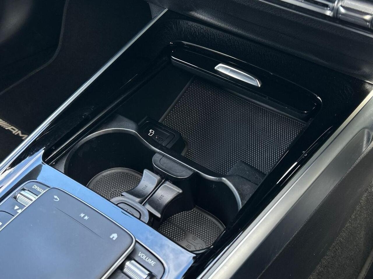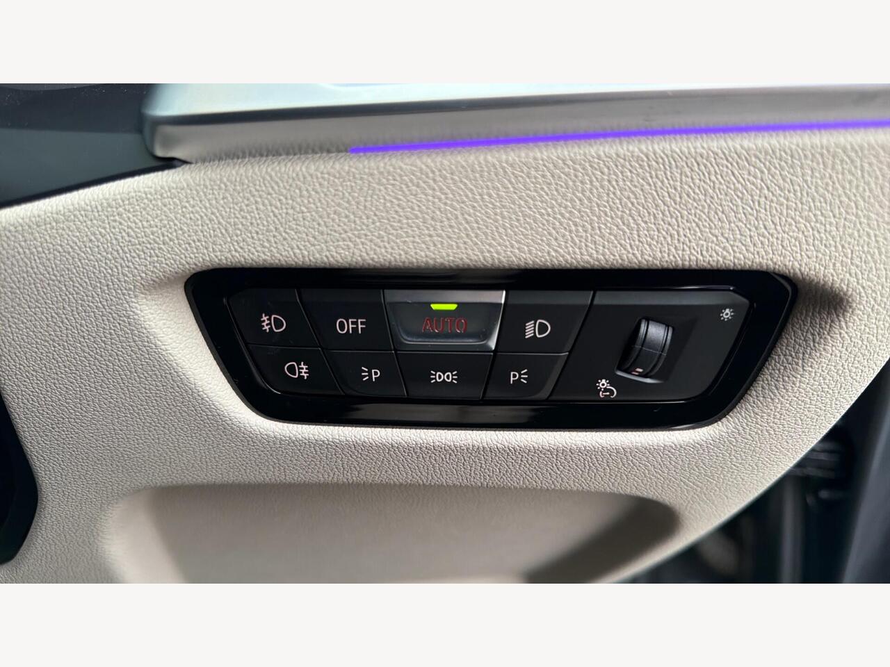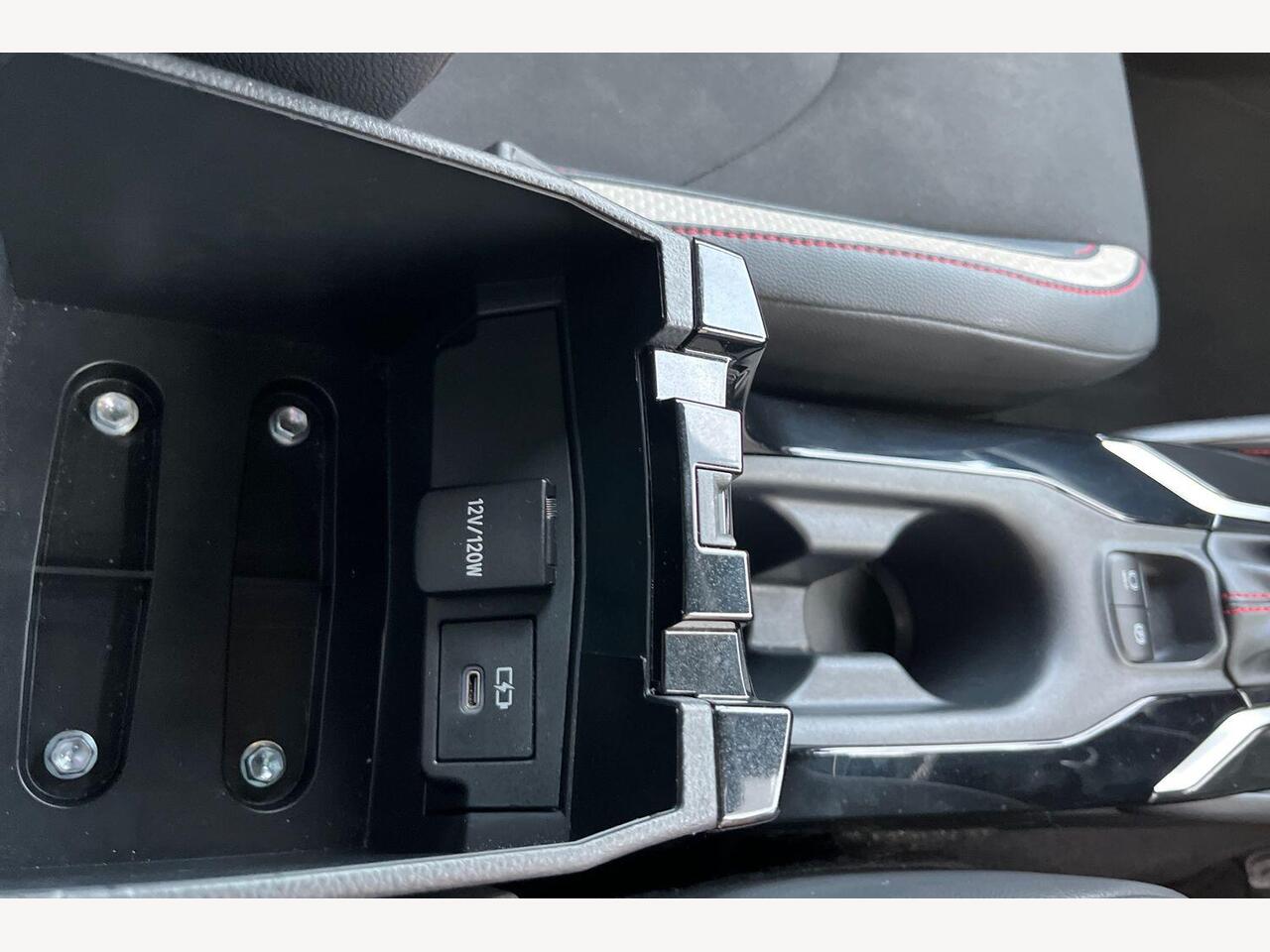 "White ambient lighting on open tray and front cup holder"
