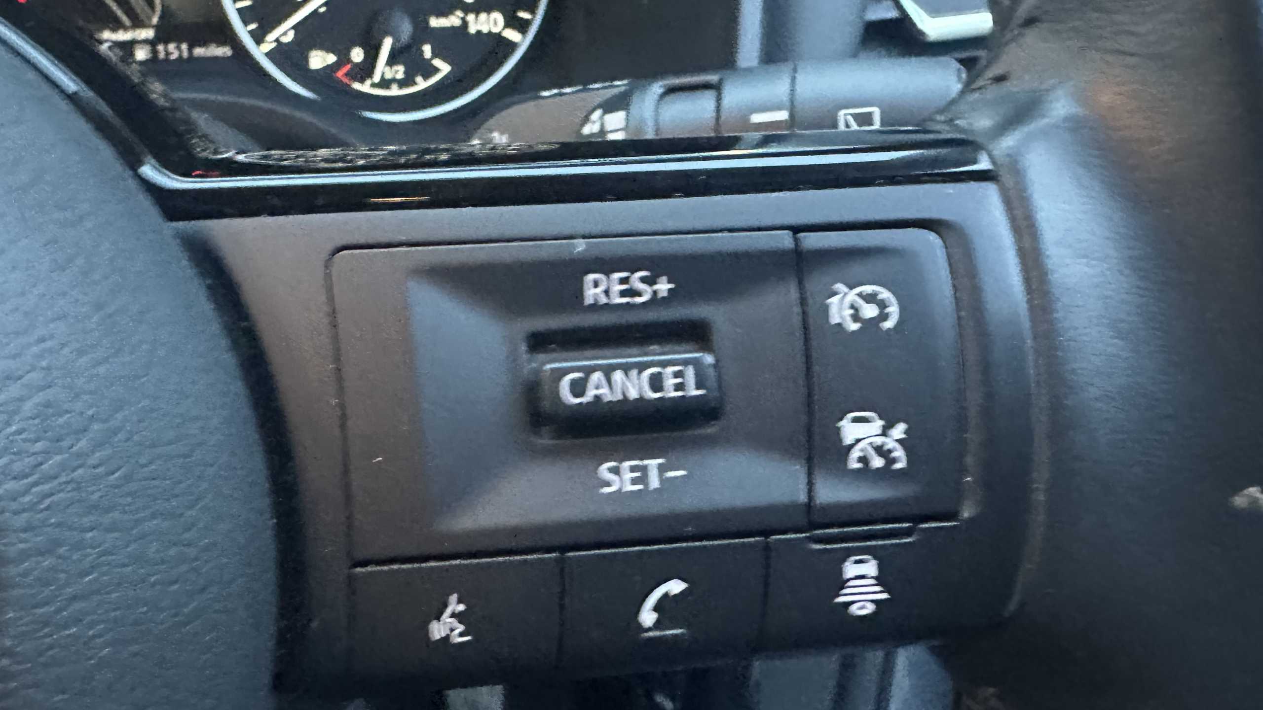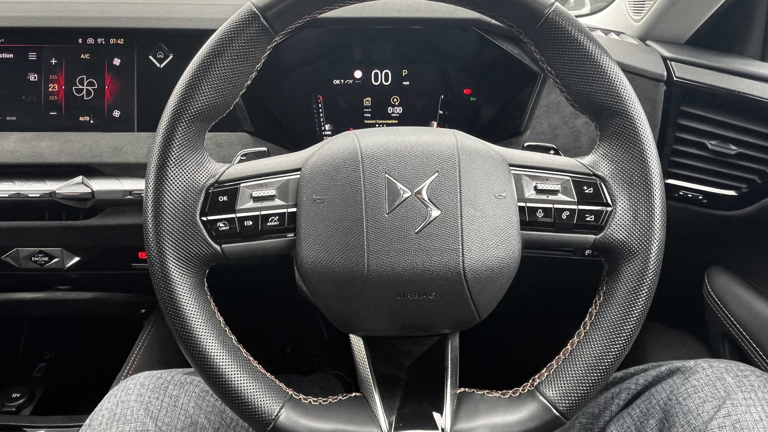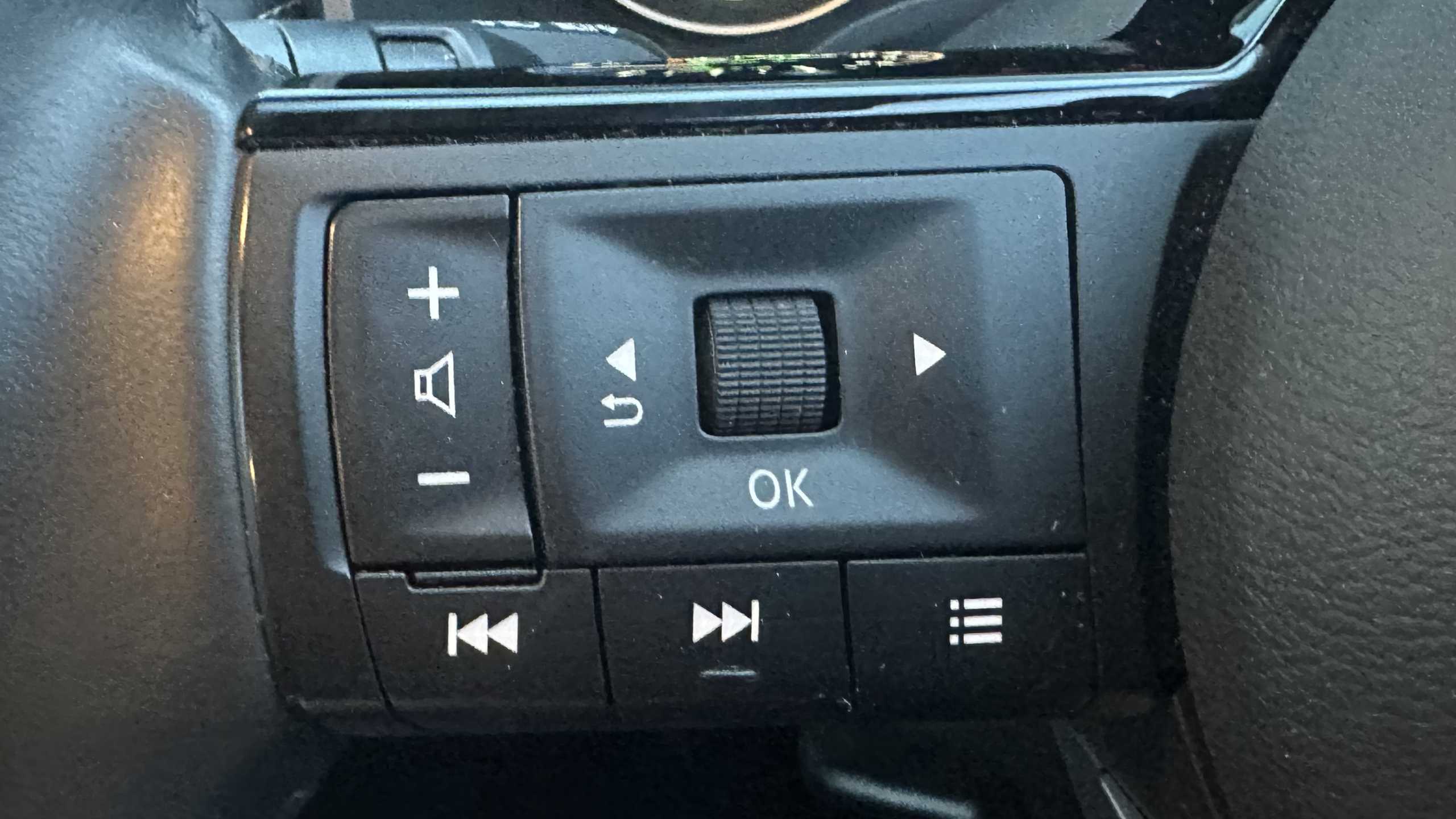 "Leather effect steering wheel with gloss black and chrome elements and integrated audio/telephone/cruise control/speed limit controls",