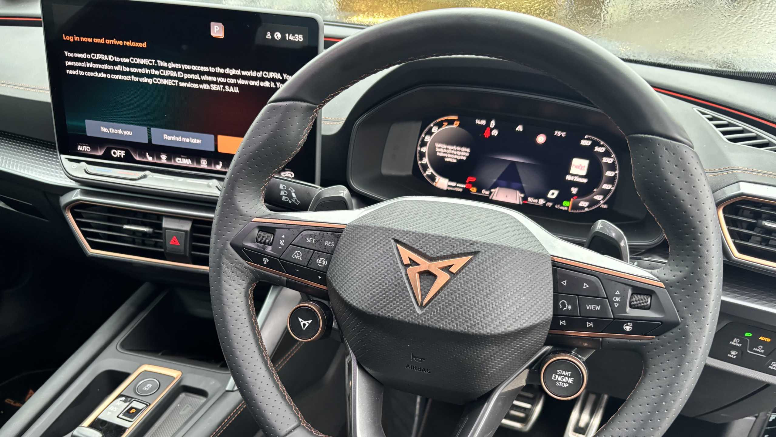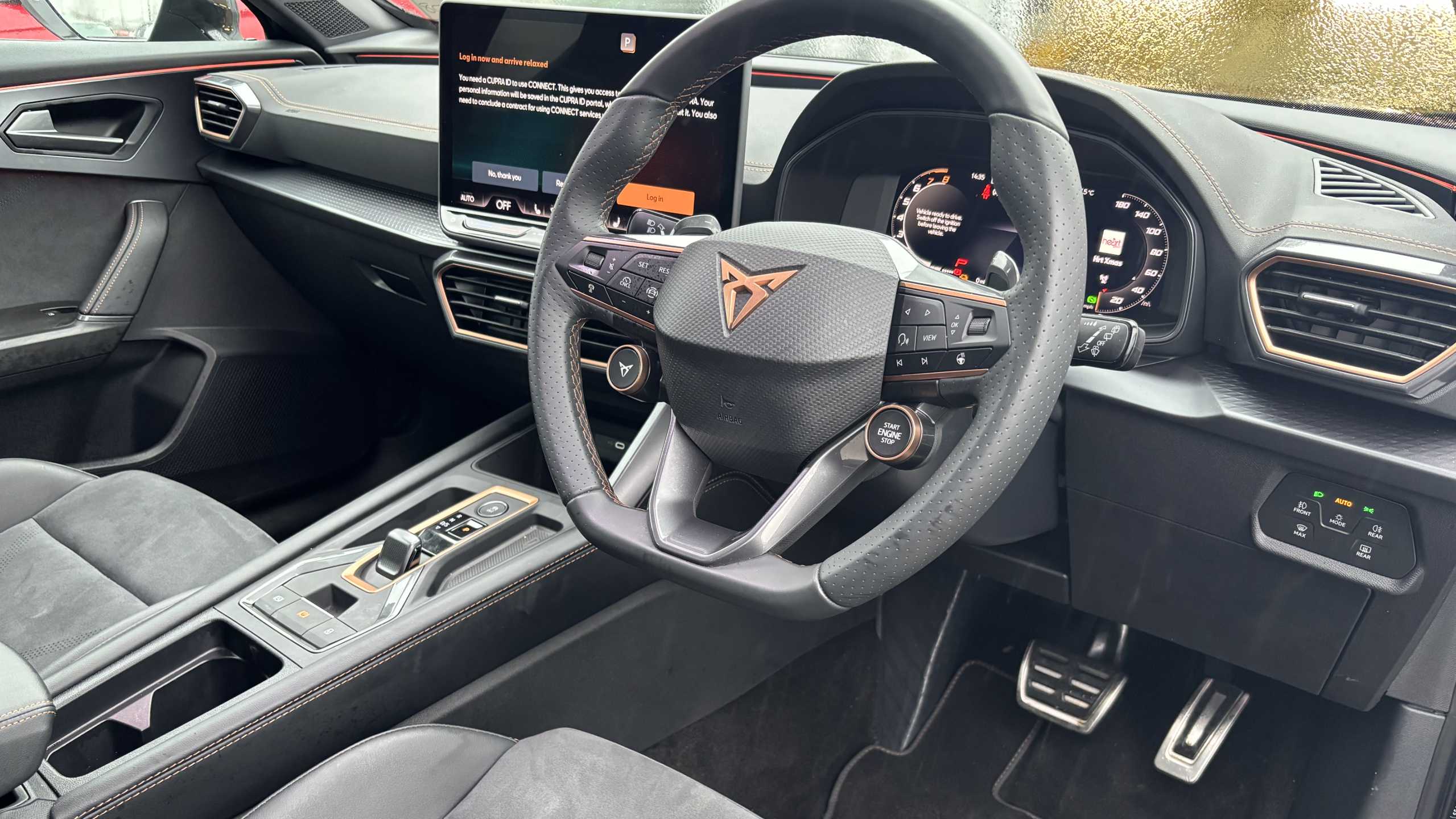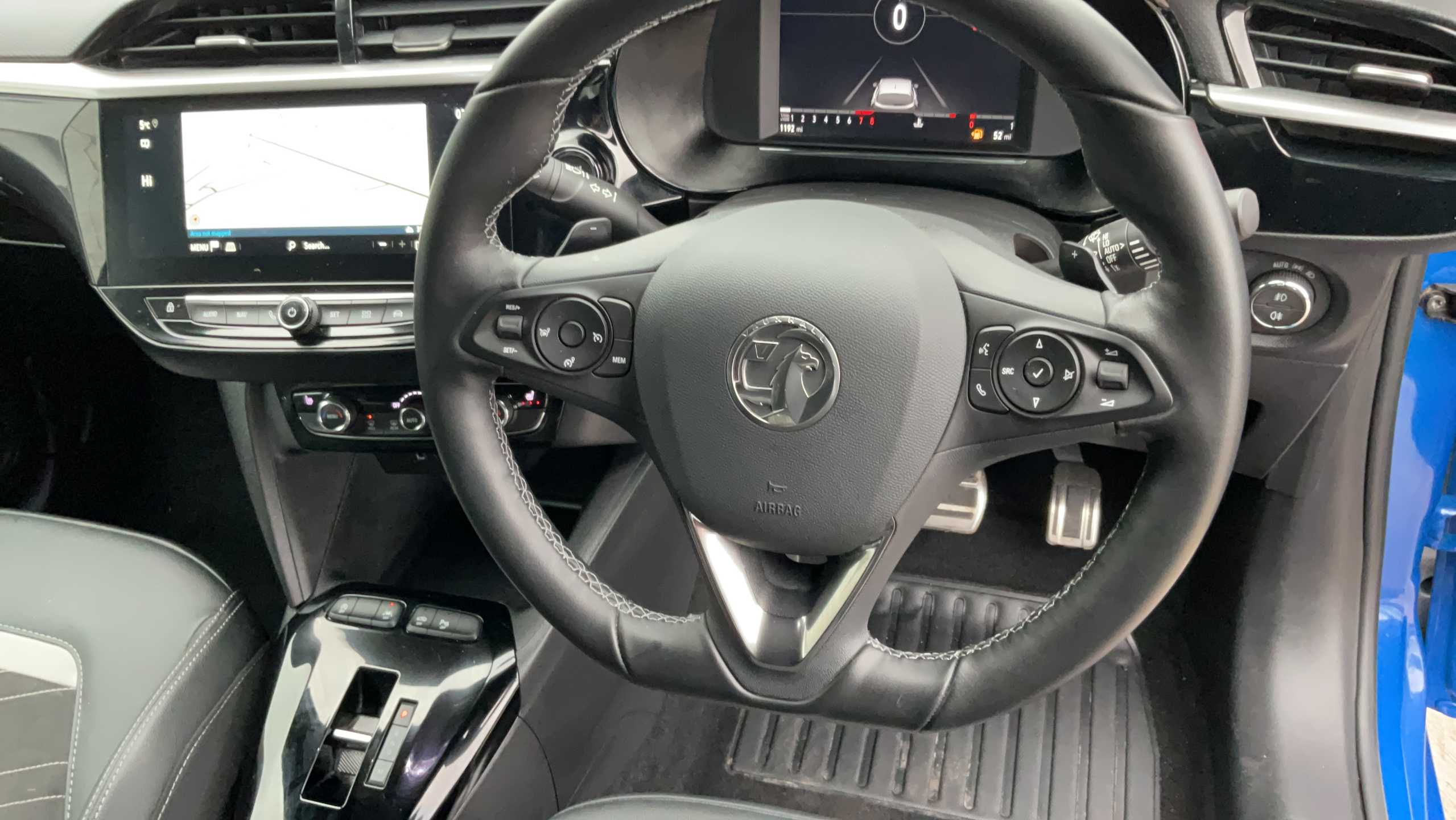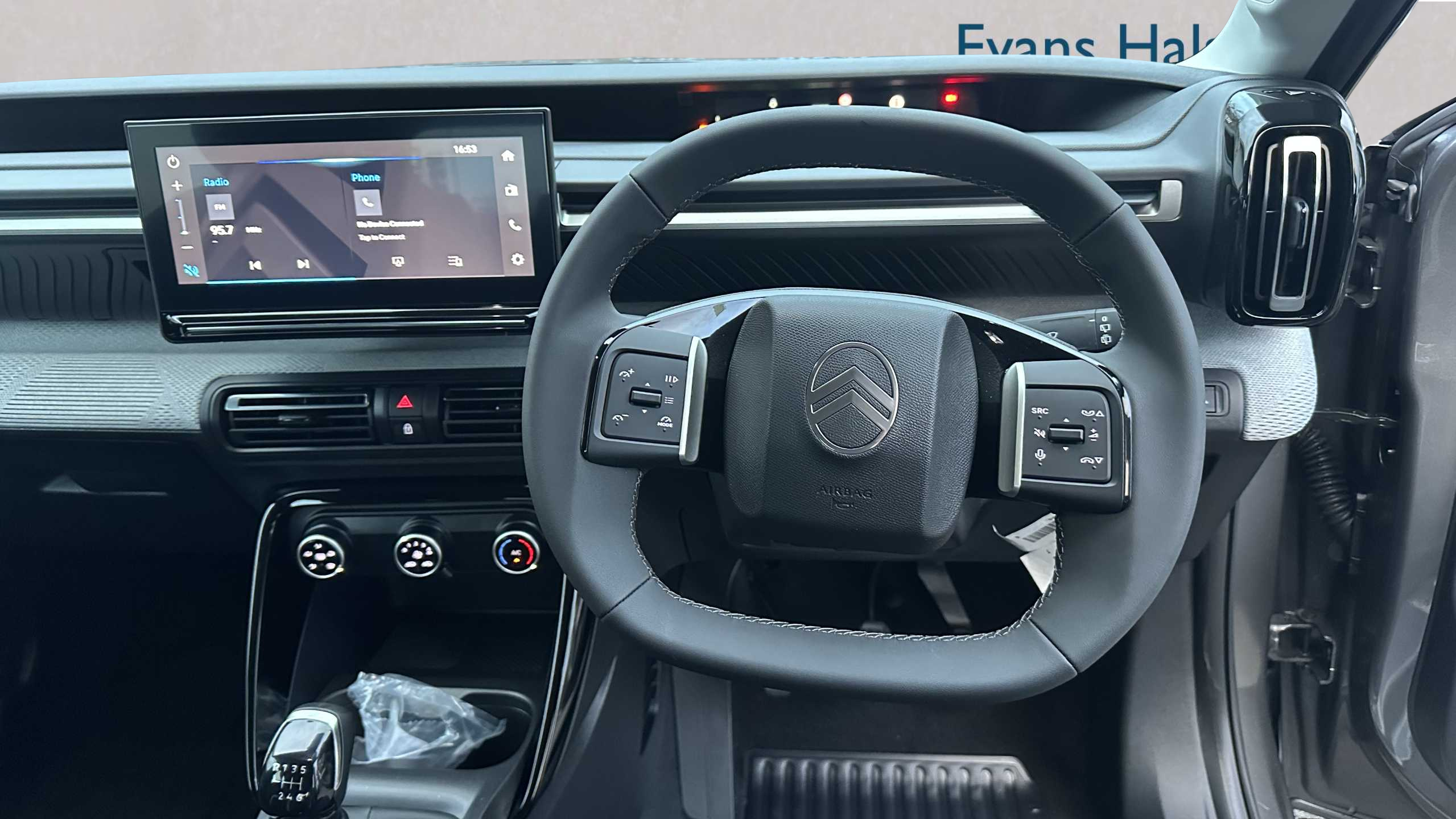 "Leather effect steering wheel with gloss black and chrome elements and integrated audio/telephone/cruise control/speed limit controls",