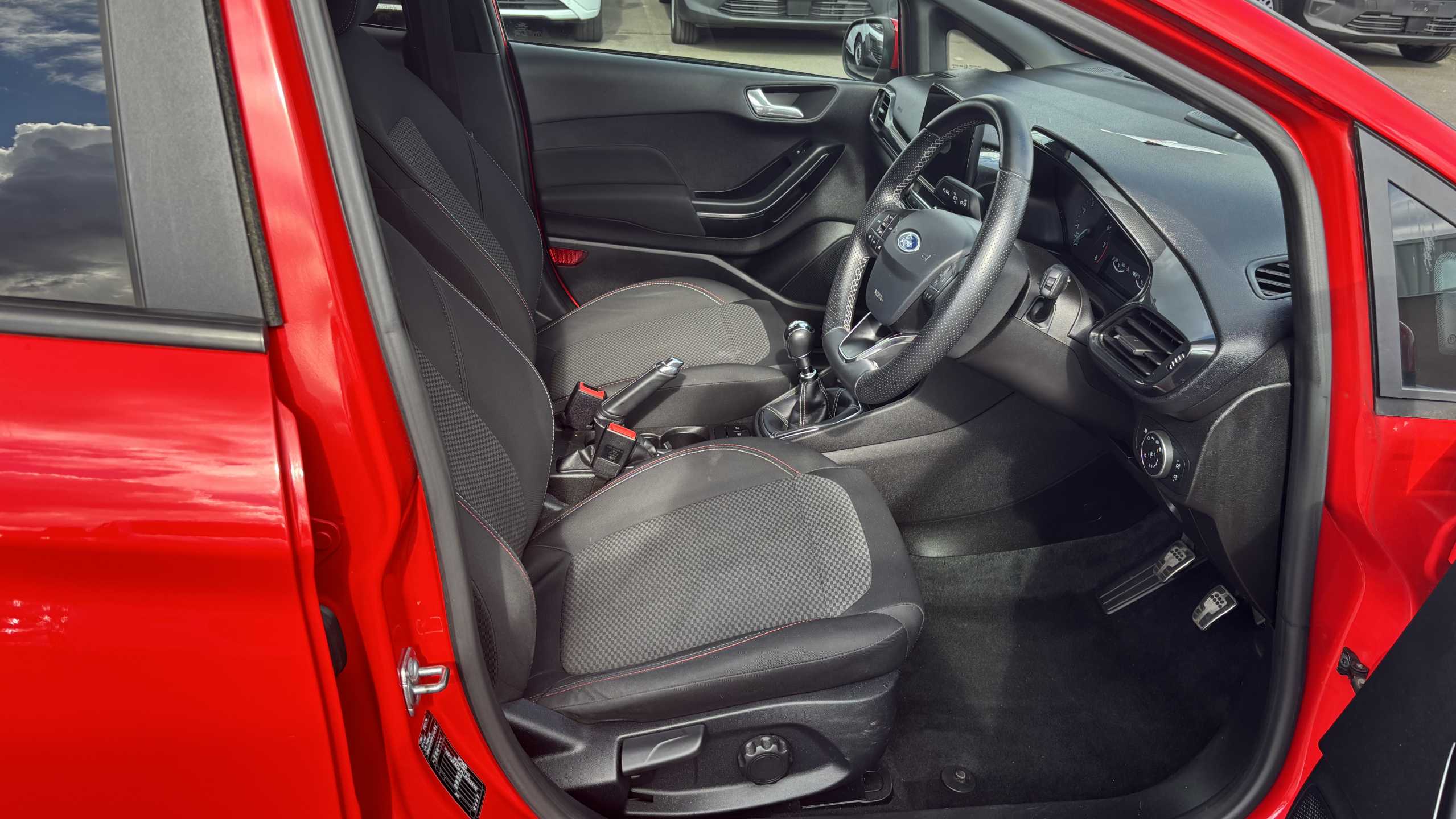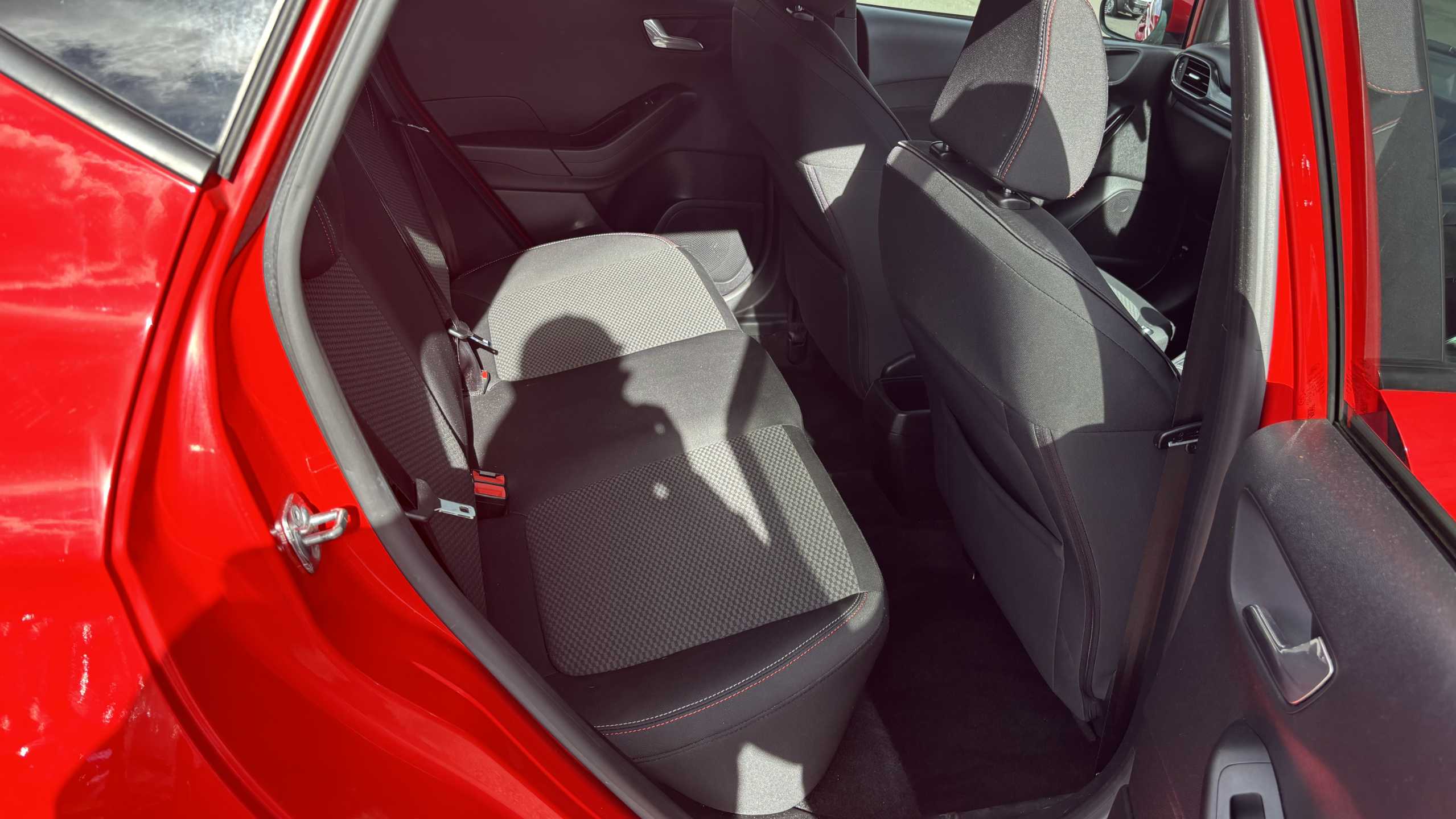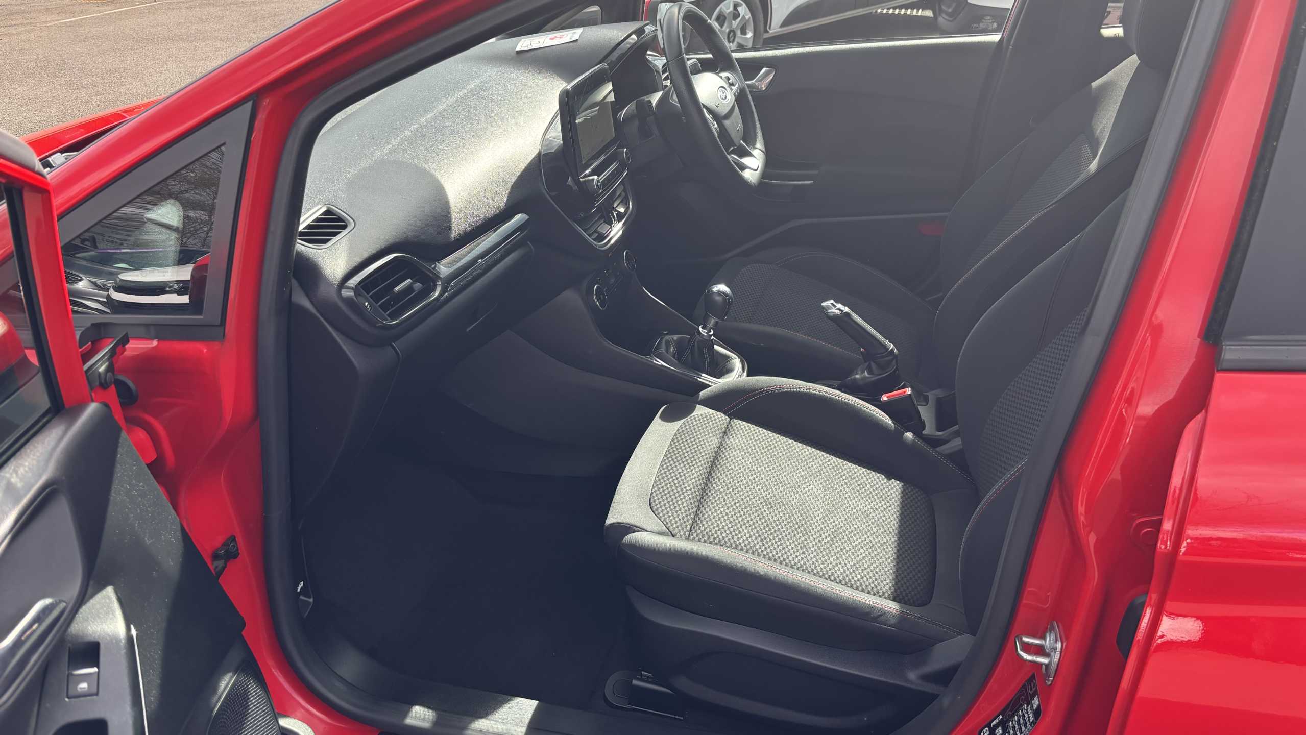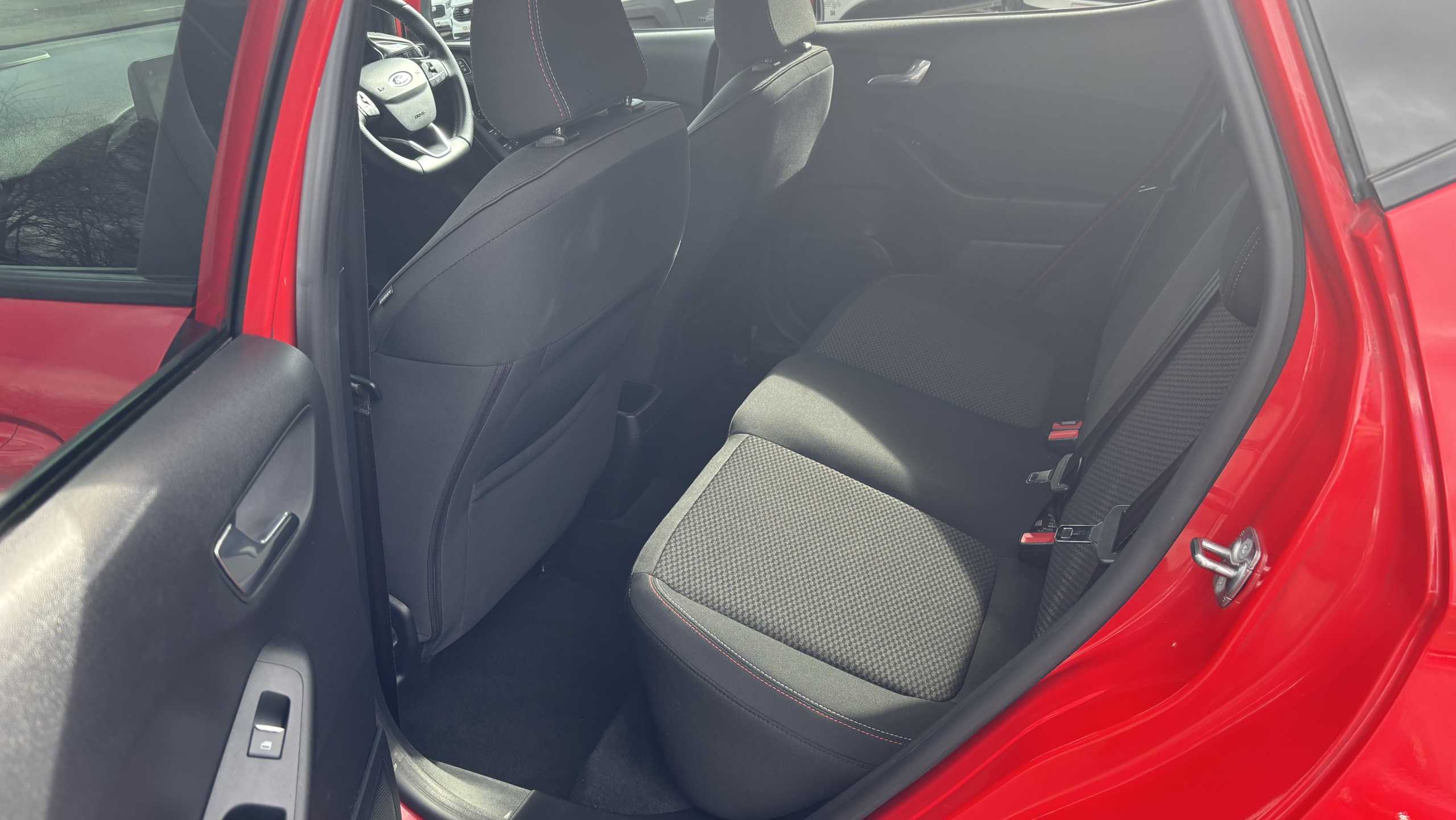 "features": "Bluetooth system, Digital clock, Easy fuel capless refuelling system, Eco mode, Ford SYNC 3 with 6.5\" TFT touchscreen, DAB radio and app link Android auto/Apple carplay, Lane keeping aid with lane departure warning, PAS, Selectable drive mode, Trip computer, Sports tuned suspension, 6 speakers, Aux input, 'Quickclear' heated windscreen/heated washer jets, Auto headlamps (on/off), Body colour large rear spoiler, Body colour side skirt, Body coloured bumpers, Body coloured door handles, Body coloured electrically operated and heated door mirrors with side indicators, Electrically operated front and rear windows with one touch opening and closing, Front variable intermittent wipers with electric wash, Halogen reflector headlamps, Heated rear window, LED daytime running lamp, LED front fog lamps with cornering function, Polished twin tailpipe, ST-Line upper and lower grille with full body styling kit and wing badges, Tailgate wash/wipe, 3 spoke flat bottomed leather steering wheel with red stitching, 60/40 split back and cushion rear seats with 2 height adjustable headrests, Alloy finish pedals, Aluminium gear knob, Centre console with armrest, Cloth upholstery with red stitching, Dark headliner, Driver's lumbar support, Driver's seat manual height adjust, Front floor mats, Height adjustable front headrests, Isofix child seat preparation, Manual air conditioning, Reach + rake adjustable steering column, Rear centre headrest, Red stitching on steering wheel, ABS+Electronic Brake force Distribution, Auto hold function, Driver airbag, Electronic parking brake, Electronic stability control, Front and rear seatbelt reminder, Front inertia reel height adjustable seatbelts with pre-tensioners, Front passenger airbag, Front side airbags, Hill start assist, Passenger airbag deactivate switch, Post collision braking, Pre collision assist with autonomous emergency braking and pedestrian/cyclist detection, Side curtain airbags, Three rear inertia reel lap/diagonal seatbelts, Tyre pressure monitoring system, Keyless start with 'Ford Power' starter button, MyKey system, Remote central locking & engine immobiliser, Thatcham category 1 alarm, Contrast stitching - Red, 17\" 5x2 spoke alloy wheels with rock metallic finish, Mini steel spare wheel, ",