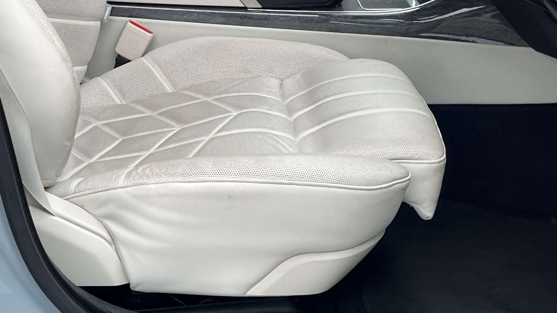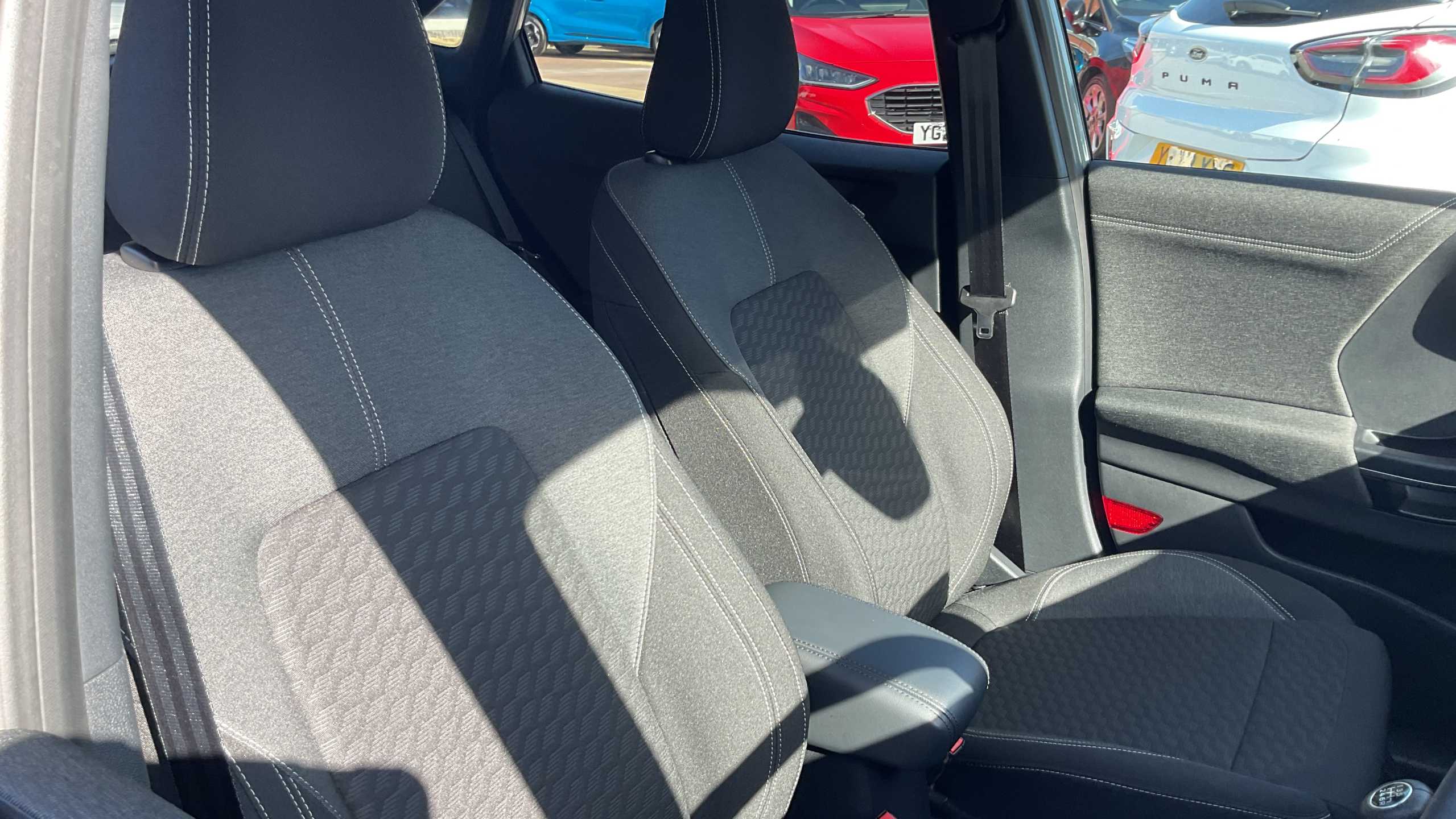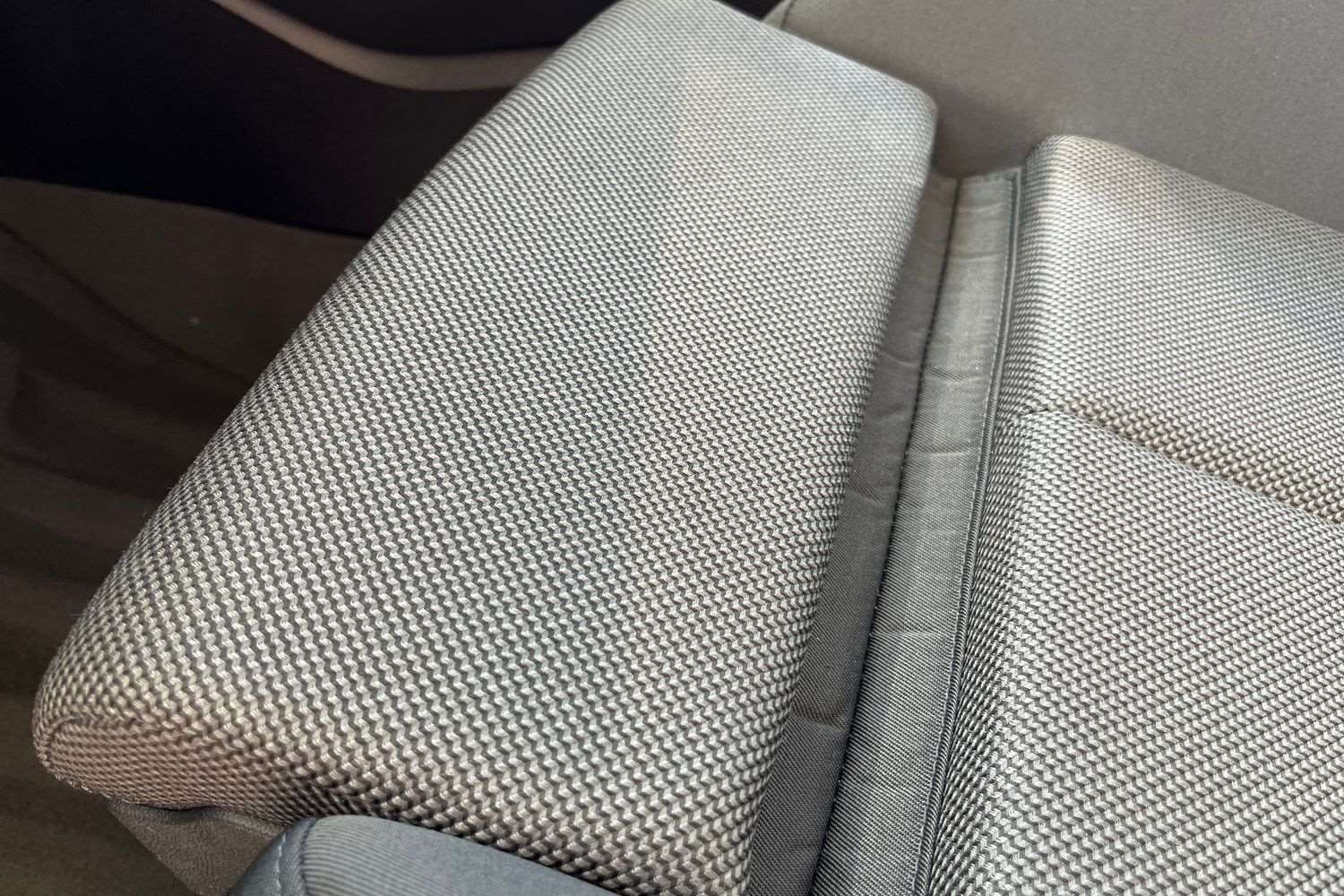 "Cloth upholstery with red stitching",