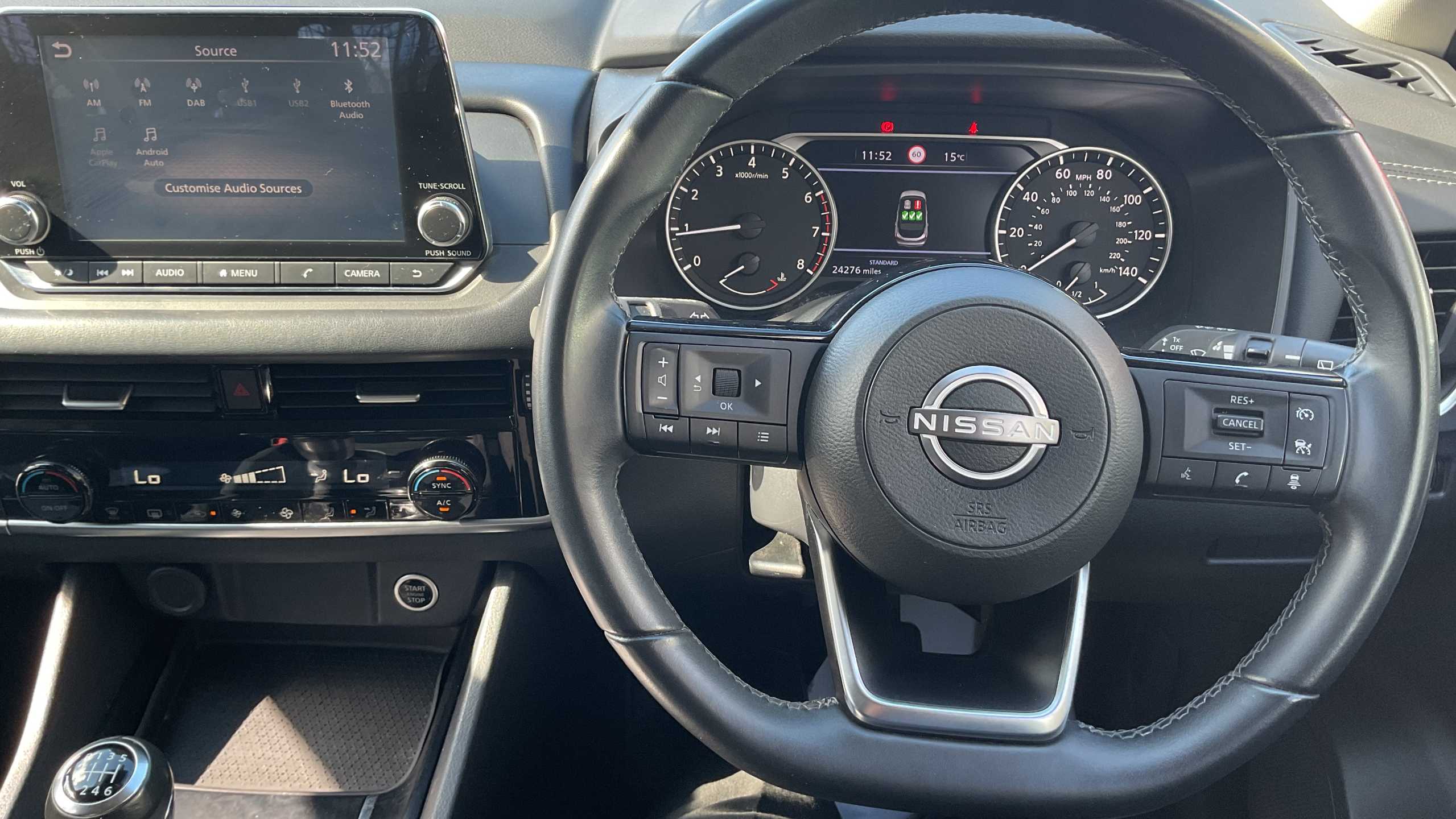 "3 spoke flat bottomed leather steering wheel with red stitching",