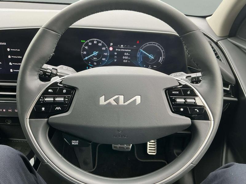 "features": "10.25\" Supervision colour cluster display, 10.25\" touchscreen satellite navigation, Adaptive smart cruise control function (SCC) with stop and go, Apple car play/Android Auto with voice control, Blind spot collision avoidance assist, Charging indicator on dashboard, Digital clock, Drive mode select (Eco, normal, sport, snow), E-call, Emergency stop signalling system, Forward Collision-Avoidance Assist (FCA) 2.0 - City/Pedestrian/Cyclist/Junction turning & crossing, Front parking sensors, Head up Display, Highway Driving Assist (HDA 2.0), Intelligent speed limit assist, Kia Connect (UVO), Lane Following Assist (LFA), Lane keep assist, Motor driven power steering, Parking collision avoidance assist (PCA), Power opening/closing tailgate, Rear parking sensors, Remote smart parking assist, Reversing camera with dynamic guide lines, Trip computer with distance/fuel consumption/average speed, Vehicle-to-device (V2D), Wireless Smartphone charger, 11 kW AC onboard charger, Battery heating system, Front Grille Charging Port, 'Shark fin' mobile antenna, 2 type C USB ports on front seats, 2 USB ports in centre console including 1 type C, Bluetooth with music streaming, DAB Digital radio, Steering wheel mounted controls, Acoustic windshield, All round electric windows with drivers and front passenger auto up/down and safety function, Auto dimming rear view mirror, Automatic defog system, Automatic headlight control system, Black grille with chrome surround, Body colour bumpers, Body colour exterior door handles, Deluxe door scuff plates, Dual LED headlights (low and high projection), Electric heated door mirrors, Electrically folding door mirrors, Front and rear chrome skid plates, Front fog lights, Heated rear window with timer, High gloss black door mirrors, LED daytime running lights, LED rear combination lights, LED third brake light, One touch single tilting/sliding power sunroof, Privacy glass - Rear windows and tailgate, Rain sensing front wipers, Rear fog lights, Rear side wing doors, Rear spoiler, Rear wiper, Roof rails, Solar glass windscreen, Welcome and follow-me home light functionality, Windscreen Washer Level Warning, 12V socket in front, 12V socket in luggage compartment, 3 seat bench in 2nd row, 60:40 split remote folding rear seats, Air filter, All-round height adjustable headrests, Aluminium pedals, Artificial leather centre console storage box, Artificial leather steering wheel, Centre console cupholder, Chrome coating interior door handles, Driver and front passenger power adjusted seat, Driver power adjusted memory seat, Driver/passenger sunvisors with illuminated vanity mirrors, Drivers seat power lumbar support, Dual zone automatic air conditioning, Front and rear door storage, Heated front seats, Heated outer rear seats, Heated steering wheel, Illuminated glovebox, Interior door lock/unlock function, ISOFIX Child seat top tethers and anchor fixings, LED overhead console, 2nd row and luggage lamp, Luggage area load cover, Luggage board, Paddle shifts, Passenger premium relaxation seat, Power adjustable lumbar support on front passenger seat, Seatback pocket - driver, Seatback pocket - front passenger, Shift by wire SBW, Single front passenger seat, Tilt/telescopic adjustable steering wheel, Ventilated front seats, Ventiliation ducts to rear compartment, Towing pack - Niro, 3 point seatbelts on all seats, ABS, Automatic unlocking of doors in case of impact, Centre side front airbags, Curtain and side airbags, Drivers knee airbag, Dual shell horn, Electric parking brake with auto hold function, Electronic stability control, Front passenger airbag deactivation, Height adjustable front seatbelts, Hill start assist control (HAC), Manual rear child locks, Rear seat alert system, Traction control, Tyre pressure monitoring system, Alarm system and engine immobiliser, Deadlocks, Engine Start/Stop Button with Smart Entry System, Locking wheel nuts, Visible vehicle identification number, Warranty - 7 Years/ 100,000 miles, Metal chopped carbon centre fascia, 17\" Alloy wheels, Tyre mobility kit, ",