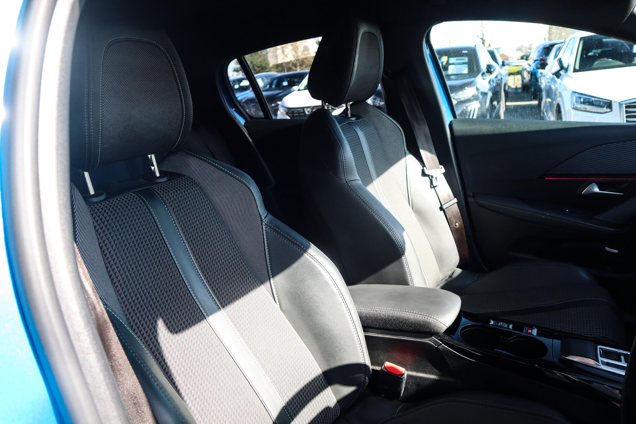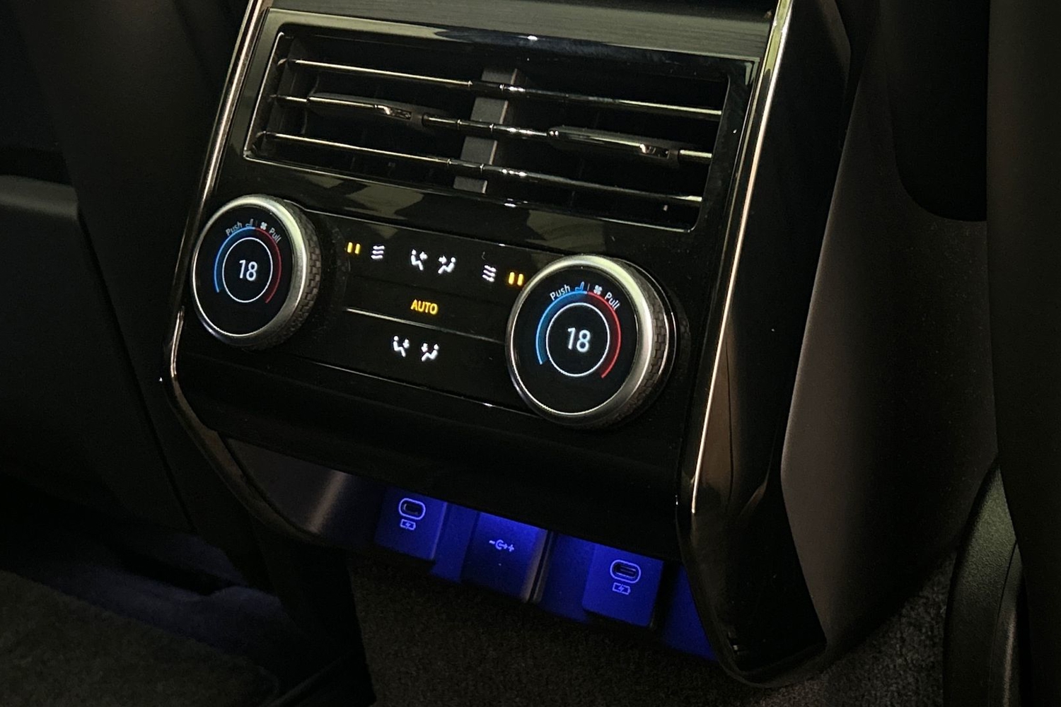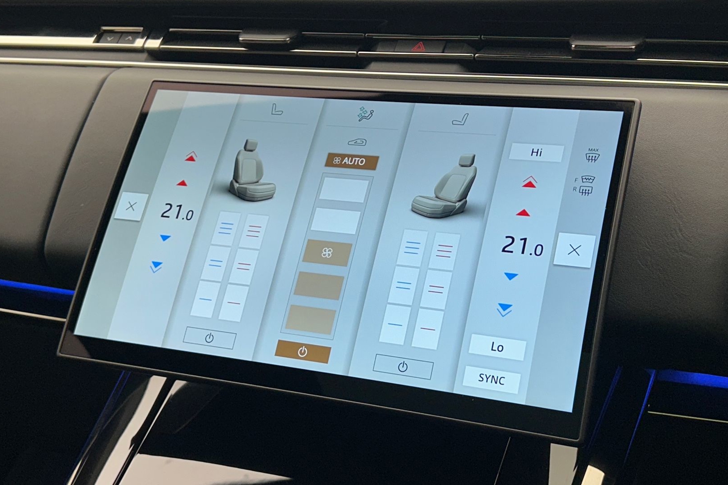 "Blue ambient lighting to front door panels, central storage and cupholders",