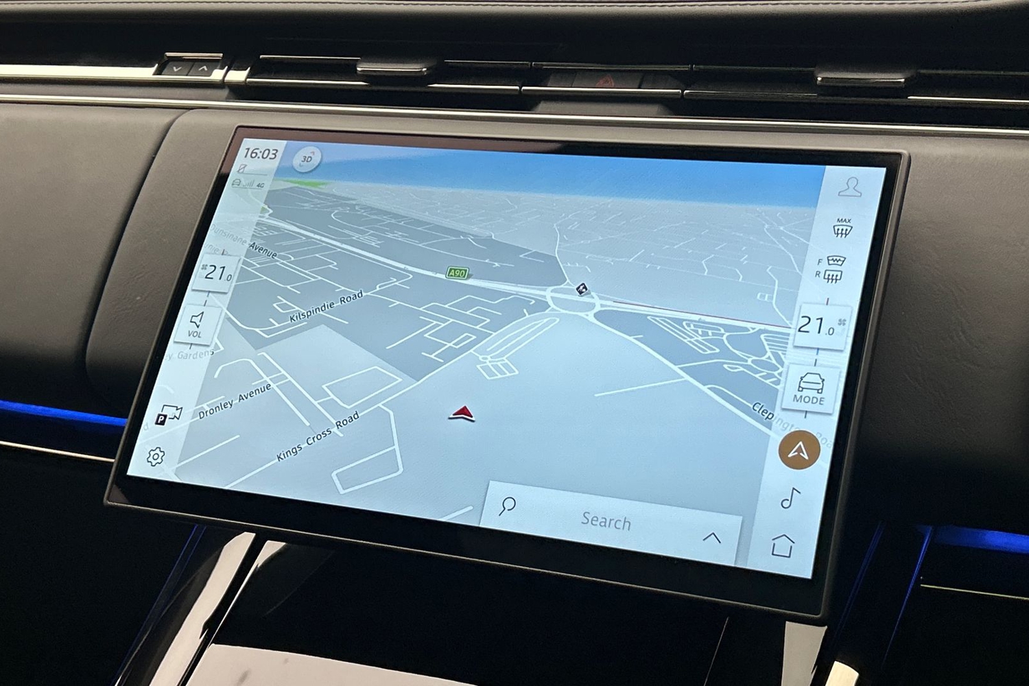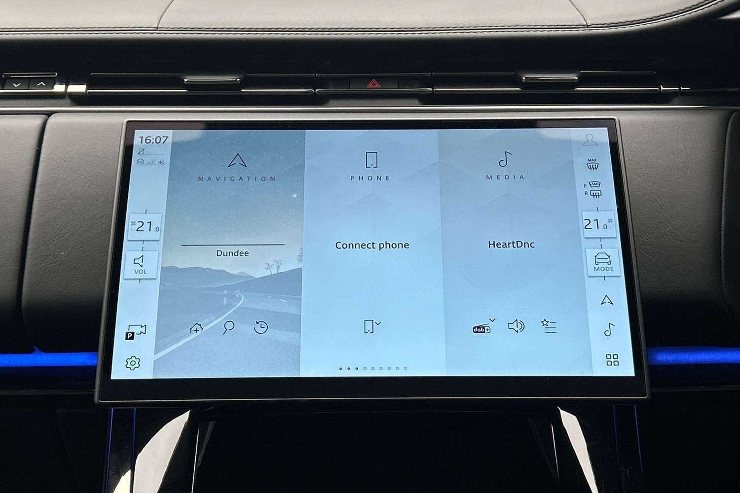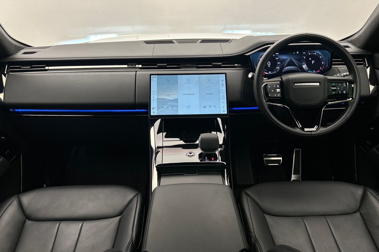 "Blue ambient lighting to front door panels, central storage and cupholders",