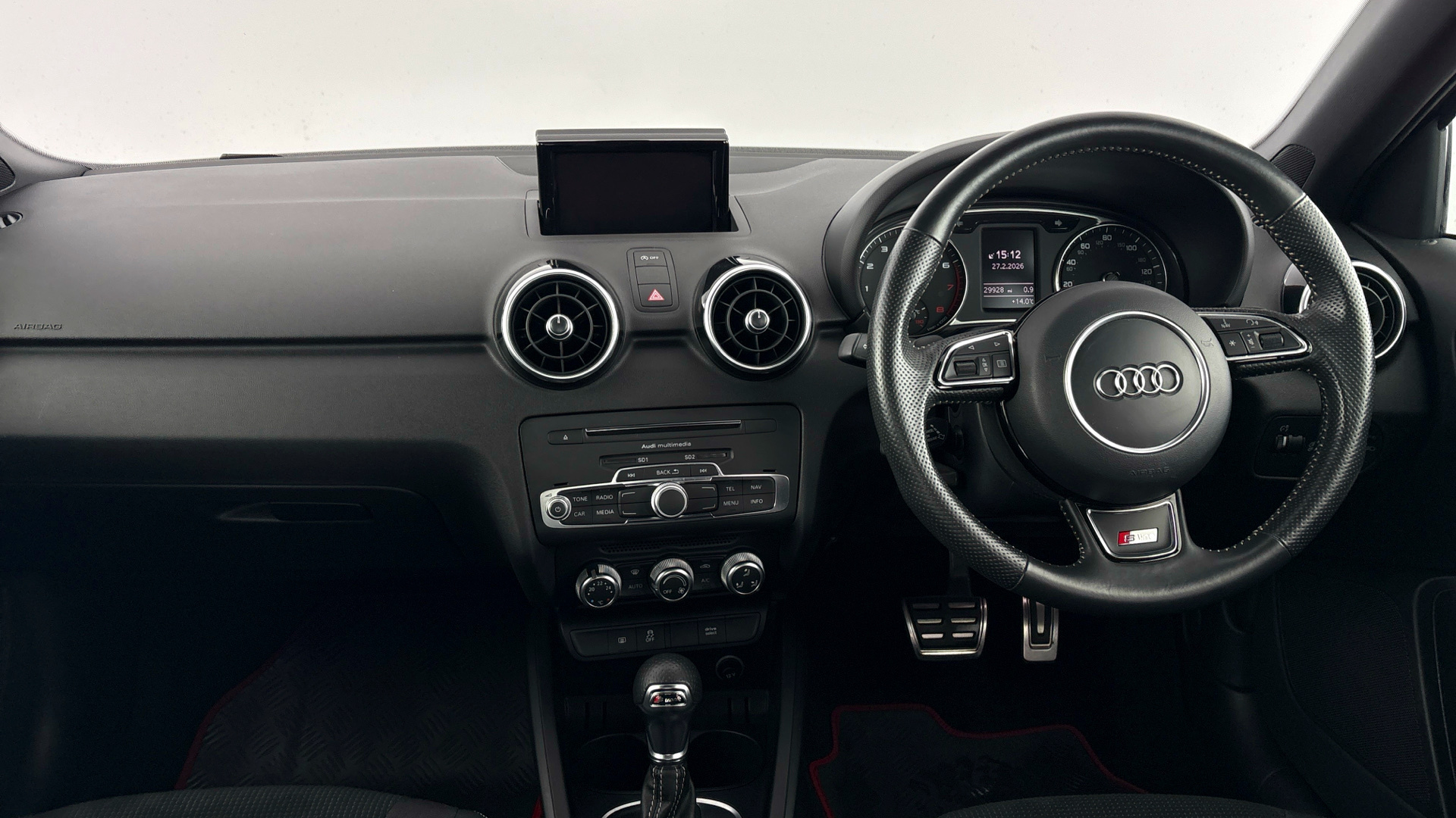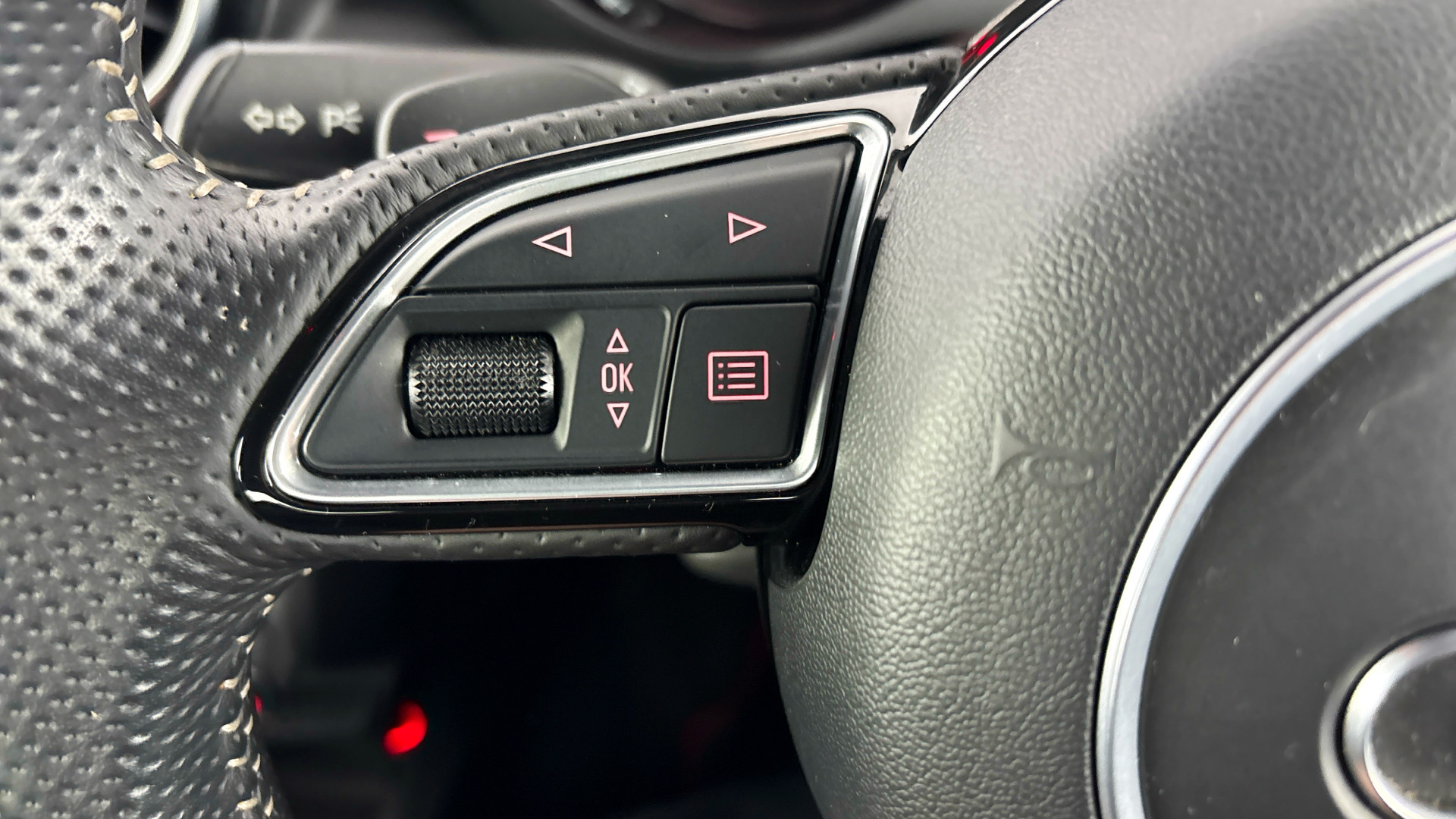 "Three spoke M sport design multi function leather steering wheel in unique red stitching",