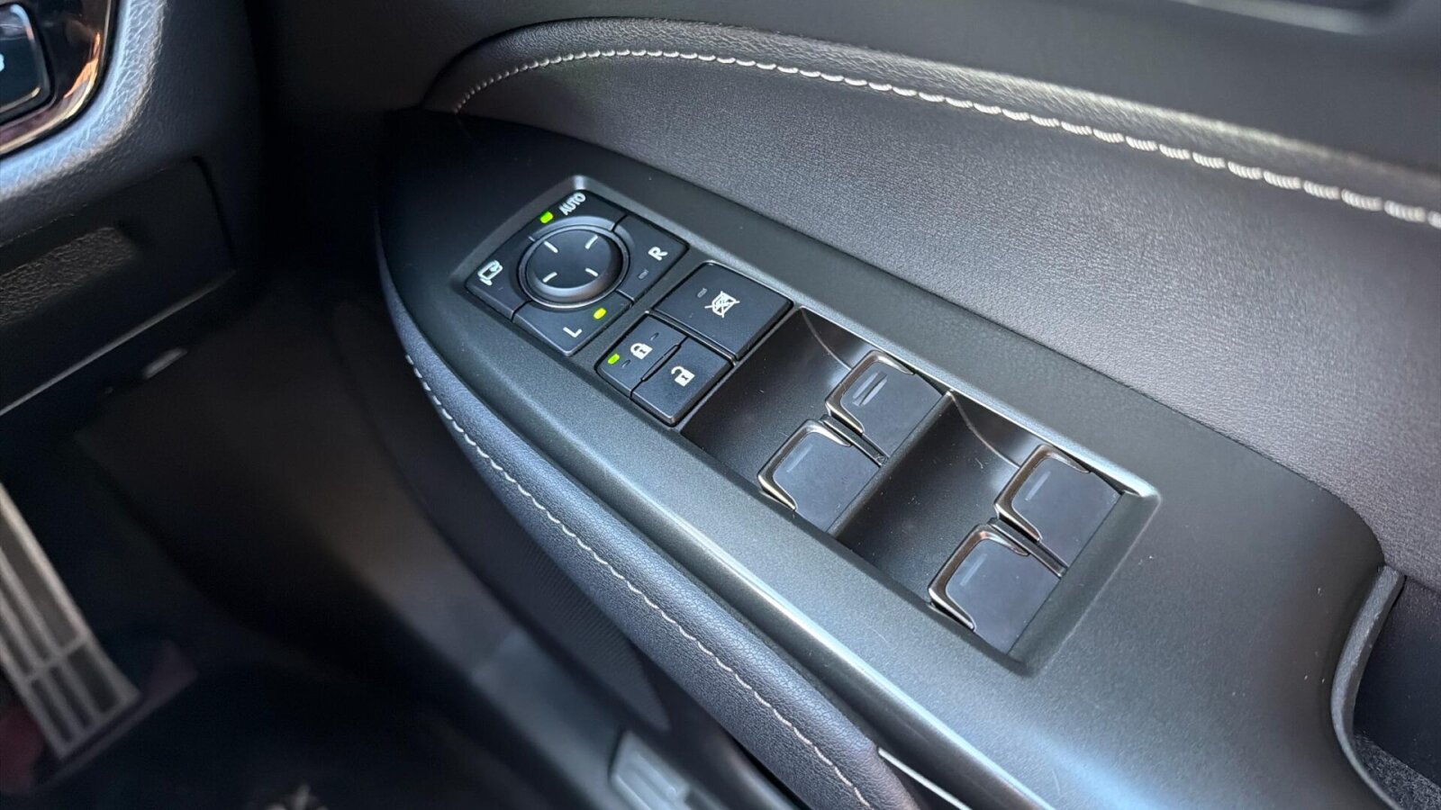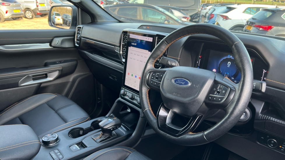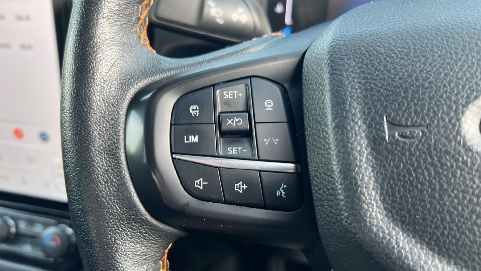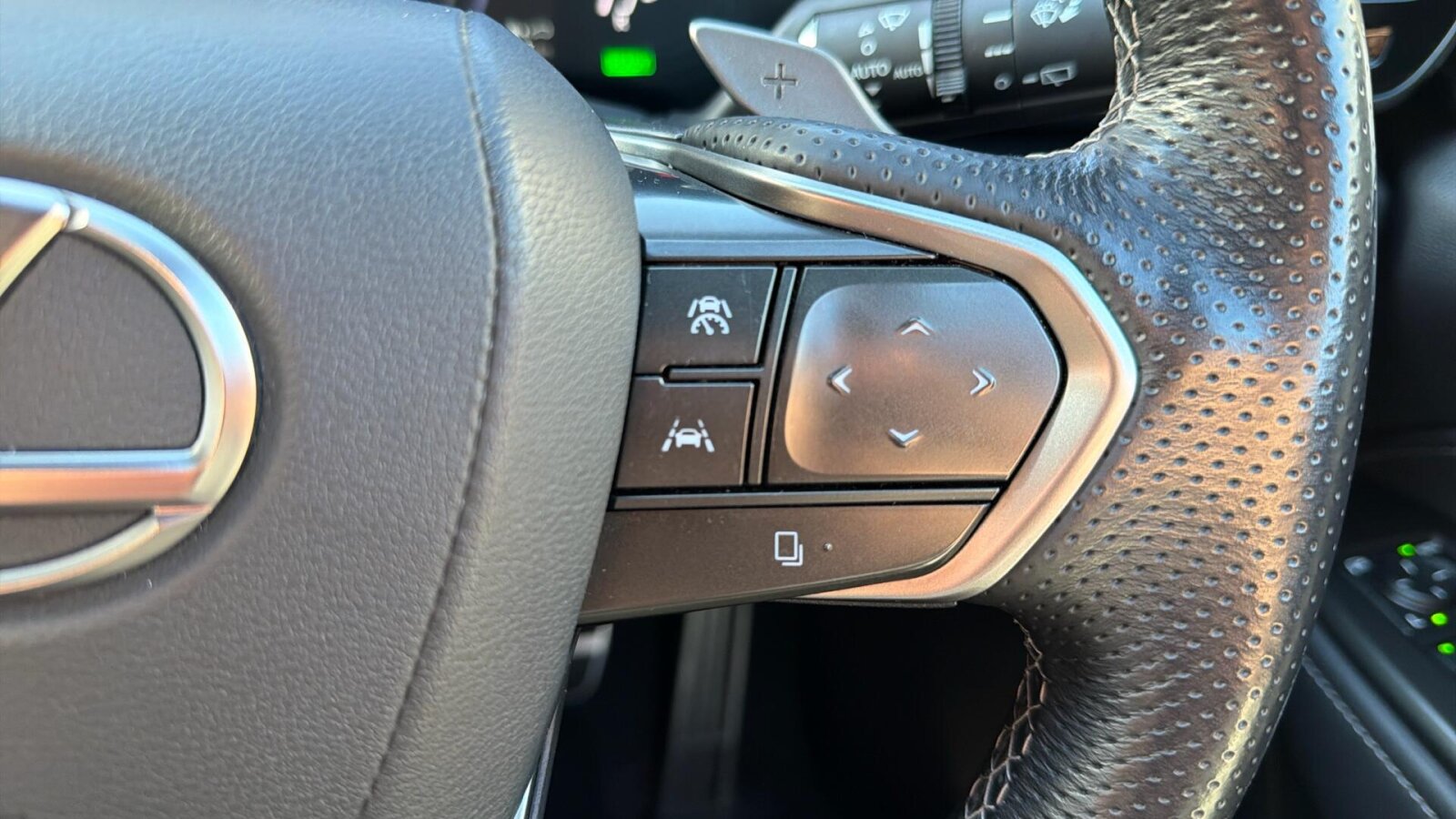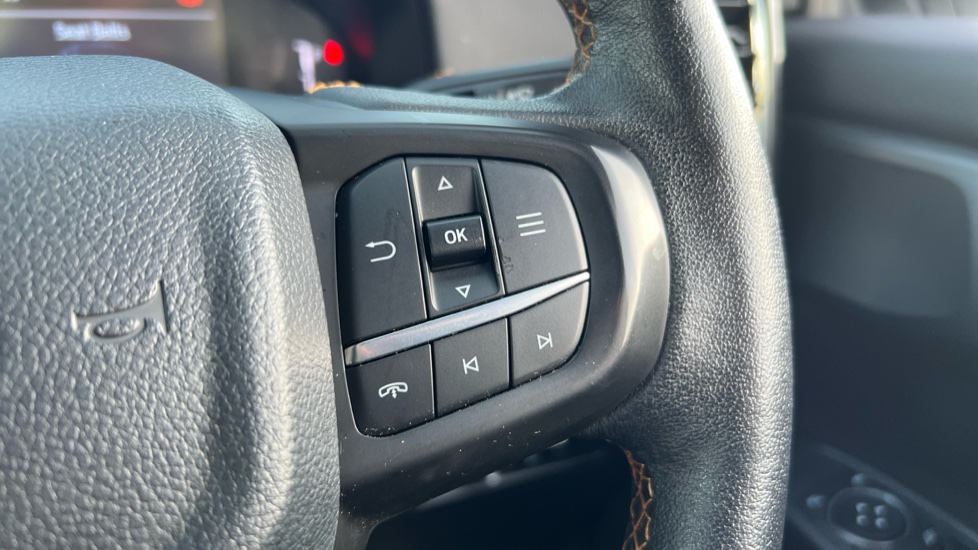"Leather steering wheel with detail stitch",