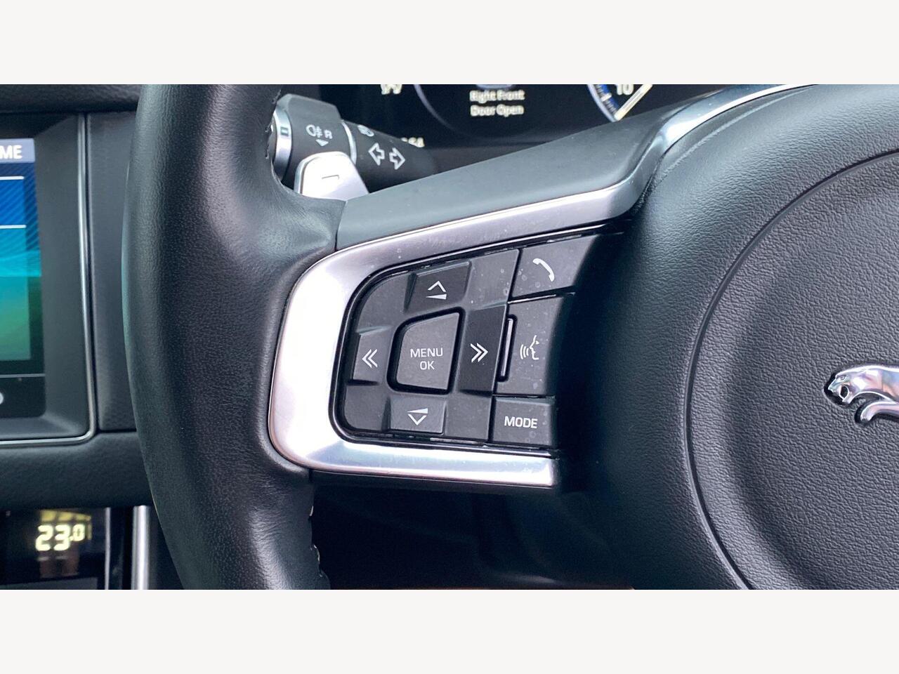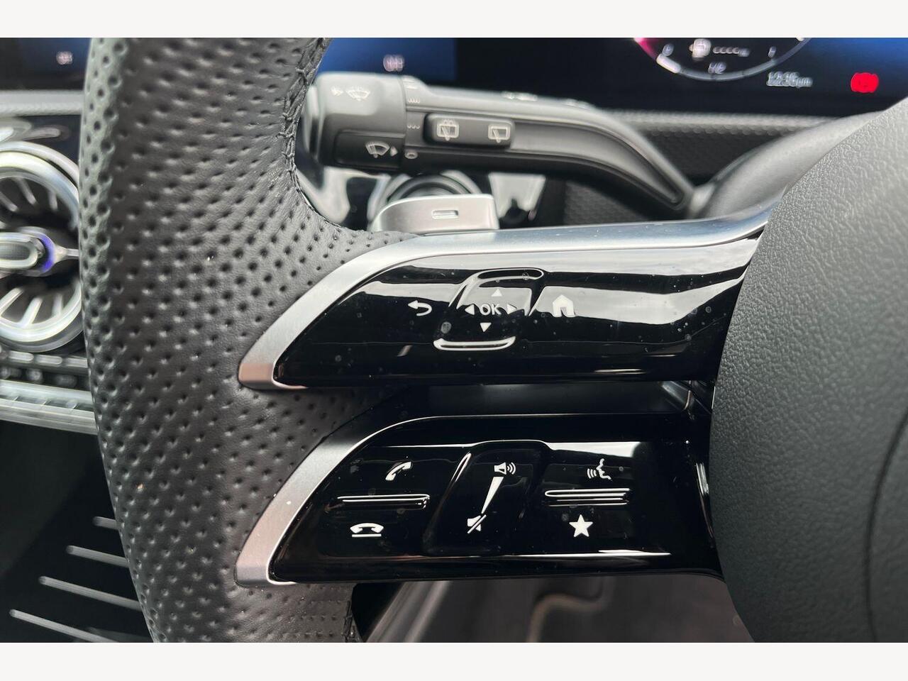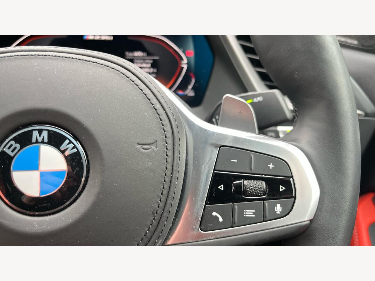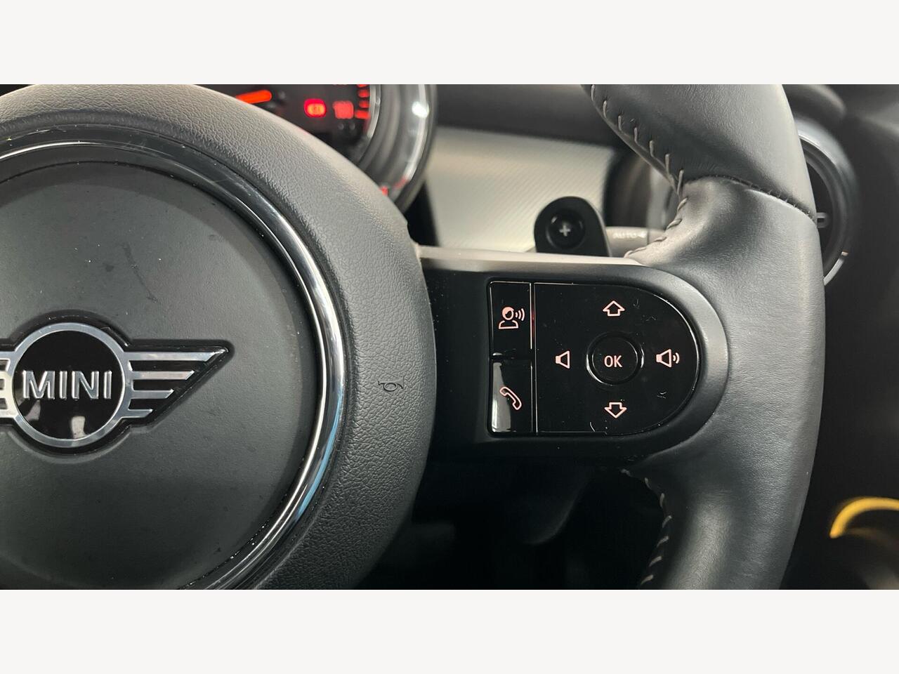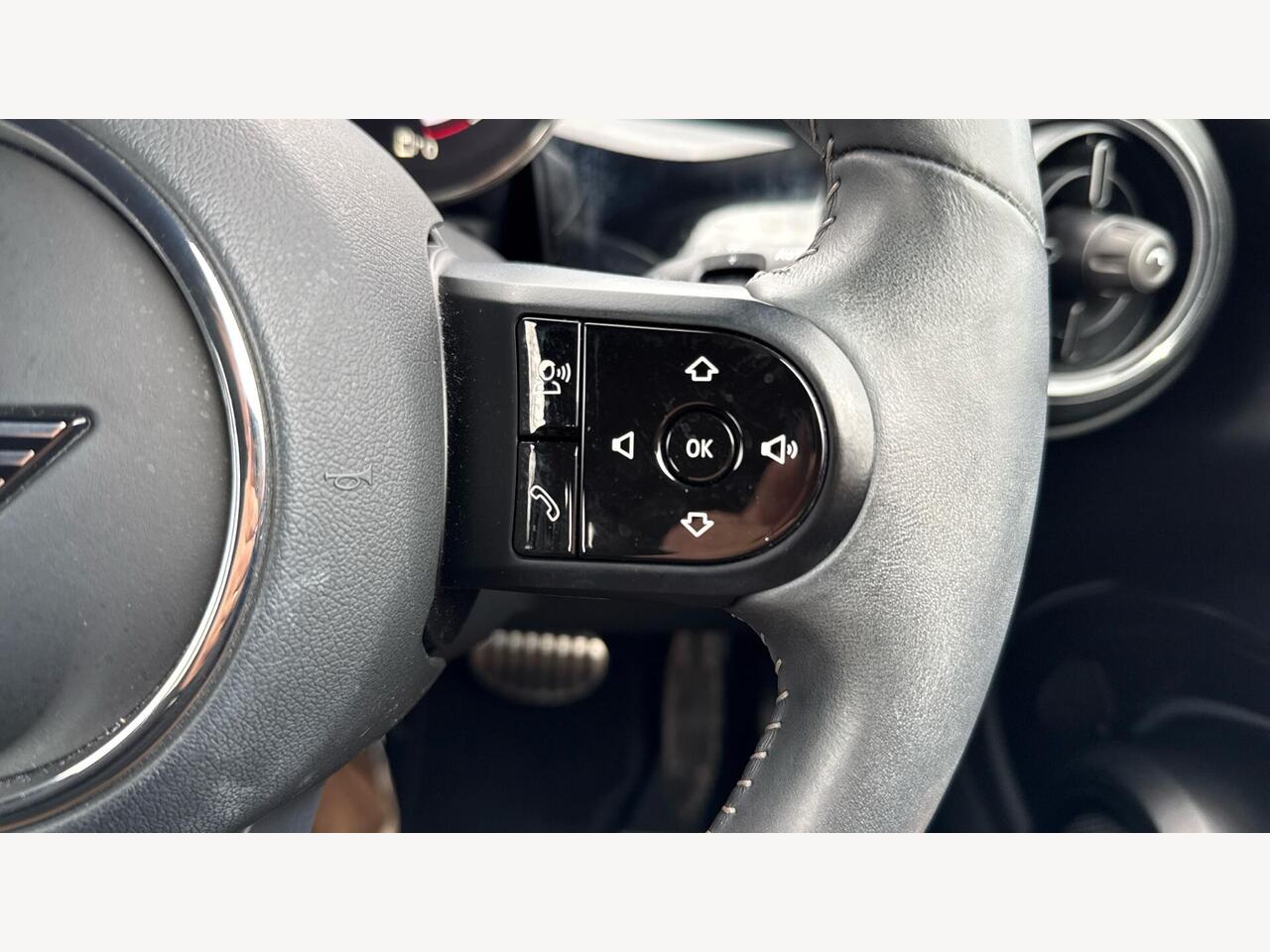 "3 spoke flat bottomed multi-function plus leather steering wheel with S badging, grips in preforated leather, contrast stitching and paddle shift",