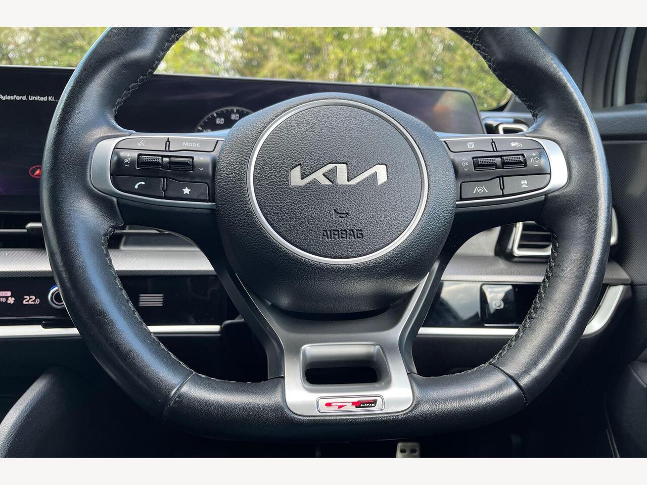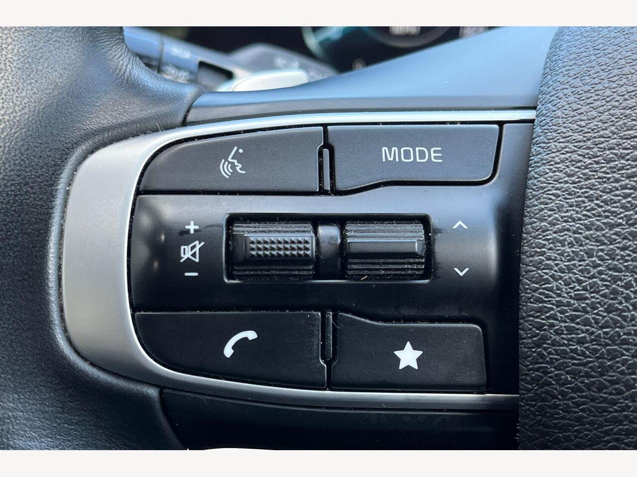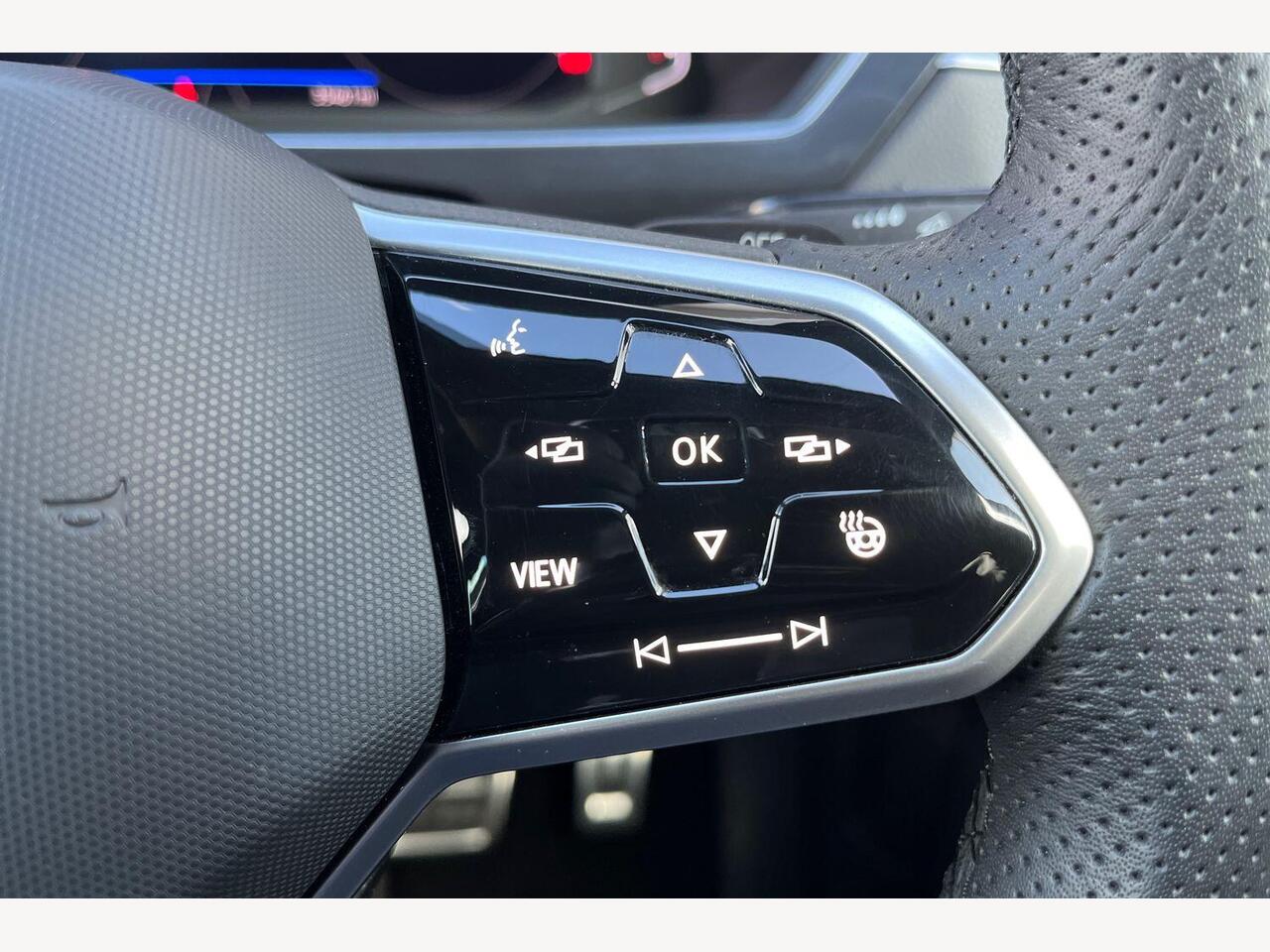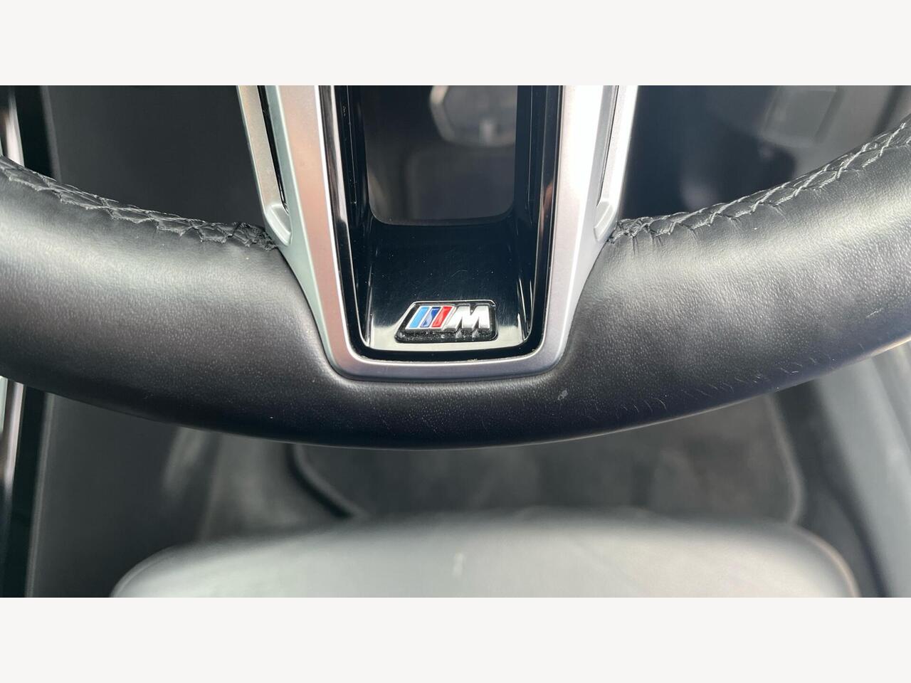 "3 spoke flat bottomed multi-function plus leather steering wheel with S badging, grips in preforated leather, contrast stitching and paddle shift",