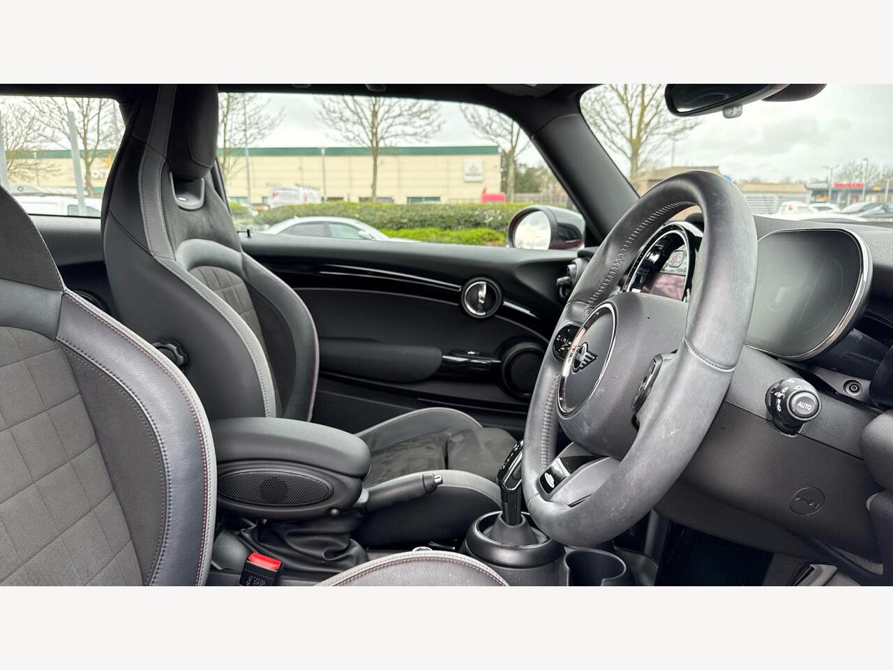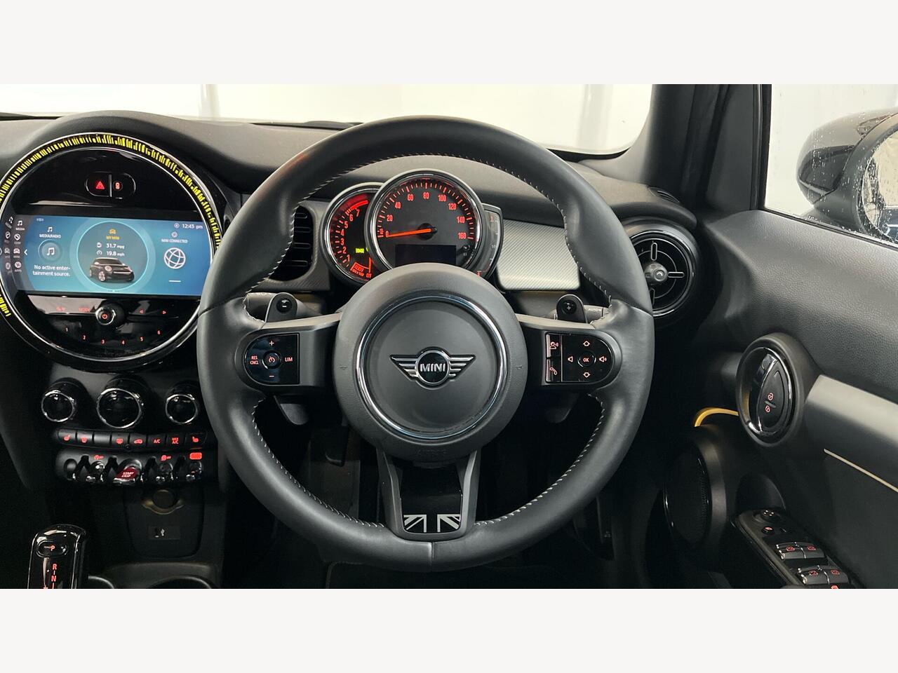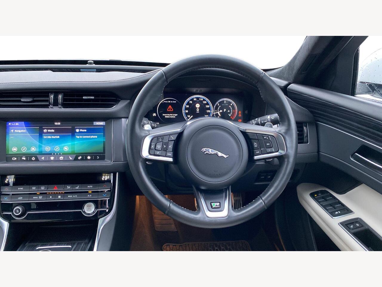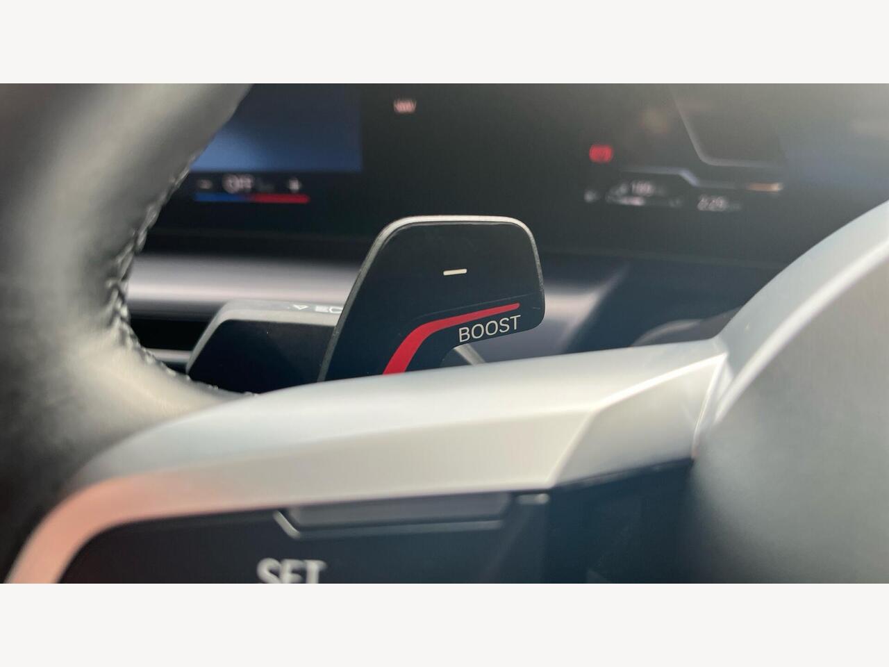 "3 spoke flat bottomed multi-function plus leather steering wheel with S badging, grips in preforated leather, contrast stitching and paddle shift",