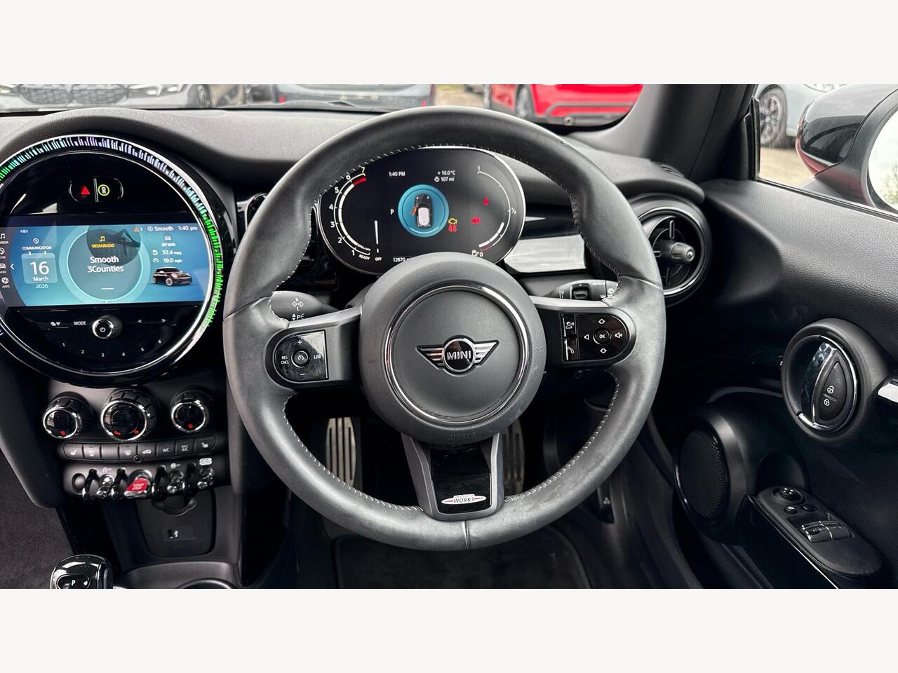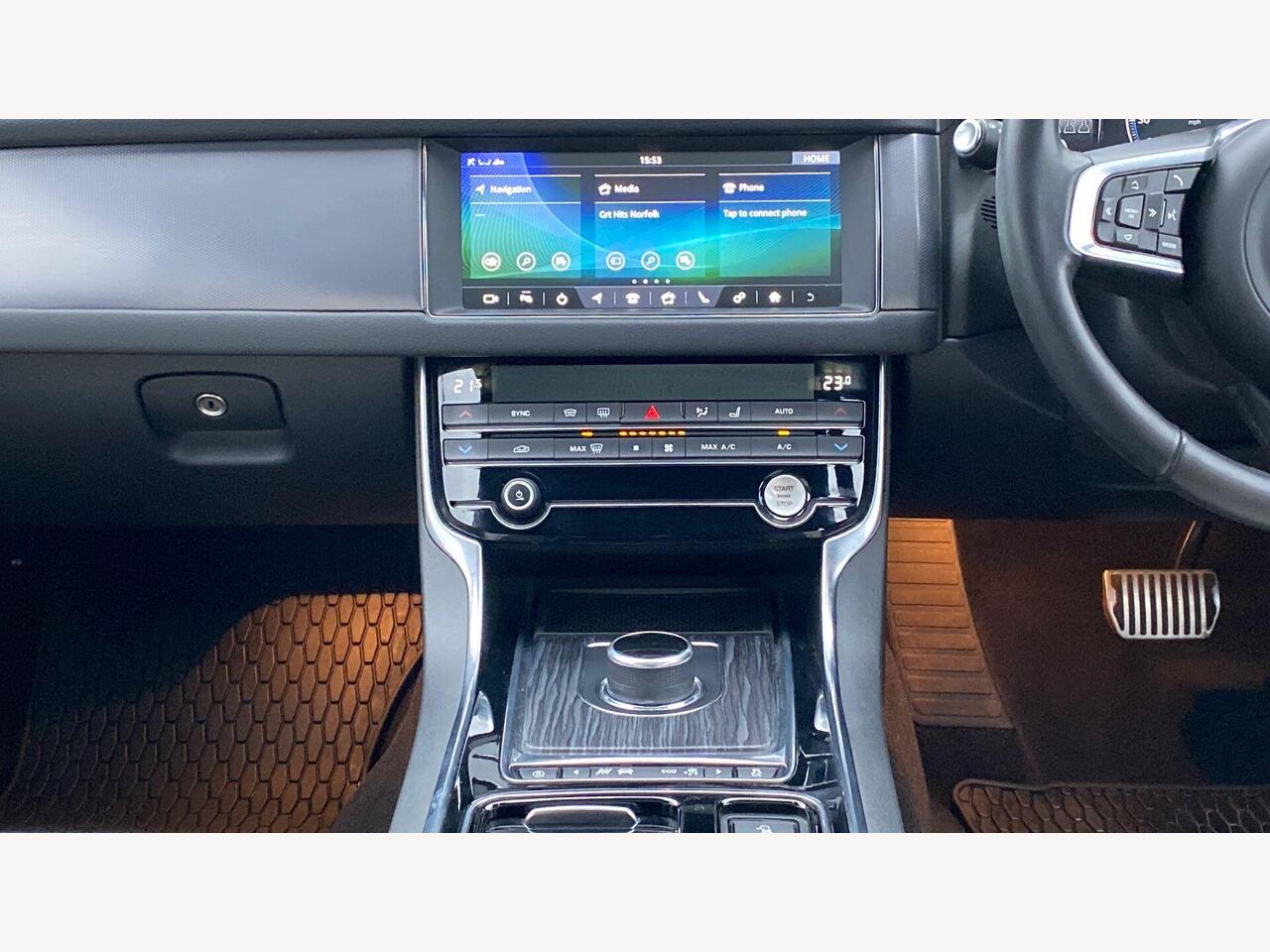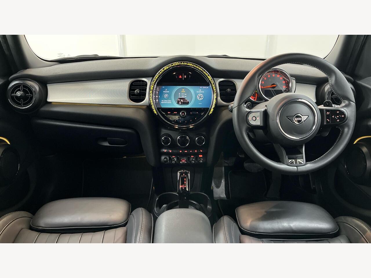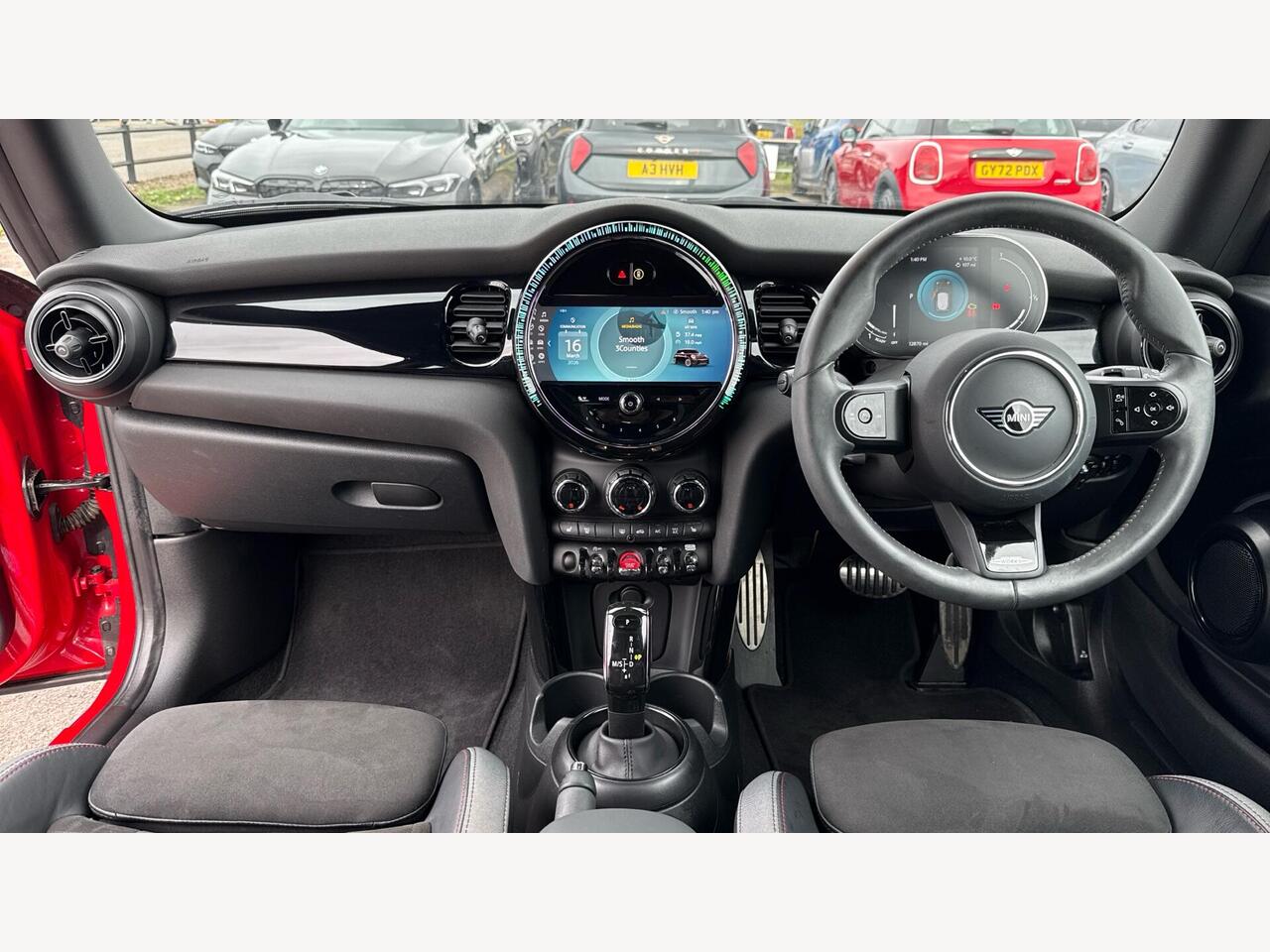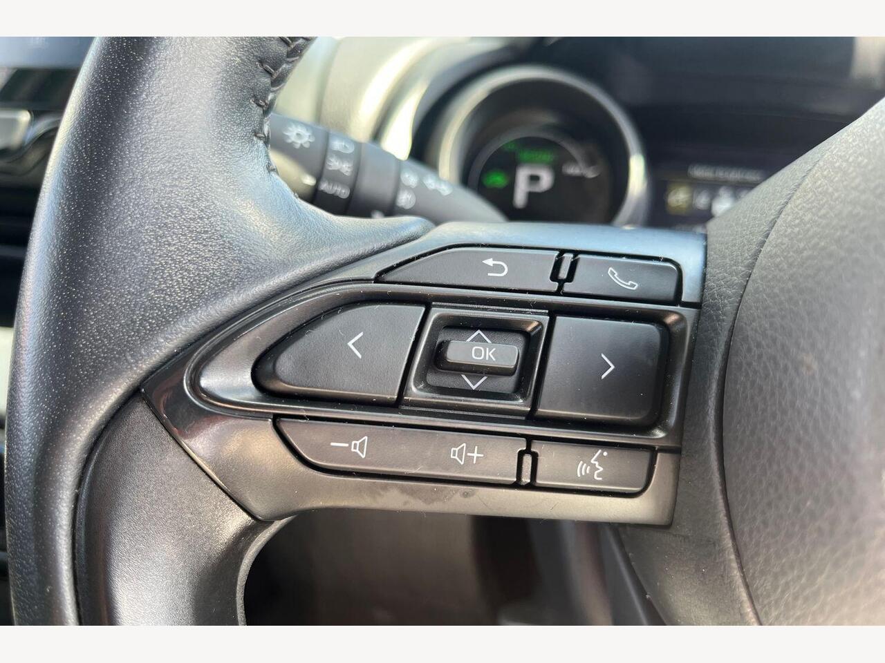"3 spoke flat bottomed multi-function plus leather steering wheel with S badging, grips in preforated leather, contrast stitching and paddle shift",