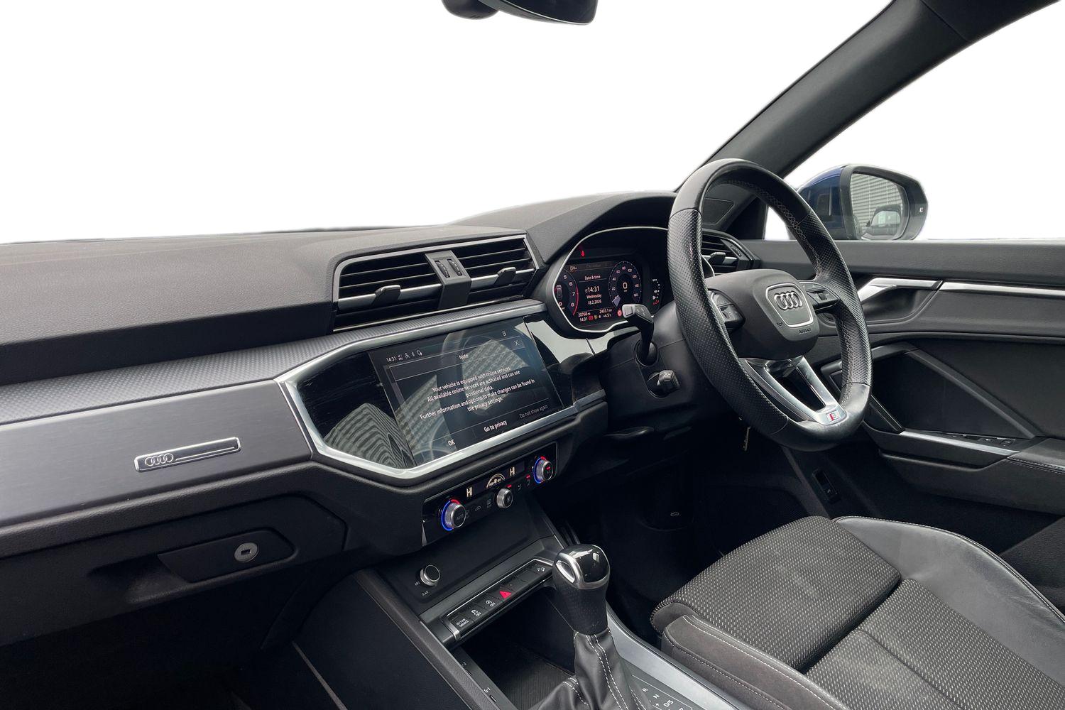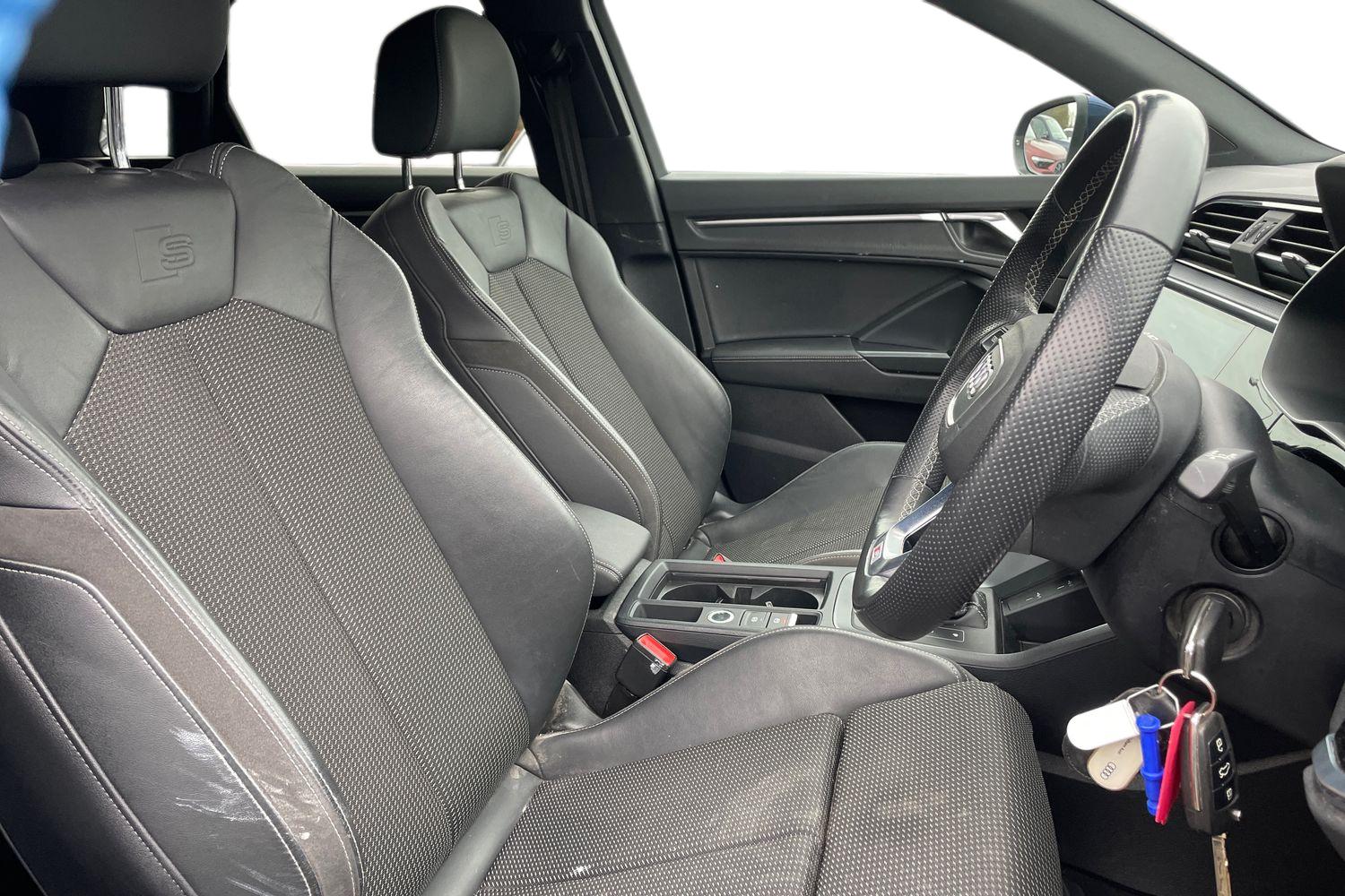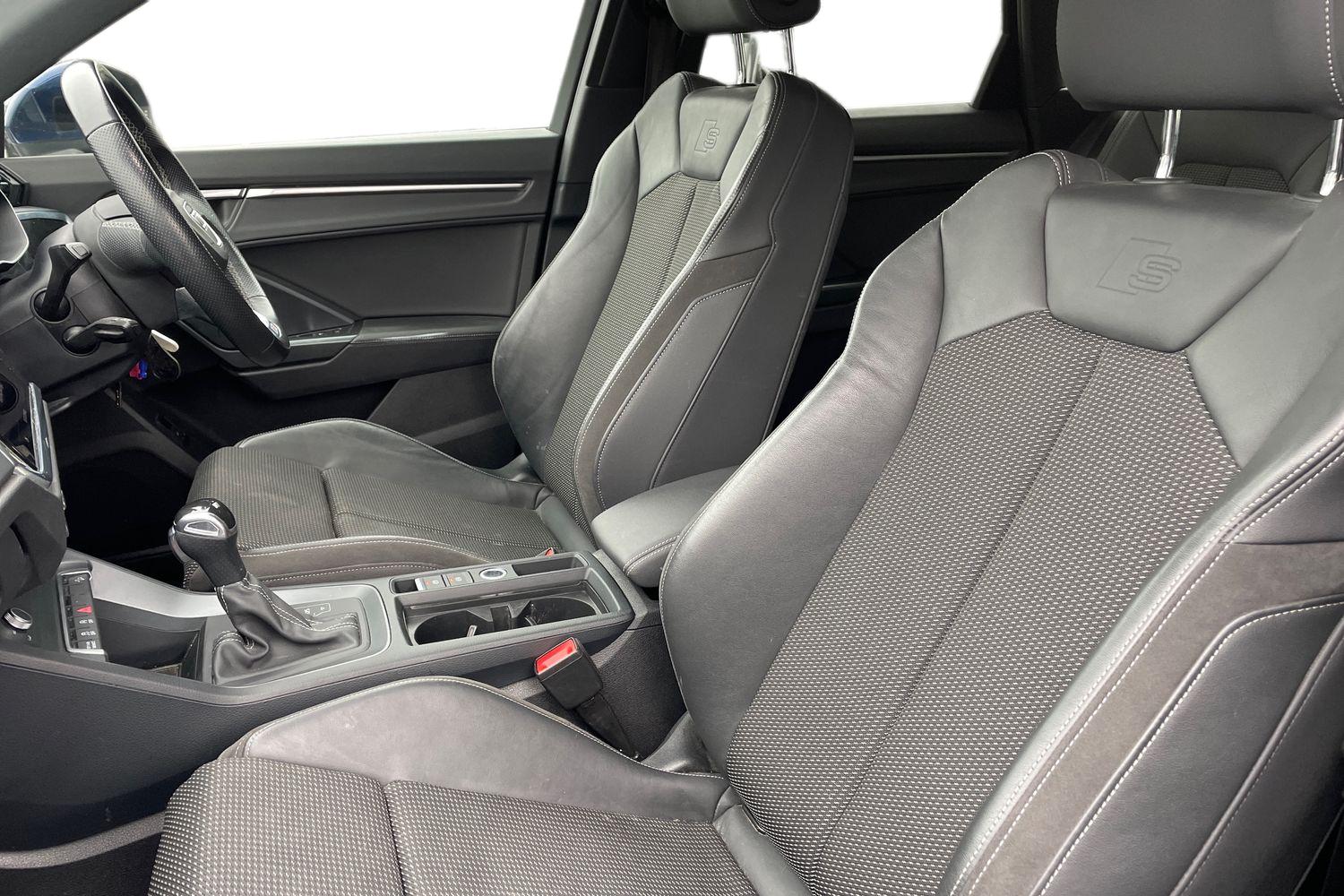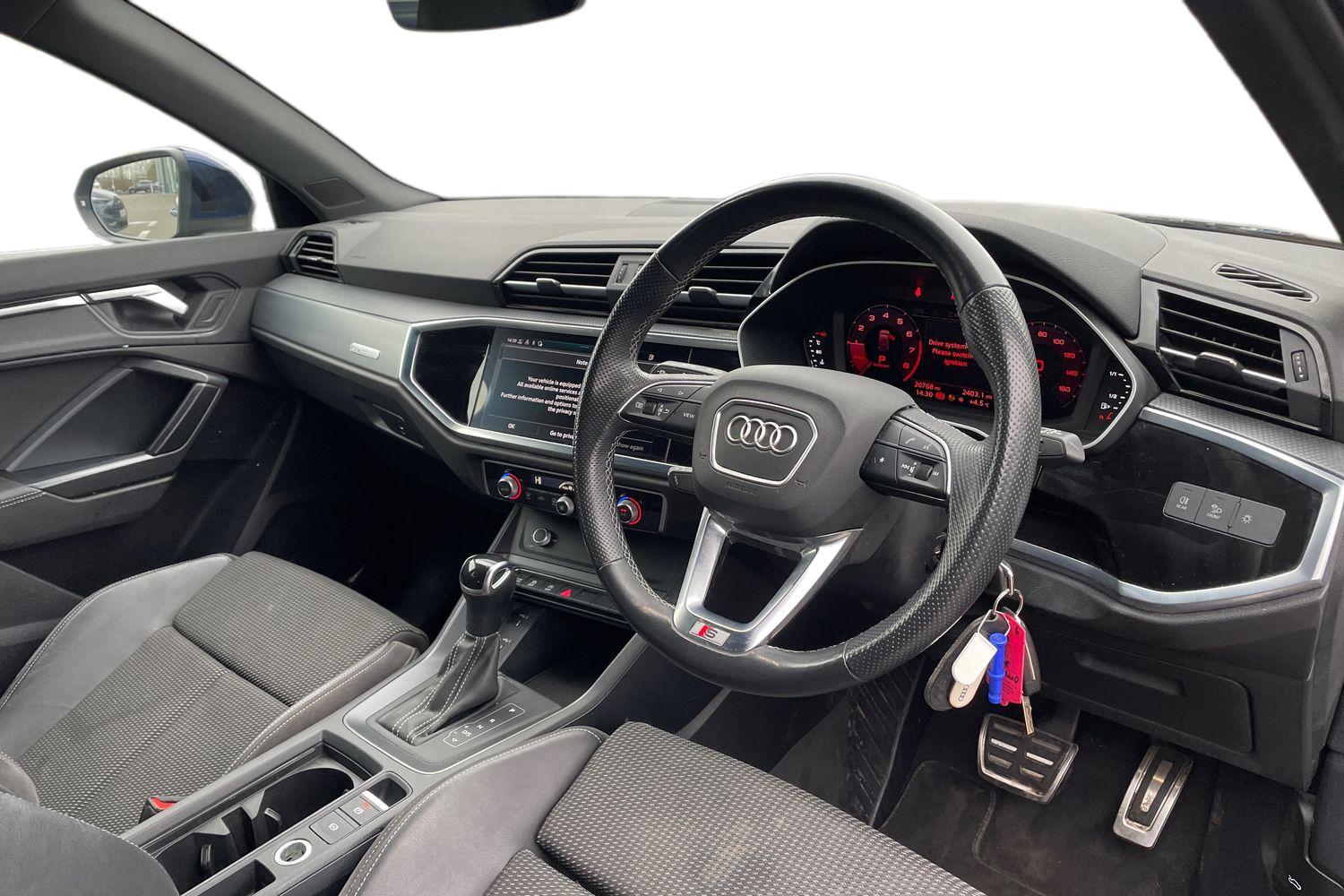 "features": "Audi connect safety and service (e-call), Audi drive select, Audi lane departure warning, Audi Virtual Cockpit - 10.25\" display, Bluetooth interface, Camera based traffic sign recognition, MMI Navigation Plus with high resolution 10.1 inch touchscreen colour display, Power operated tailgate, Progressive steering, Service interval indicator, Smartphone interface includes wireless Apple carplay/Android Auto, Start stop system with recuperation, Voice control system with natural language interaction, 48V Mild hybrid technology, Sports suspension, 2 USB-C ports with charge and data functions, 6 passive loudspeakers, DAB digital radio module, Acoustic windscreen, Aluminium roof rails, Aluminium window trim, Auto dimming frameless rear view mirror, Body coloured bumpers, Electrically folding, adjustable and heated door mirrors with integrated LED side indicators and kerb view function for passenger side, Front and rear electric windows, Front fog lights, Front side air inlets in matt platinum grey, Front spoiler blade in matt platinum grey, Grille vertical bars in aluminium silver/Matt, High gloss black finish B and C pillars, LED headlights with LED daytime running lights and dynamic rear indicator, LED rear lights, Privacy glass dark tinted rear and rear-side windows (from B-pillar backwards), Rain and light sensors, Rear diffuser strip in matt titanium black, S line badges on front wings, S Line front and rear bumpers, Side skirt insert in matt Platinium grey, Silver chrome grille surround, Titanium black radiator grille, 12V socket in rear centre console, 40:20:40 folding with manual adjustment for 60:40 forwards/backwards position and backrest angle, Adjustable rear seat bench/backrest with centre armrest and cupholder, Black cloth headlining, Dual zone electronic climate control, Front and rear black floor mats with contrast stitching in rock grey, Front and rear headrests, Front and rear roof module including reading lights, Front centre armrest, Glove compartment lighting, Height and reach adjustable steering wheel, Illuminated door sill trims with S logo, ISOFIX child seat mounting for front passenger with airbag deactivation and outer rear seat including top tether attachment point for outer rear seats, Luggage compartment light, Manual front seats with height adjustment, Perforated leather gearknob, Stainless steel luggage compartment sill finisher, Stainless steel pedals, Non smoking pack - Q3, 3x3 point rear seatbelts, 6 airbags - Driver, front passenger, curtain and side windows, Audi pre-sense front with pedestrain and cyclist recognition, Electrically operated child locks on rear doors, Electromechanical parking brake, Electronic stabilisation control including ABS, ASR and EDL, Hill descent control, Hill hold assist, Pre sense basic, Seatbelt monitoring, Tyre pressure warning, Warning triangle and first aid kit, Anti theft alarm, Anti theft wheel bolts, Remote central locking, Dark matt brushed aluminium inlay, Detail dashboard around MMI touch colour display in glass look, black with surround in aluminium look, Leatherette door armrest, Tool kit, Tyre repair kit, ",