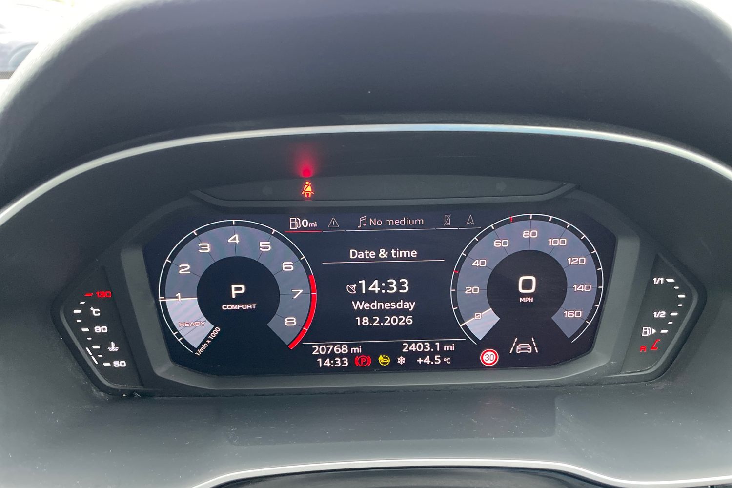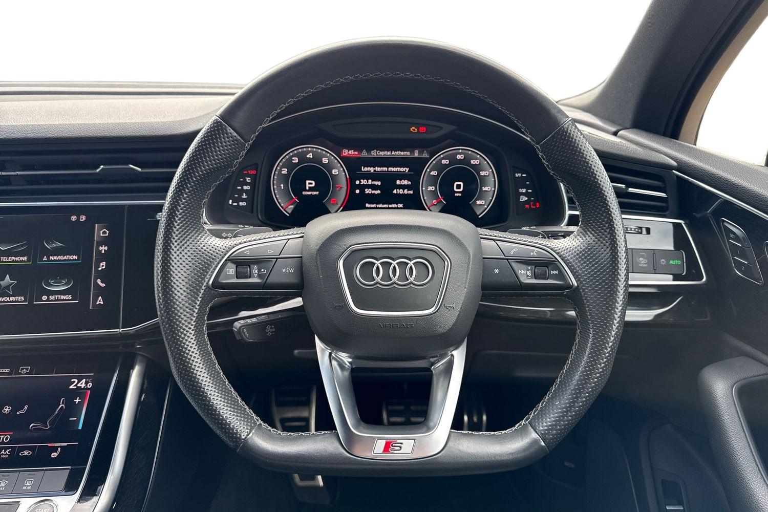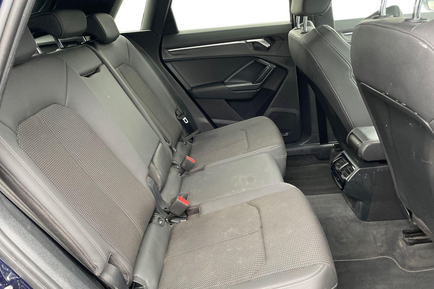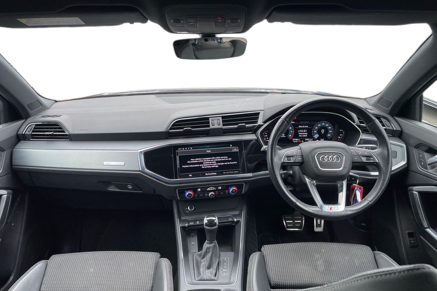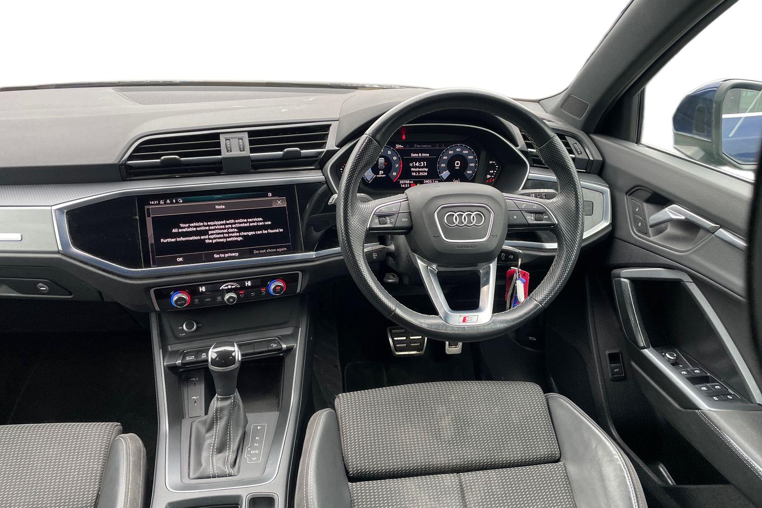 "features": "Audi connect safety and service (e-call), Audi drive select, Audi lane departure warning, Audi Virtual Cockpit - 10.25\" display, Bluetooth interface, Camera based traffic sign recognition, MMI Navigation Plus with high resolution 10.1 inch touchscreen colour display, Power operated tailgate, Progressive steering, Service interval indicator, Smartphone interface includes wireless Apple carplay/Android Auto, Start stop system with recuperation, Voice control system with natural language interaction, 48V Mild hybrid technology, Sports suspension, 2 USB-C ports with charge and data functions, 6 passive loudspeakers, DAB digital radio module, Acoustic windscreen, Aluminium roof rails, Aluminium window trim, Auto dimming frameless rear view mirror, Body coloured bumpers, Electrically folding, adjustable and heated door mirrors with integrated LED side indicators and kerb view function for passenger side, Front and rear electric windows, Front fog lights, Front side air inlets in matt platinum grey, Front spoiler blade in matt platinum grey, Grille vertical bars in aluminium silver/Matt, High gloss black finish B and C pillars, LED headlights with LED daytime running lights and dynamic rear indicator, LED rear lights, Privacy glass dark tinted rear and rear-side windows (from B-pillar backwards), Rain and light sensors, Rear diffuser strip in matt titanium black, S line badges on front wings, S Line front and rear bumpers, Side skirt insert in matt Platinium grey, Silver chrome grille surround, Titanium black radiator grille, 12V socket in rear centre console, 40:20:40 folding with manual adjustment for 60:40 forwards/backwards position and backrest angle, Adjustable rear seat bench/backrest with centre armrest and cupholder, Black cloth headlining, Dual zone electronic climate control, Front and rear black floor mats with contrast stitching in rock grey, Front and rear headrests, Front and rear roof module including reading lights, Front centre armrest, Glove compartment lighting, Height and reach adjustable steering wheel, Illuminated door sill trims with S logo, ISOFIX child seat mounting for front passenger with airbag deactivation and outer rear seat including top tether attachment point for outer rear seats, Luggage compartment light, Manual front seats with height adjustment, Perforated leather gearknob, Stainless steel luggage compartment sill finisher, Stainless steel pedals, Non smoking pack - Q3, 3x3 point rear seatbelts, 6 airbags - Driver, front passenger, curtain and side windows, Audi pre-sense front with pedestrain and cyclist recognition, Electrically operated child locks on rear doors, Electromechanical parking brake, Electronic stabilisation control including ABS, ASR and EDL, Hill descent control, Hill hold assist, Pre sense basic, Seatbelt monitoring, Tyre pressure warning, Warning triangle and first aid kit, Anti theft alarm, Anti theft wheel bolts, Remote central locking, Dark matt brushed aluminium inlay, Detail dashboard around MMI touch colour display in glass look, black with surround in aluminium look, Leatherette door armrest, Tool kit, Tyre repair kit, ",