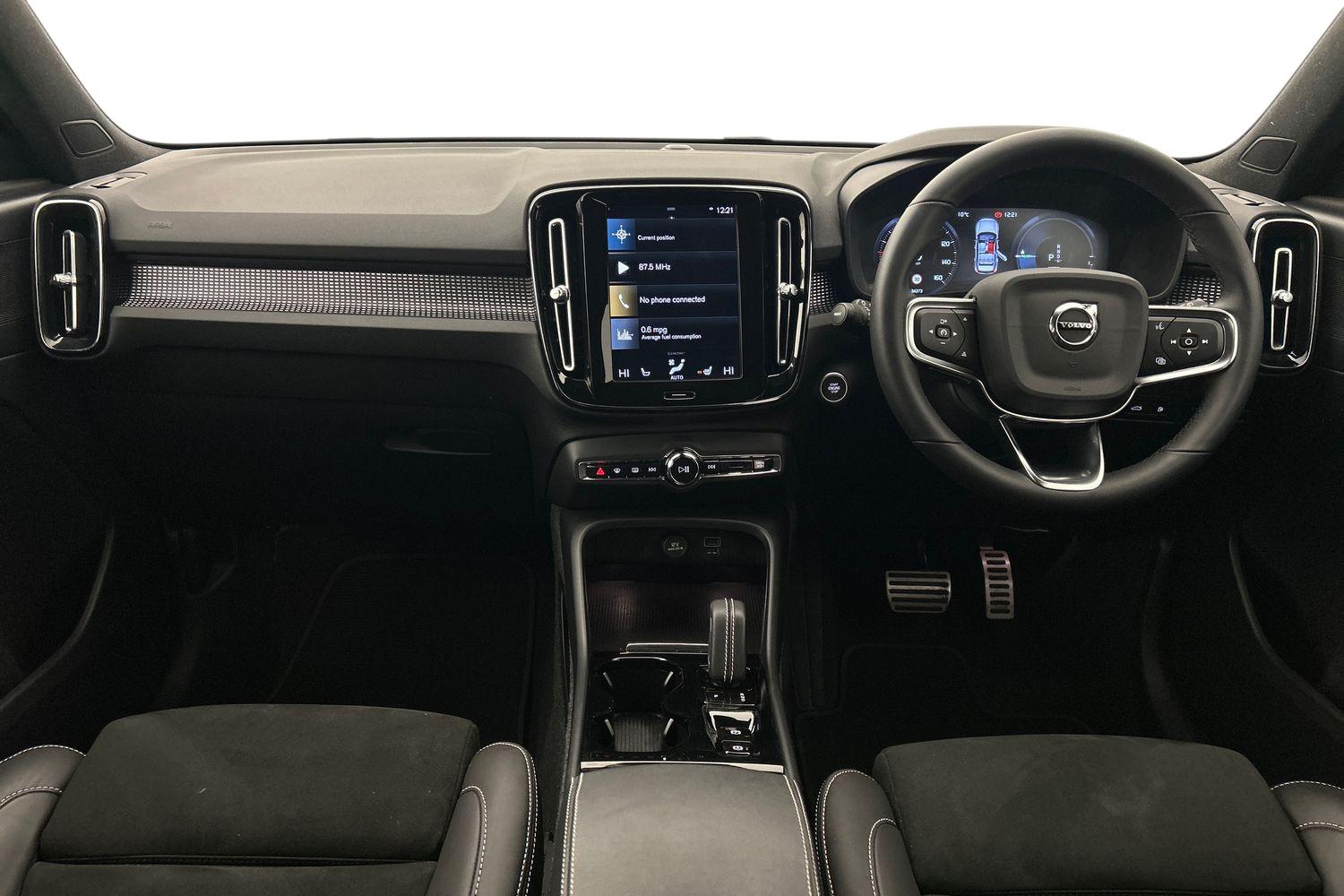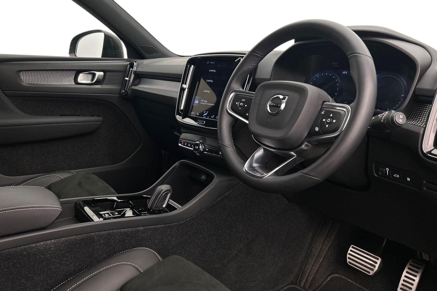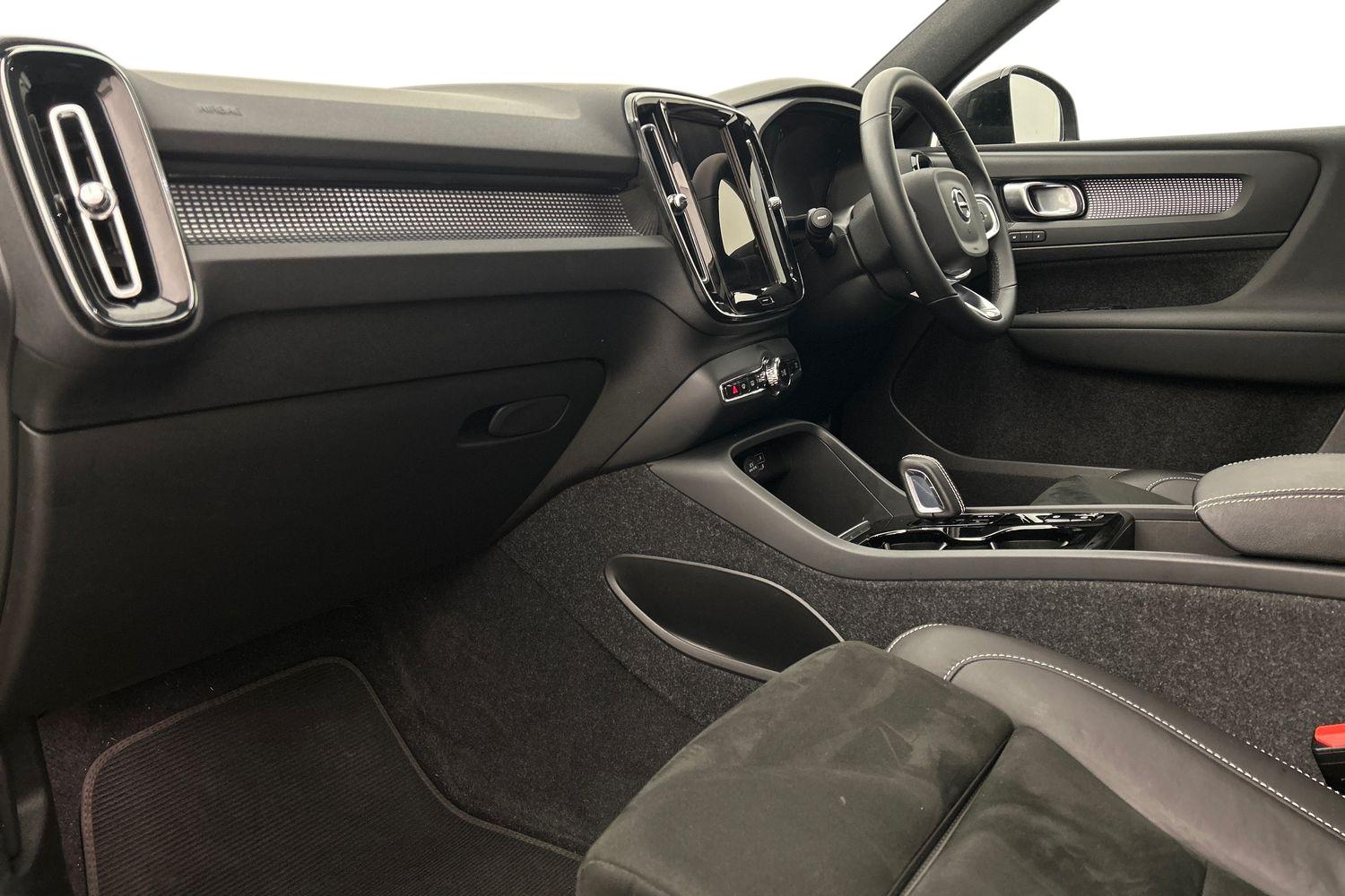 "features": "12.3\" Active TFT crystal driver's instrument display, 9\" centre console portrait touch screen, Adjustable steering wheel force, Bluetooth hands free telephone kit, Drive mode selector, E-call, Lane keep assist with driver alert control, Oncoming Lane Mitigation, Power operated tailgate, Sensus navigation with European mapping and traffic information, Speed limiter, Speed sensitive steering, Voice activated control for key functions, Volvo on call, 7m 10amp charge cable with 3 pin plug and 7m 1 phase 16amp type 2/mode 3 charge cable, Electric front axle drive, Recharging port located in nearside front wing, Sports chassis, DAB Digital radio, Low speed exterior sound speaker, Steering wheel mounted remote controls, Adaptive brake lights with high level LED brake lights, Auto dimming interior mirror, Automatic headlamp levelling, Automatic LED Headlights + Active high beam incorporating daytime running lights, Dark tinted windows for rear door side windows and cargo compartment, Electric adjustable/heated/auto folding door mirrors, Front aluminium tread plates, Front and rear electric windows, Heated front windscreen, High gloss black front and rear skid plate, High gloss black lower front bumper, High gloss black mesh front grille with high gloss black surround, High gloss black sensus surround deco, High gloss black window trim, Home safe and approach lighting, Integrated roof rails in high gloss black, Rain sensor with automatic windscreen wiper activation, Rear side wing doors, Rear wiper, Roof antenna, Roof spoiler, Visible VIN plate, 12V socket in front tunnel console and luggage compartment, 2 zone electronic climate control and rear air vent, 3 seat bench in 2nd row, 60/40 versatile split folding rear seat, A-pillar parking ticket holder, Bright metal luggage threshold, Centre console cupholders and storage, Charcoal headlining, Front footwell illumination, Front headrests, Front reading light and theatre lighting, Front seat cushion extensions, Glovebox bag hook, Heated front seats, Height/reach adjustable steering column, Height/tilt adjustable driver's seat, High gloss centre tunnel deco, Illuminated glovebox, Illuminated luggage compartment, Illuminated vanity mirrors, Isofix attachments on outer rear seats, Leather gearknob, Load protection net, Multi directional lumbar support, Power driver seat with memory + exterior mirrors memory, Rear armrest / integral cup holders / storage tray, Rear coat hook, Single front passenger seat, Sports floor mats, Sports pedals, Sports tailored steering wheel, Underfloor cargo storage, Vanity mirror with ticket holder, Lighting pack - XC40, 3x3 point rear seatbelts, City safety includes pedestrian, cyclist and large animal detection and front collision warning with full auto brake, Drivers knee airbag, Dual stage driver/passenger airbags, Electronic parking brake with auto hold, First aid kit, Front and outer rear seatbelt reminder and pretensioners, Front seats SIPS airbags, Hill descent control, Hill start assist, Inflatable curtain, Passenger airbag cut-off device, Road sign information display, Run off Road Mitigation, Run off Road Protection, SIPS (Side Impact Protection System), Slippery road and hazard light alert, Stability and Traction Control with Spin control, Engine Drag Control and Corner Traction Control, Tyre pressure monitoring system, Vehicle deceleration control with Anti-lock Brake System, Electronic Brake Distribution and Emergency Brake Assist, Warning triangle, WHIPS whiplash protection system - front, Anti-theft alarm including immobiliser/volume sensor + level sensor, Care key with user defined top speed, Key integrated remote control central locking + fuel flap with deadlocking system and auto open/close power windows, Locking wheel nuts, Private locking for tailgate, Cutting edge aluminium inlay, Lower dashboard, tunnel console and door panel in charcoal, 20'' 5 double spoke diamond cut/high gloss black alloy wheels, ",