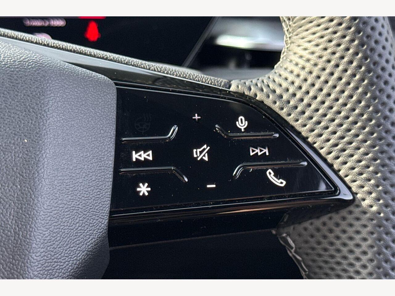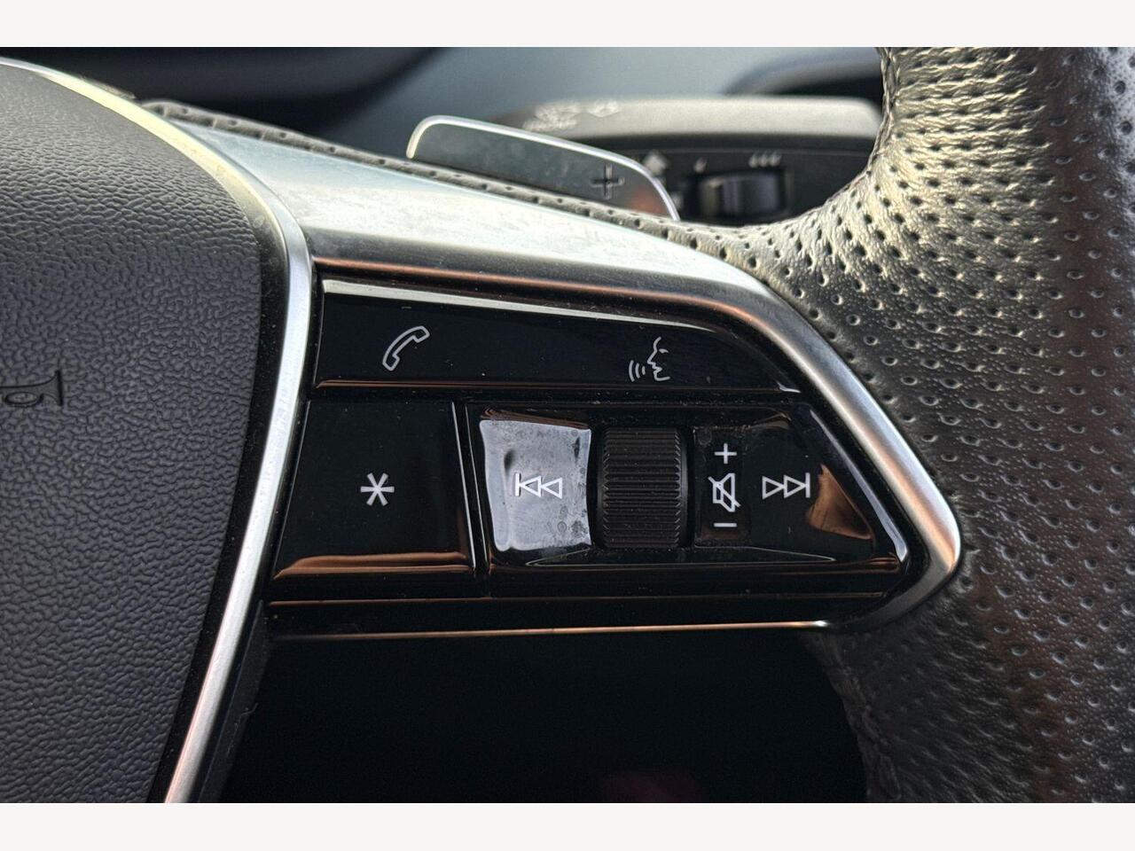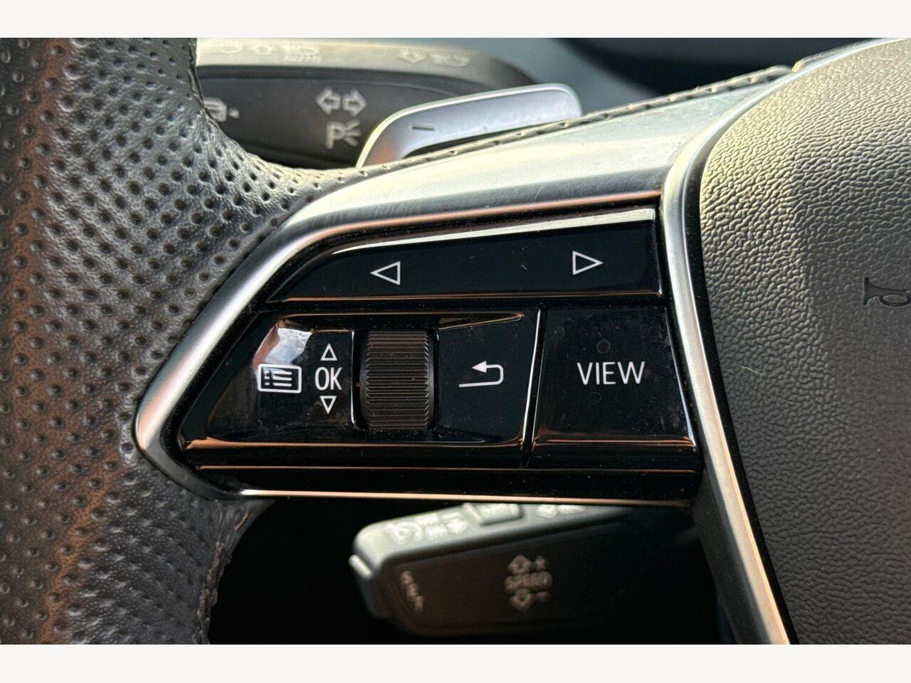"3 spoke leather sports multifunction steering wheel and silver stitching with gear shift paddles",