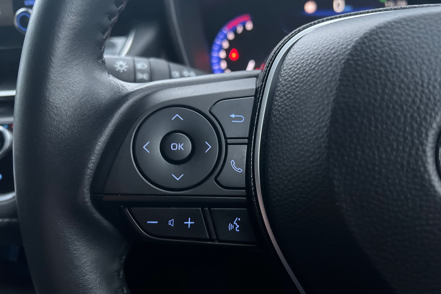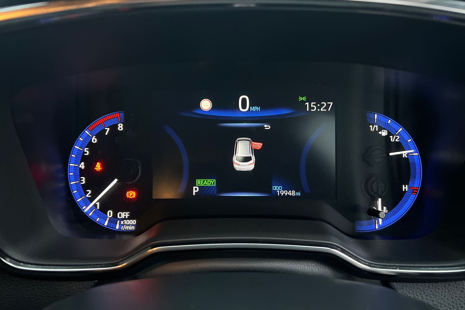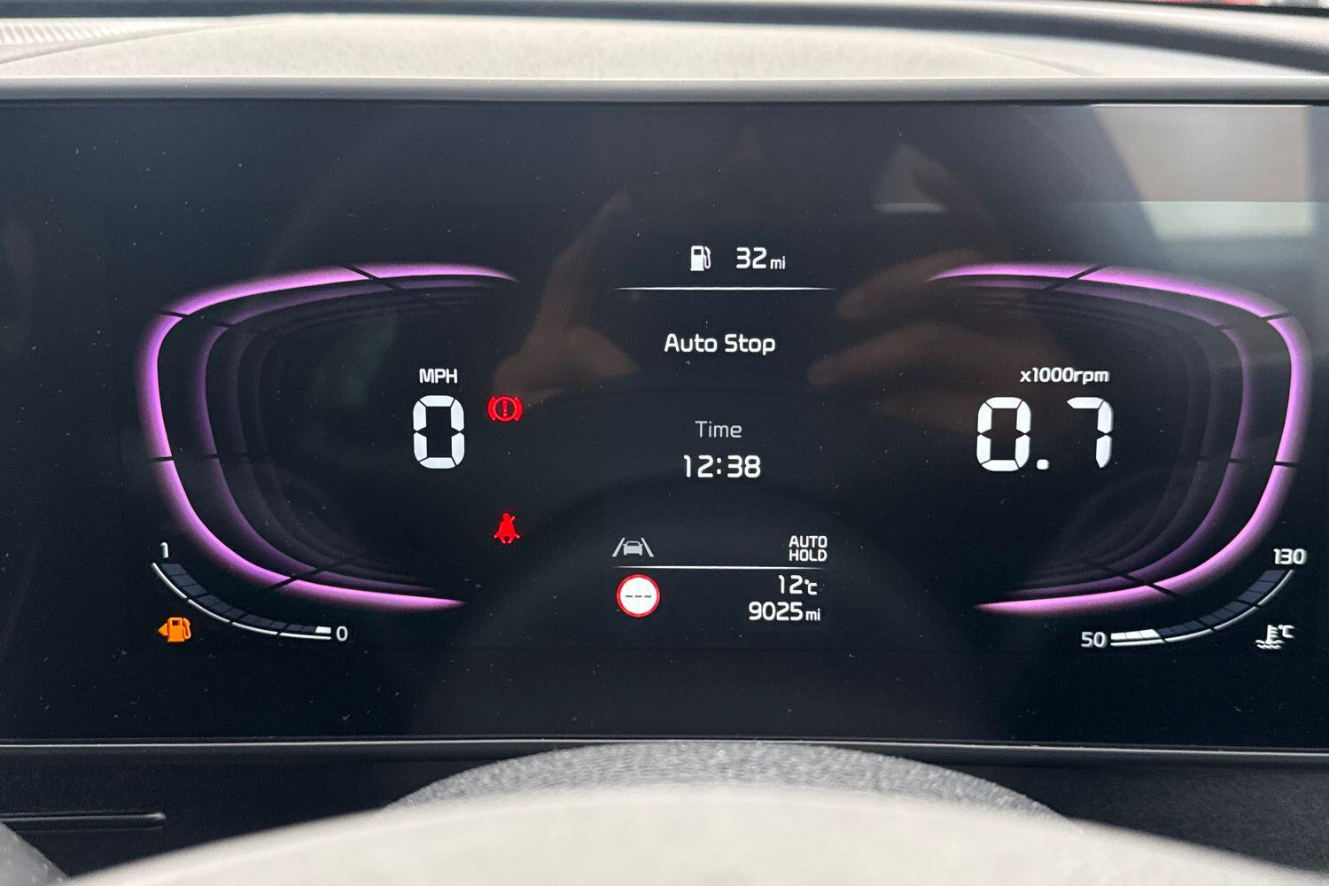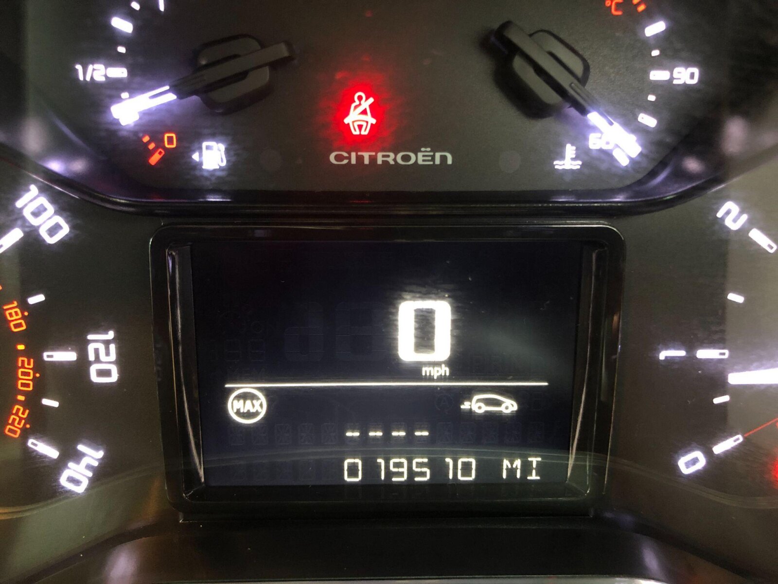 "Instrument cluster with speedometer with miles per hour read out, tachometer and fuel gauge",