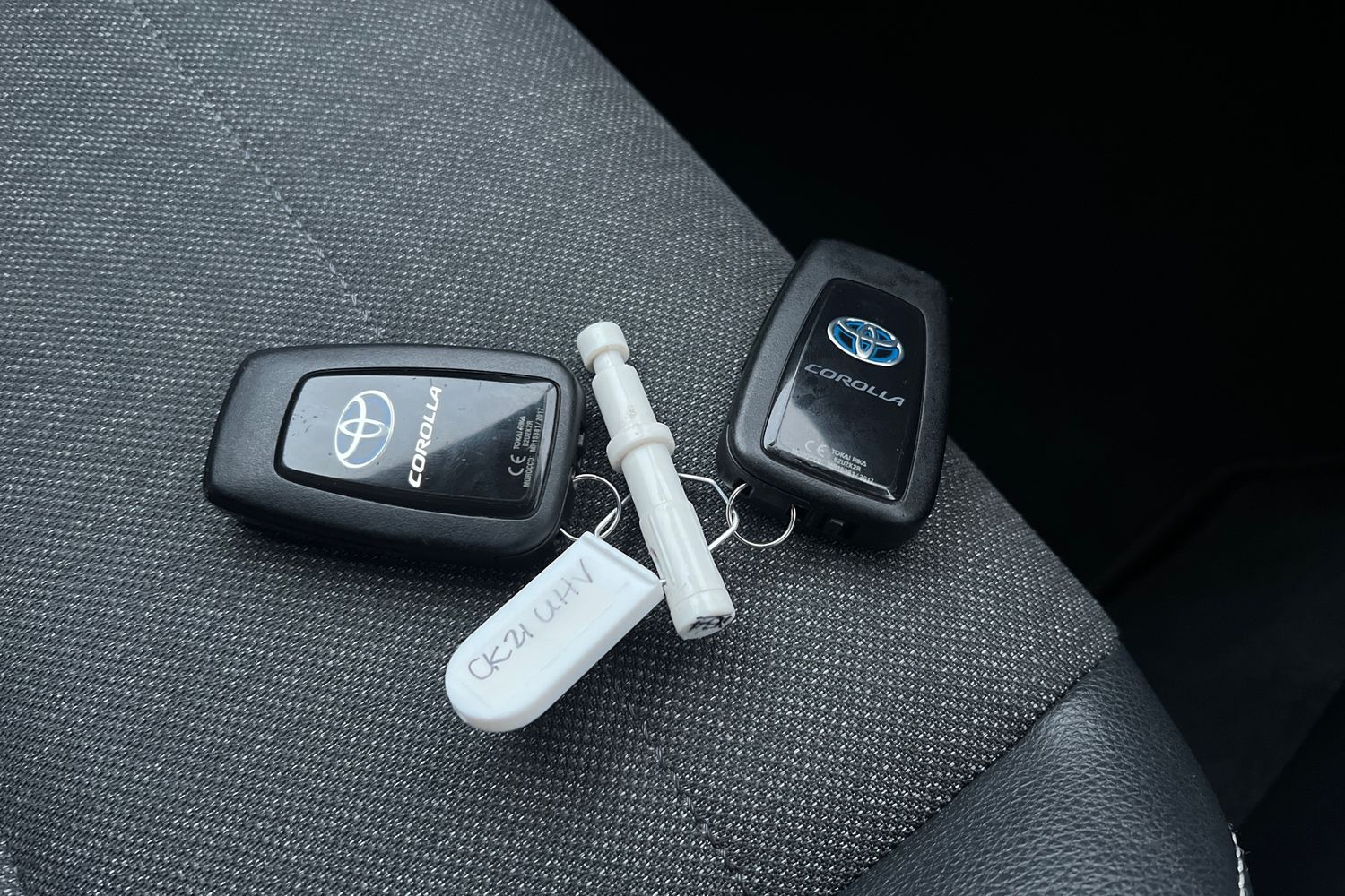 "Remote control including integrated key with blue insert",