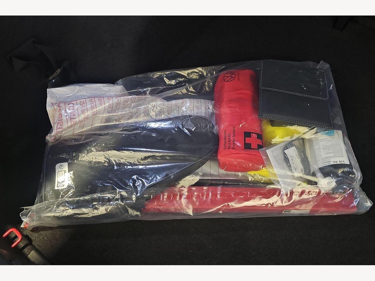 "First aid kit with warning triangle and safety vest",