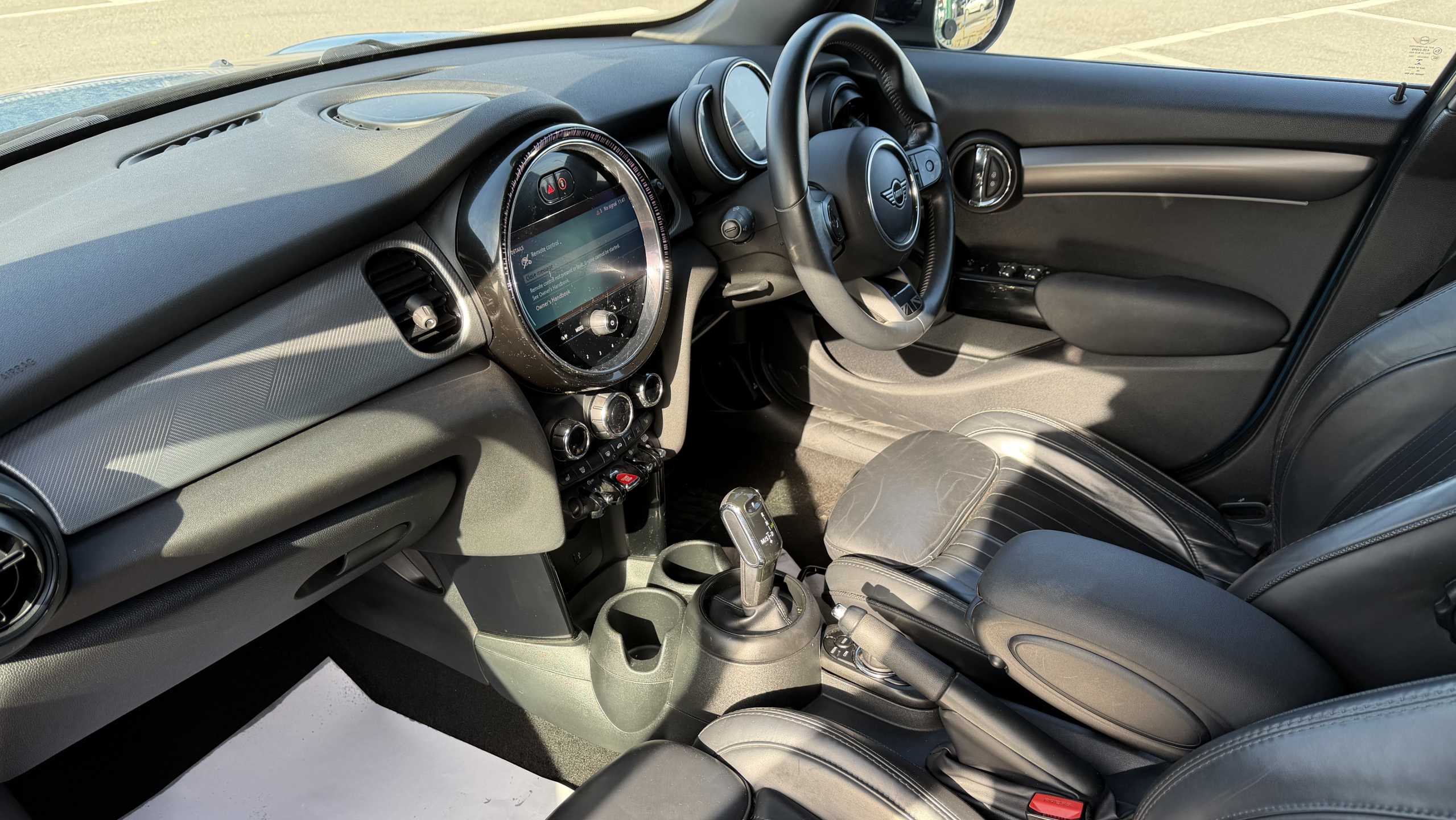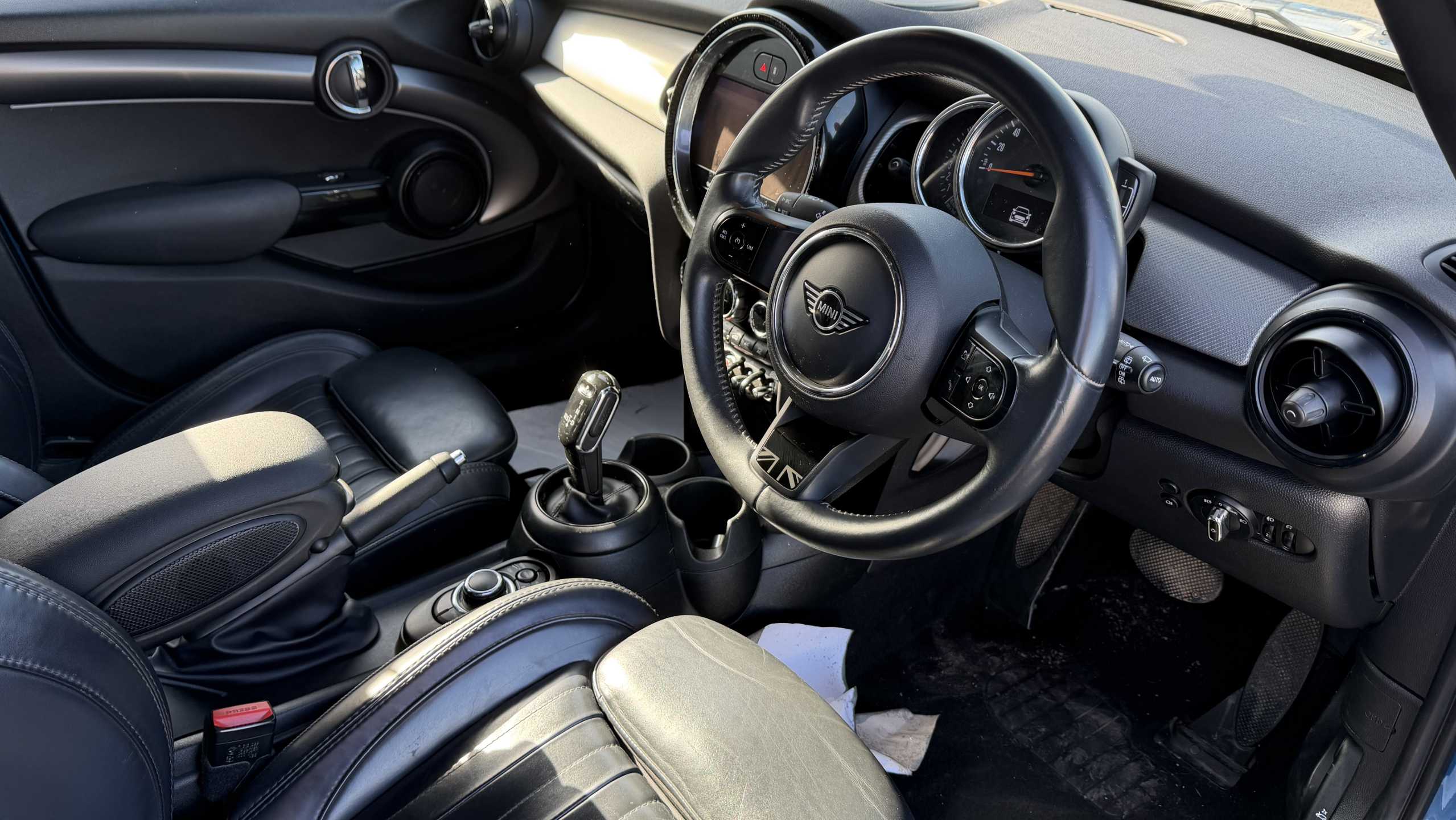 "Flat bottomed leather steering wheel in sensico with red stitching",