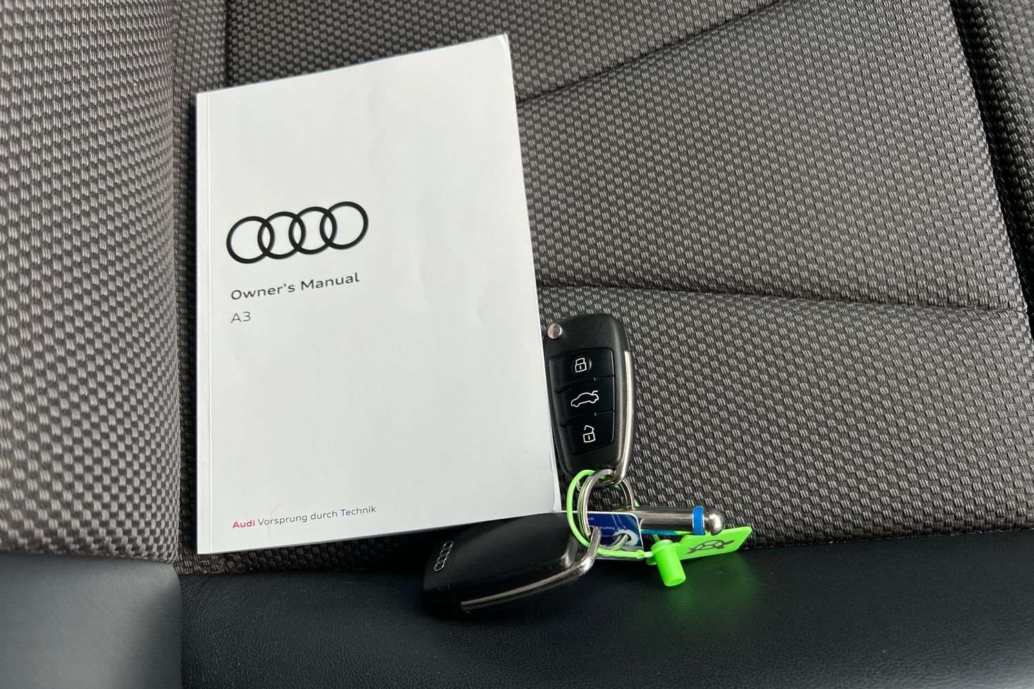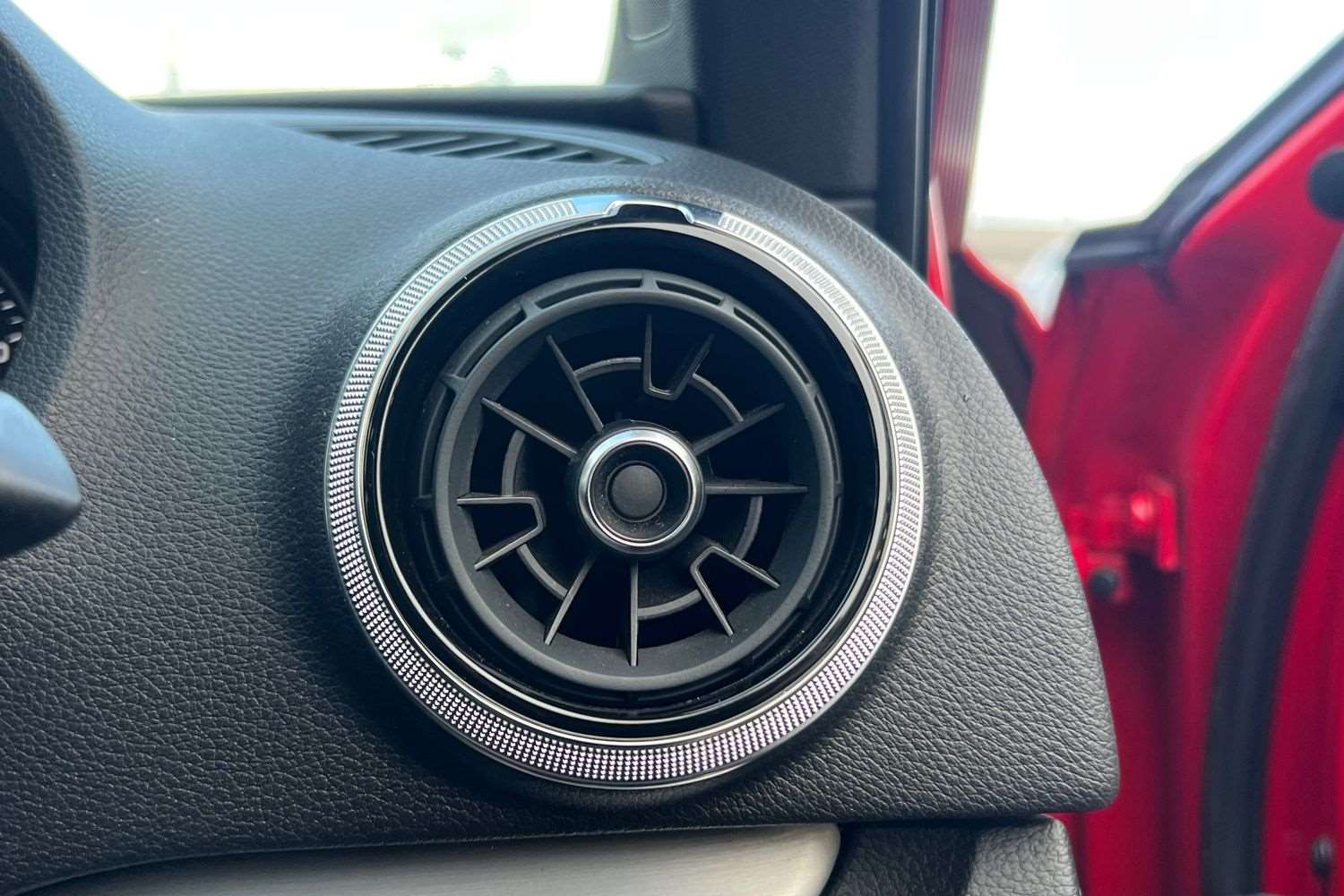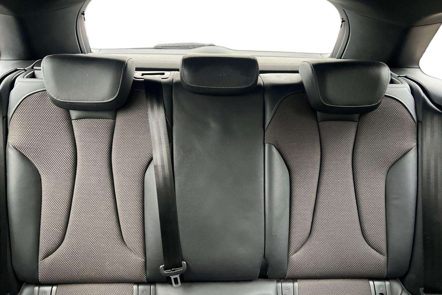 "Partial premium touch sensico leather upholstery with black cloth inserts and red stitching",