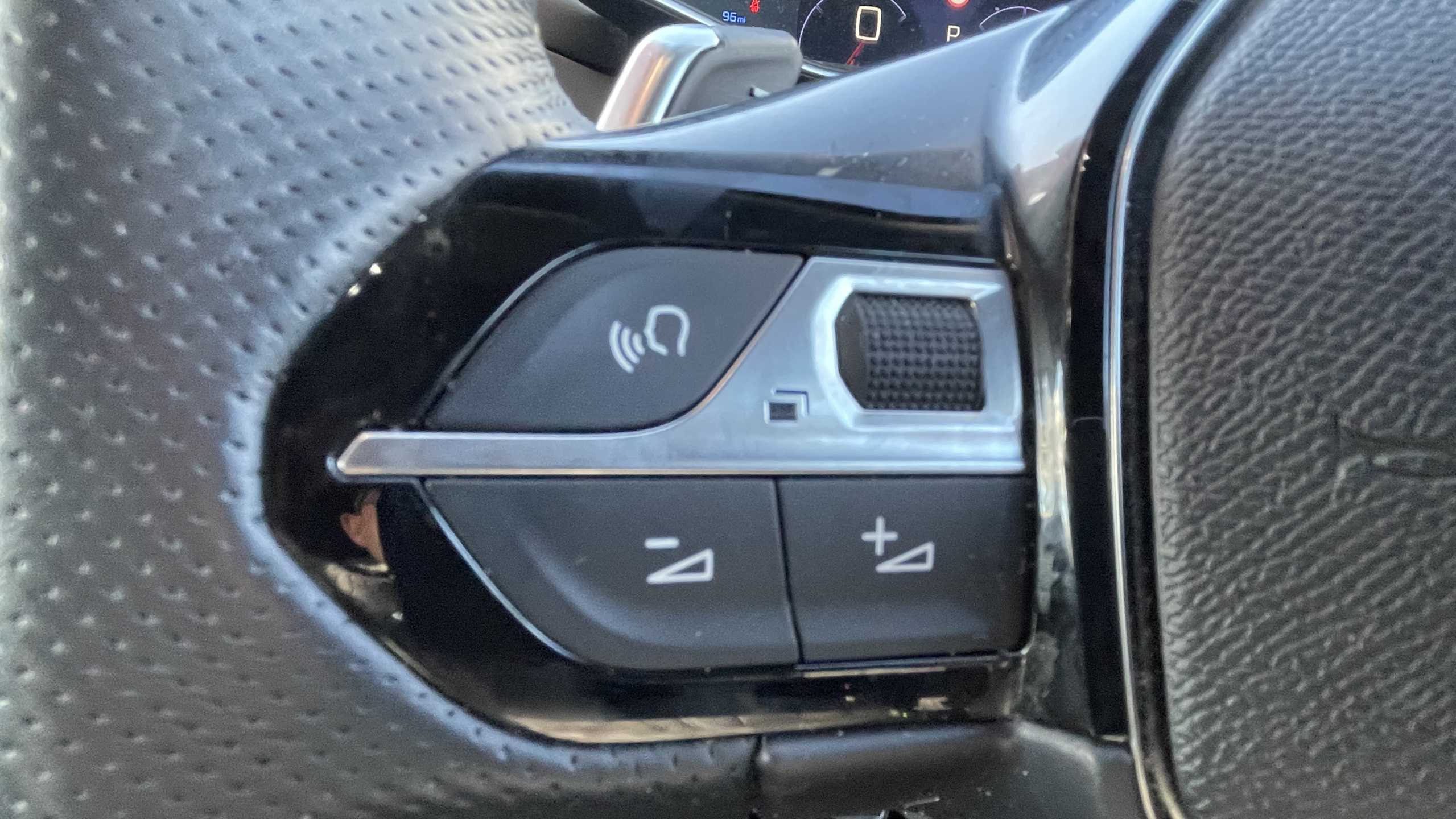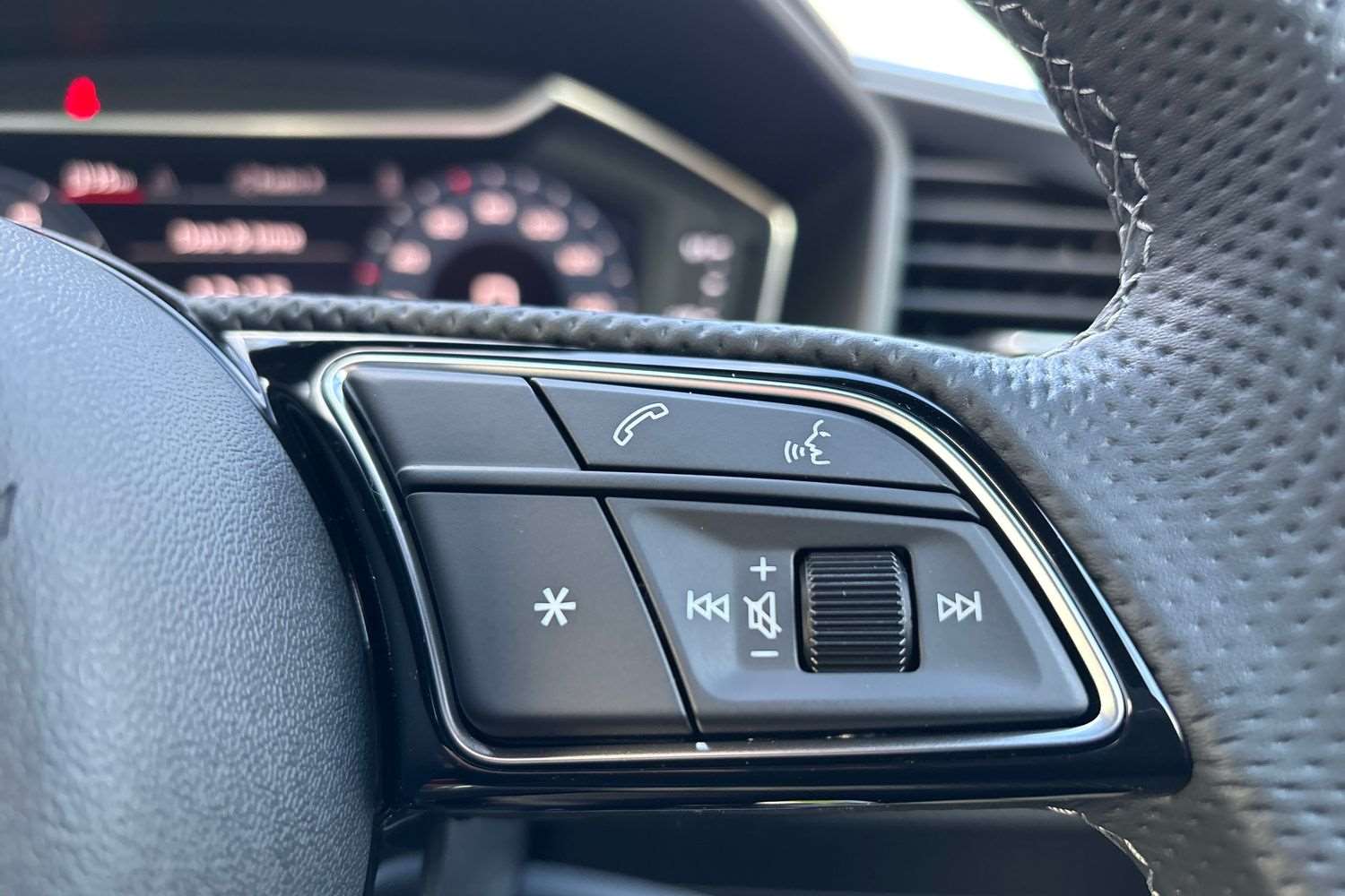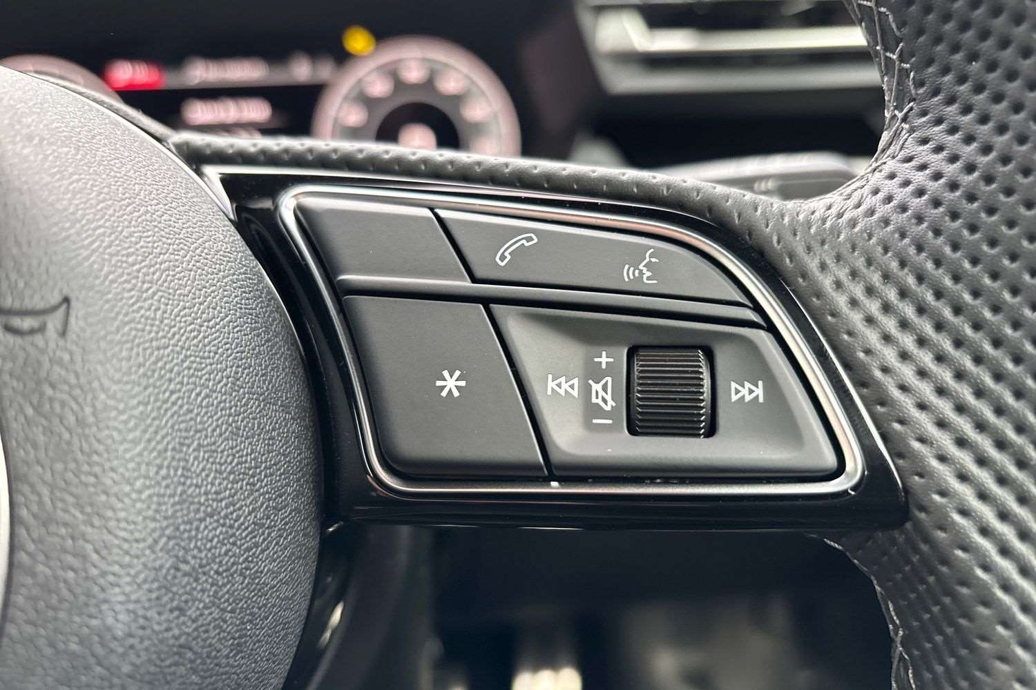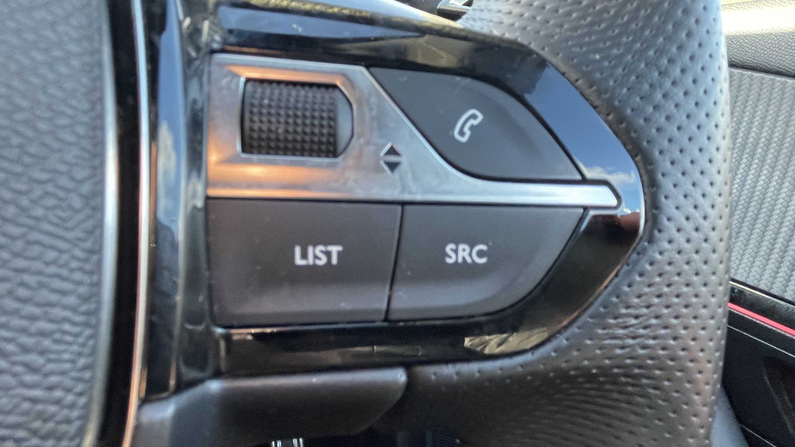 "Leather steering wheel with gloss black + satin chrome elements and audio/telephone controls",